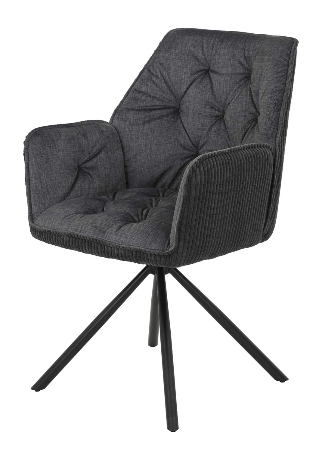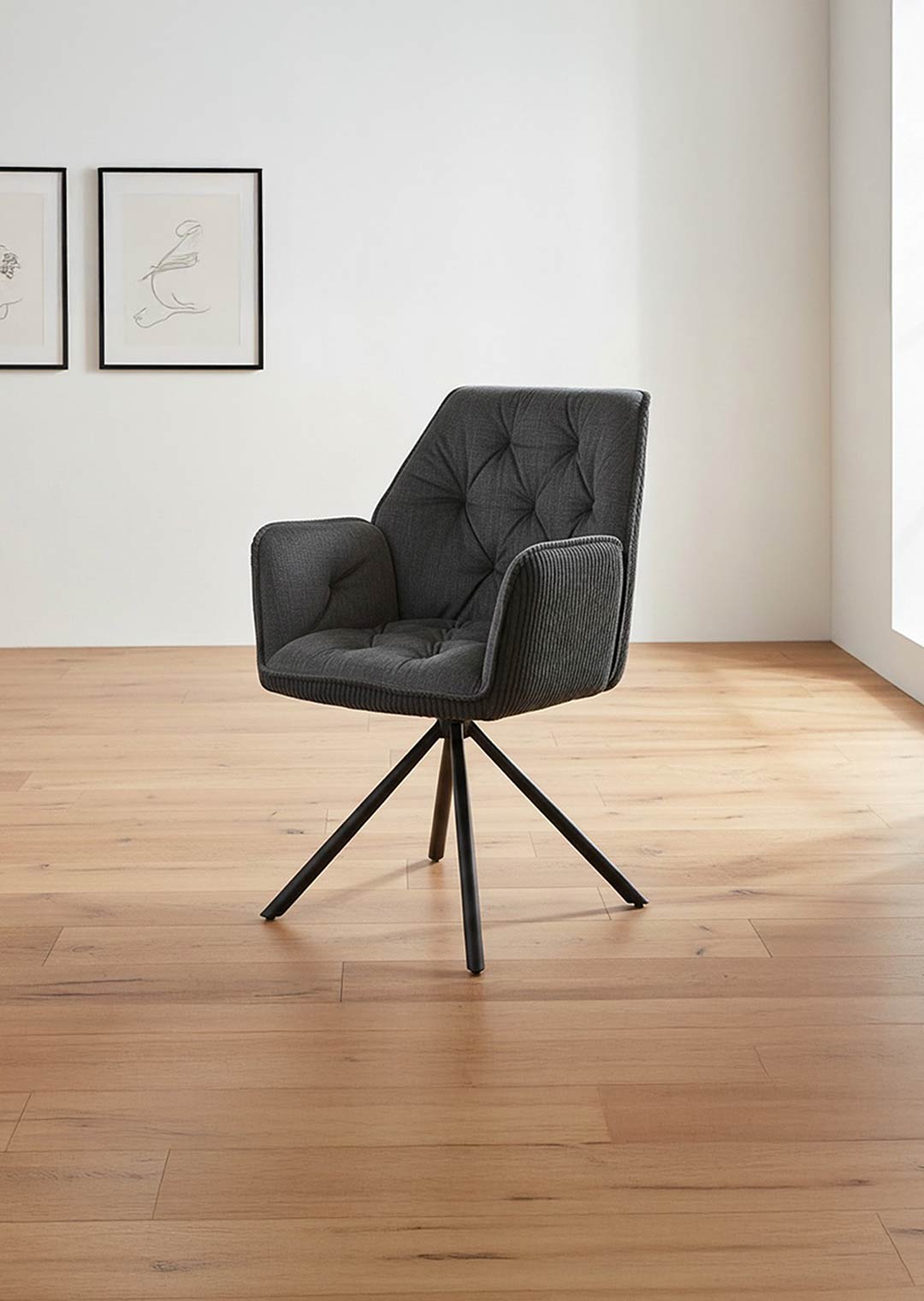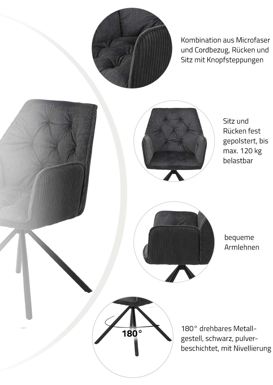Statten Sie Ihre Zuhause mit dem neuen und funktionalen Trendsetter aus!Unser Armlehnstuhl INGE hebt Ihre Einrichtung auf ein ganz neues Level. Die ideal abgestimmte Kombination von Microfaser und Cord zeugt vom neuesten Wandel in der Möbelbranche. Der gelungene Textilmix in anthrazit strahlt nicht nur stilvolle Eleganz aus, beide Stoffe begeistern auch durch eine angenehme Haptik. Aufwendige Knopfsteppungen bringen Gemütlichkeit in die Gesamterscheinung und durch selbige erinnert der Stuhl an einen bequemen Sessel. Verstärkt wird dies durch weiche Rundungen des sonst klar konturierten Looks. Dank seines Äußeren lädt der Stuhl zu entspannten Mahlzeiten oder ausgiebigen Abenden mit Familie und Freunde ein. Beim Hinsetzen werden Sie feststellen, dass die Schaumstoff-Polsterung ein behagliches Sitzerlebnis bietet. Weiterer Komfort wird Ihnen durch die Drehfunktion geboten. So können Sie den Stuhl während einer Gesprächsrunde jederzeit um 180 Grad drehen und gespannt der Konversation folgen. Außerdem wurde eine Nivellierung verbaut, was bedeutet, dass die Sitzschale beim Aufstehen wieder in die Ausgangsposition zurückspringt. Zum Abschluss vervollständigt das stabile schwarze Metallgestell das raffinierte Gesamtpaket.Bestellen Sie noch heute Ihren neuen Armlehnstuhl oder besuchen Sie uns an einem unserer Standorte.Wir freuen uns auf Sie!| Produktdetails: | |