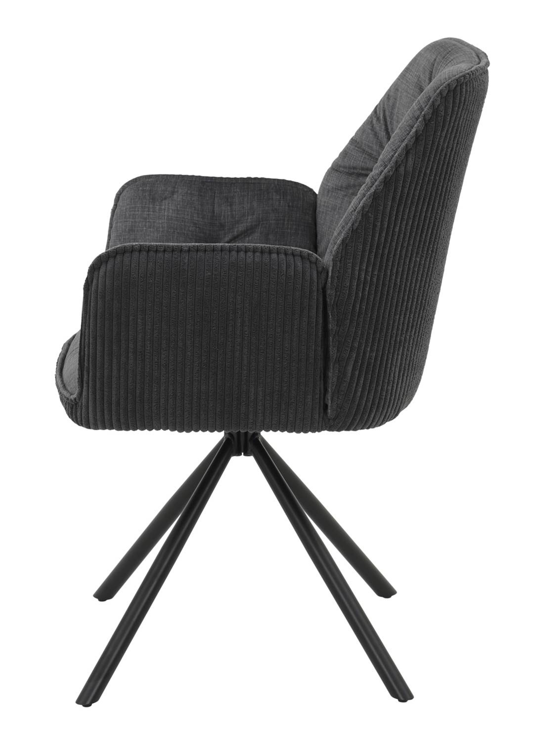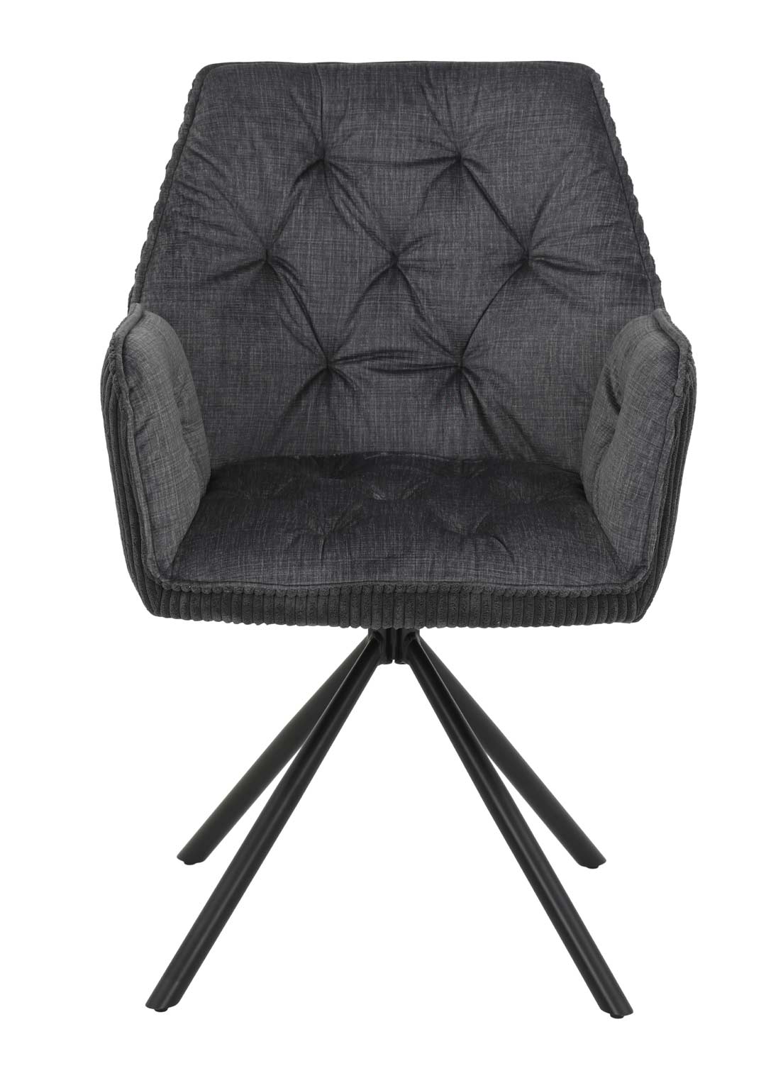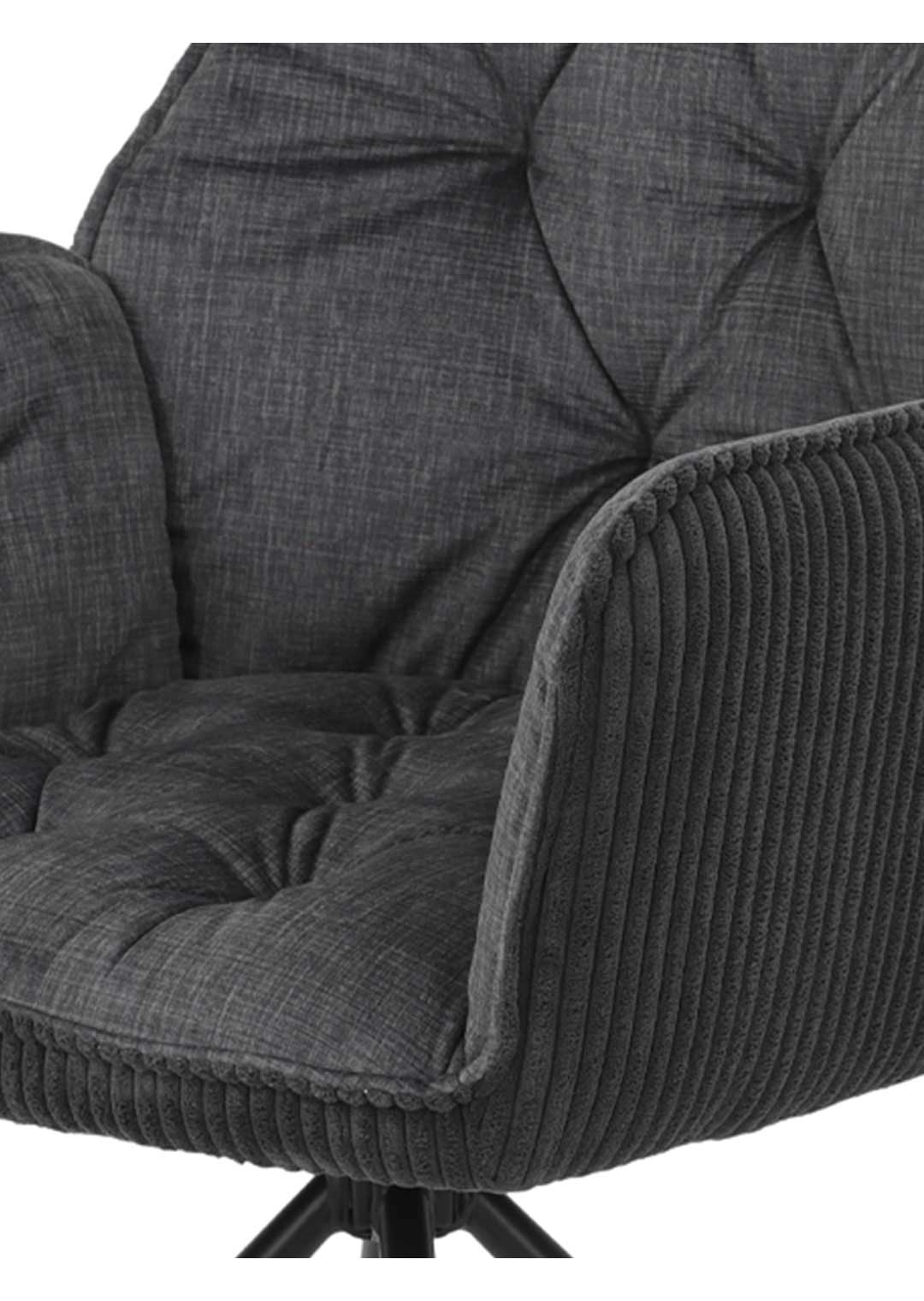 Statten Sie Ihre Zuhause mit dem neuen und funktionalen Trendsetter aus!Unser Armlehnstuhl INGE hebt Ihre Einrichtung auf ein ganz neues Level. Die ideal abgestimmte Kombination von Microfaser und Cord zeugt vom neuesten Wandel in der Möbelbranche. Der gelungene Textilmix in anthrazit strahlt nicht nur stilvolle Eleganz aus, beide Stoffe begeistern auch durch eine angenehme Haptik. Aufwendige Knopfsteppungen bringen Gemütlichkeit in die Gesamterscheinung und durch selbige erinnert der Stuhl an einen bequemen Sessel. Verstärkt wird dies durch weiche Rundungen des sonst klar konturierten Looks. Dank seines Äußeren lädt der Stuhl zu entspannten Mahlzeiten oder ausgiebigen Abenden mit Familie und Freunde ein. Beim Hinsetzen werden Sie feststellen, dass die Schaumstoff-Polsterung ein behagliches Sitzerlebnis bietet. Weiterer Komfort wird Ihnen durch die Drehfunktion geboten. So können Sie den Stuhl während einer Gesprächsrunde jederzeit um 180 Grad drehen und gespannt der Konversation folgen. Außerdem wurde eine Nivellierung verbaut, was bedeutet, dass die Sitzschale beim Aufstehen wieder in die Ausgangsposition zurückspringt. Zum Abschluss vervollständigt das stabile schwarze Metallgestell das raffinierte Gesamtpaket.Bestellen Sie noch heute Ihren neuen Armlehnstuhl oder besuchen Sie uns an einem unserer Standorte.Wir freuen uns auf Sie!| Produktdetails: | |