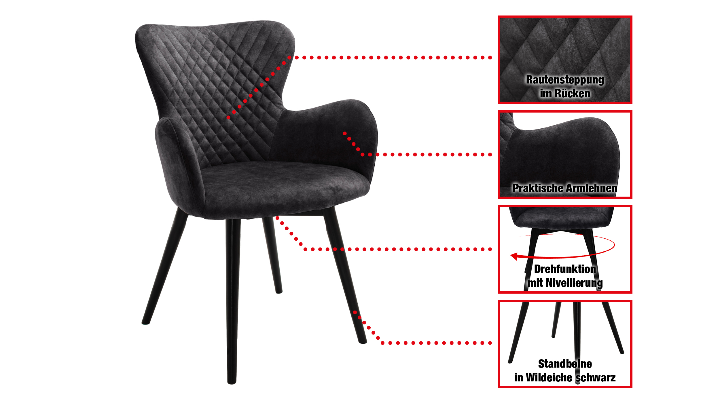 Bequem und stilvoll sitzen mit dem aktuellen Schalenstuhl SARANDER in einer anthrazit Farbvariante!Dieser Armlehnstuhl begeistert auf den ersten Blick und fügt sich nahtlos in Ihren bestehenden Einrichtungsstil. Die beiden Armlehnen auf einer angenehmen Höhe, unterstützen Ihre Haltung am Tisch und sorgen außerdem dafür, dass sich dieser Stuhl recht einfach neu positionieren lässt. In der gepolsterten Sitzschale finden Sie eine optimale Sitzposition, welche sich noch drehen lässt. So können Sie sich bequem hinsetzen und das Aufstehen wird ebenfalls angenehmer. Genießen Sie die Vorteile bald bei sich zu Hause: