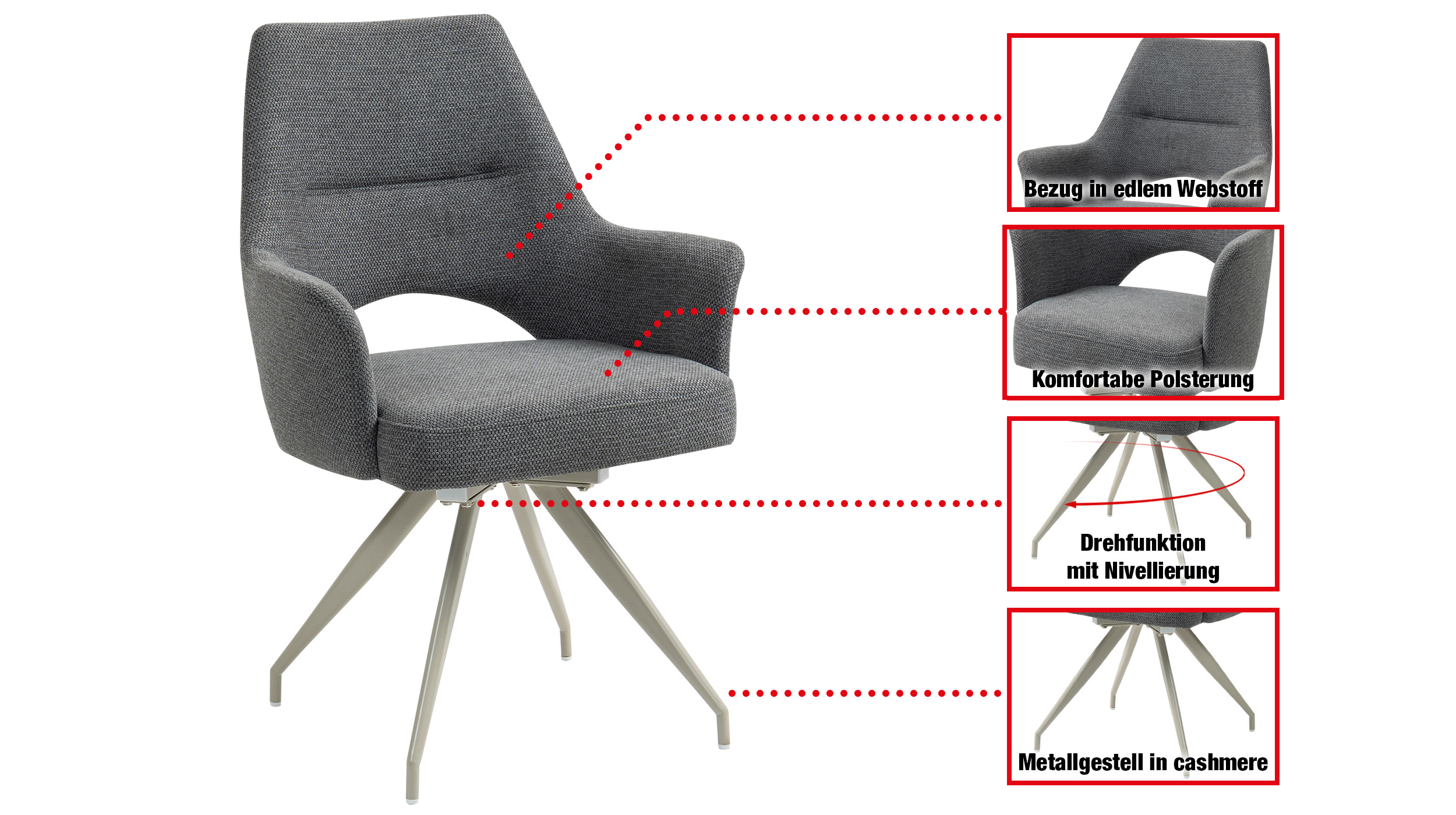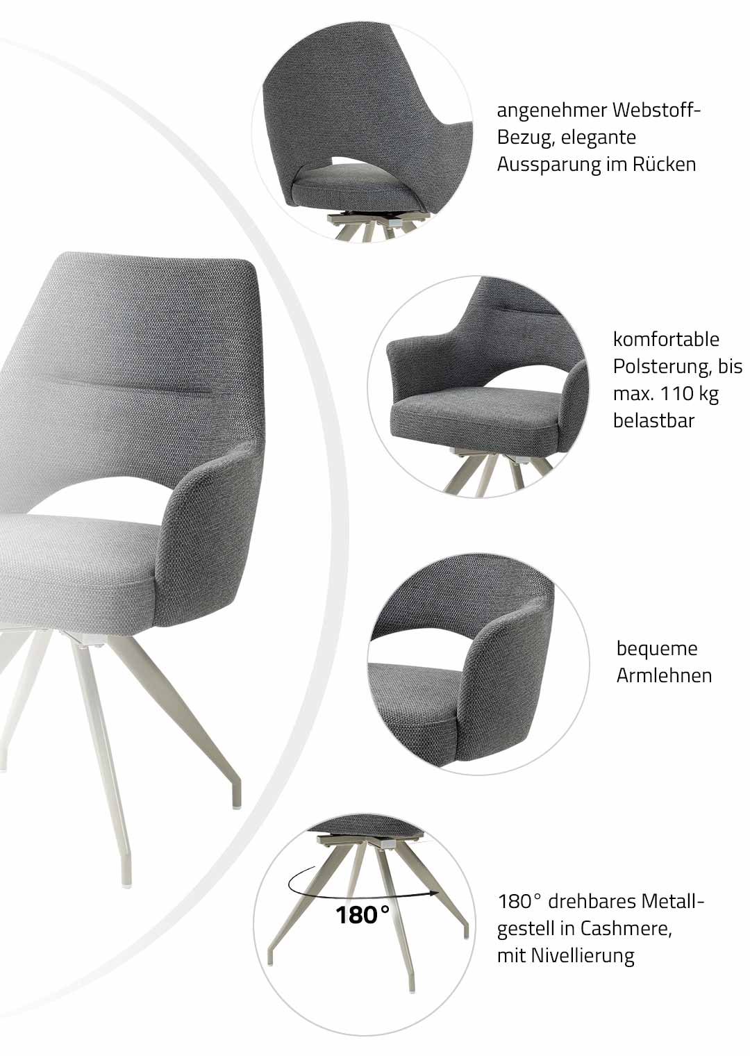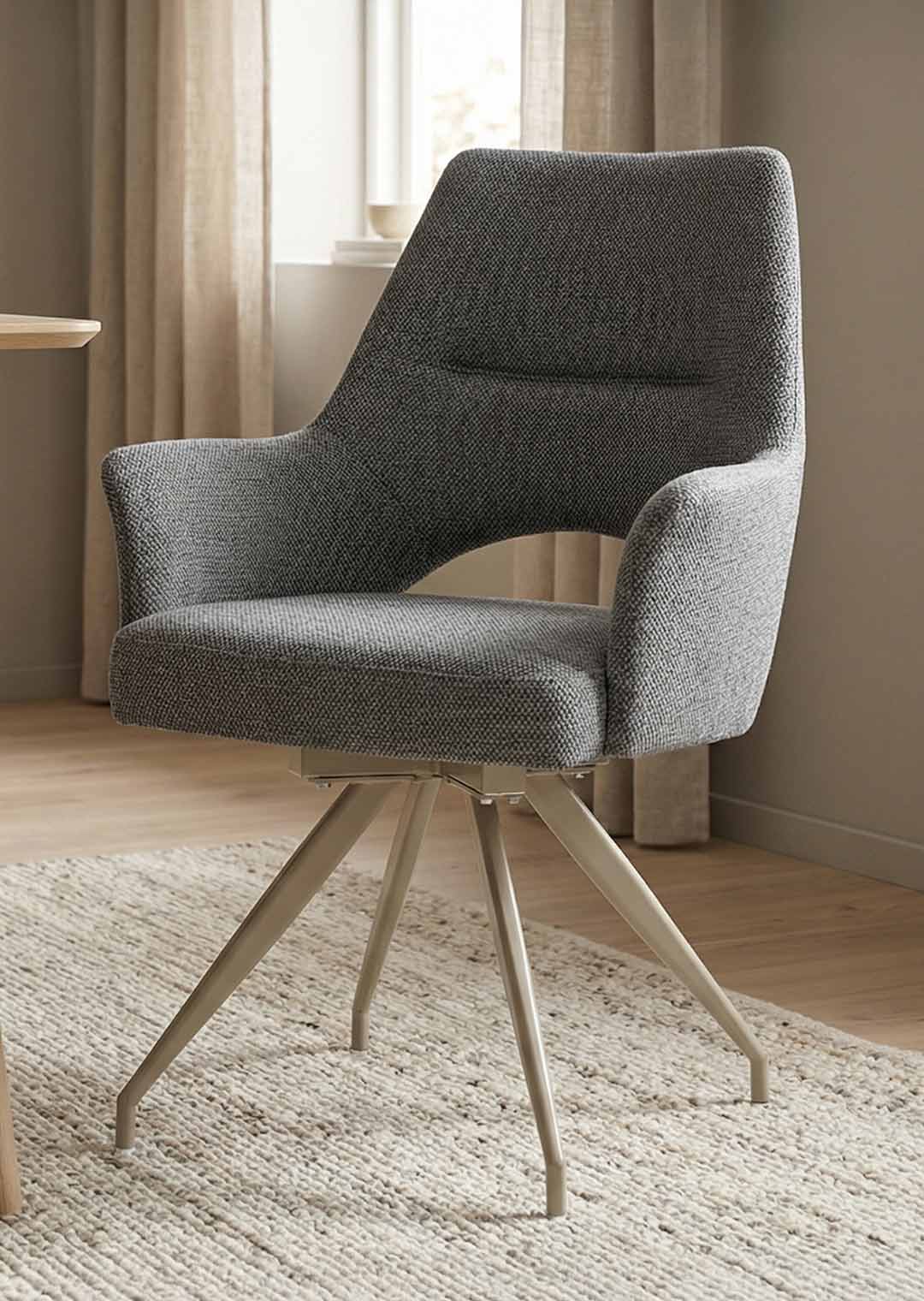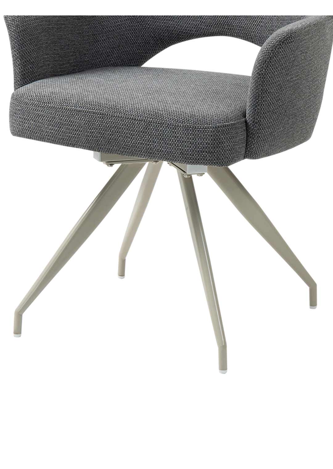 Stilvoller Komfort mit durchdachter Funktion - unser Armlehnstuhl MAILA! Der Armlehnstuhl MAILA verbindet modernes Design mit außergewöhnlicher Funktionalität und wird damit zu einem stilvollen Blickfang in jedem Wohn- oder Essbereich. Der Webstoff in Anthrazit verleiht dem Stuhl eine elegante, zeitlose Ausstrahlung und wirkt zugleich besonders edel und ausdrucksstark. Durch seine dunkle Farbgebung lässt sich der Armlehnstuhl vielseitig kombinieren und setzt markante Akzente, ohne dabei aufdringlich zu wirken. Optisch wird der Stuhl durch das filigrane Metallgestell in der eleganten Farbe Cashmere perfekt ergänzt. Der warme Farbton bildet einen stilvollen Kontrast zum anthrazitfarbenen Webstoff und unterstreicht den modernen Charakter des Designs. Ein echtes Highlight stellt die stylische Aussparung im unteren Bereich der Rückenlehne dar, die dem Stuhl nicht nur eine moderne, luftige Optik verleiht, sondern gleichzeitig die Bewegungsfreiheit erhöht und den Sitzkomfort zusätzlich unterstützt. Im täglichen Gebrauch zeigt der Armlehnstuhl MAILA seine besonderen Stärken. Die komfortabel gepolsterte Sitzfläche und die integrierten Armlehnen sorgen für ein entspanntes Sitzgefühl und bieten spürbare Entlastung, insbesondere bei längerem Verweilen. Dank der 180 Grad-Drehfunktion lässt sich der Stuhl flexibel bewegen, ohne ihn verrücken zu müssen, was ihn besonders praktisch im Alltag macht. Die integrierte Rückholfunktion mit Nivellierung sorgt dafür, dass der Stuhl nach dem Aufstehen automatisch in seine Ausgangsposition zurückkehrt. Dadurch bleibt das Gesamtbild am Tisch stets ordentlich und harmonisch, was vor allem im Essbereich oder in offenen Wohnkonzepten ein großer Vorteil ist. Diese durchdachte Funktionalität macht den Armlehnstuhl MAILA zu einer idealen Wahl für gesellige Runden, Meetings am Esstisch oder längere Abende in entspannter Atmosphäre. Bestellen Sie jetzt Ihren neuen Polsterstuhl direkt online oder rufen sie uns einfach an.Wir freuen uns auf Sie!| Produktdetails: | |