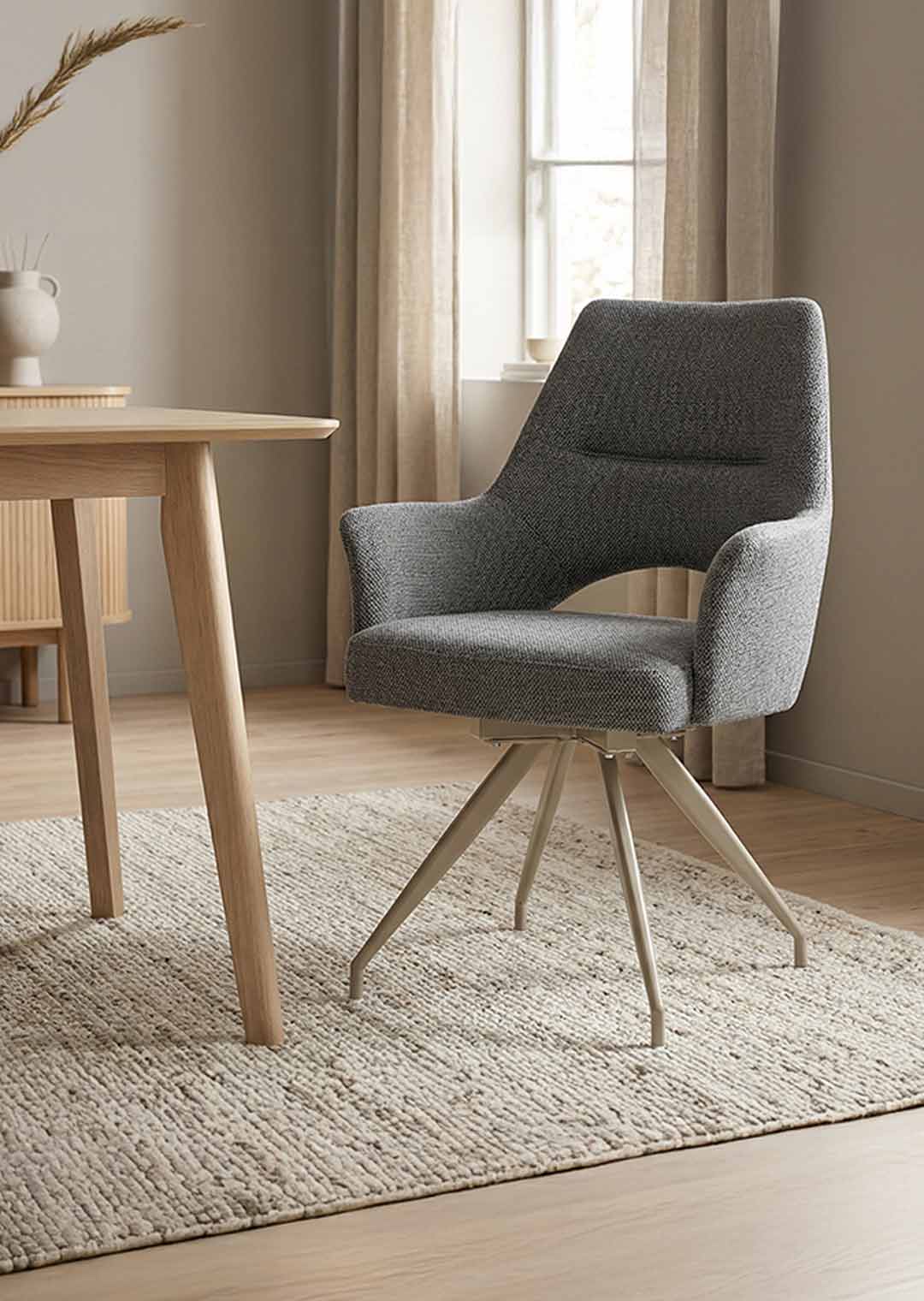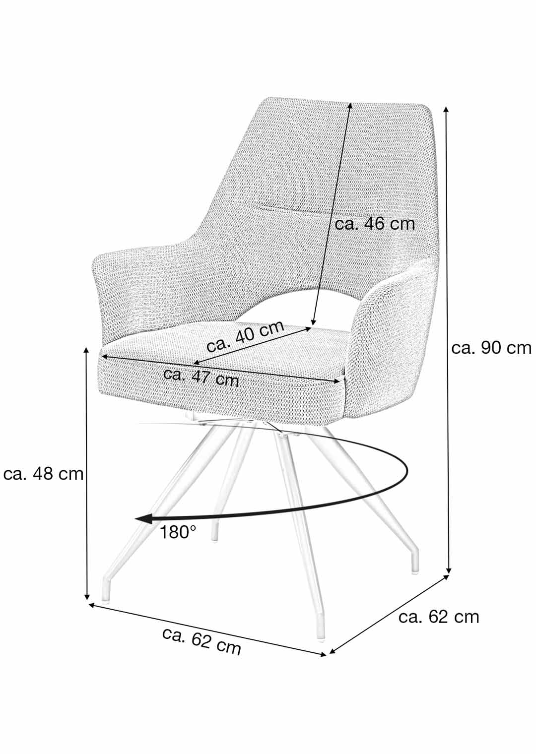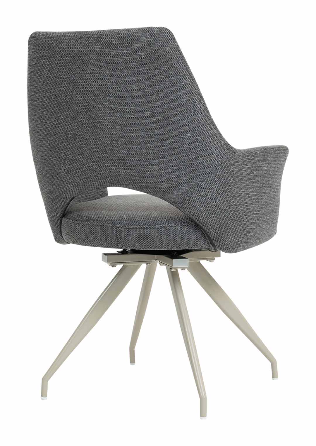 Stilvoller Komfort mit durchdachter Funktion - unser Armlehnstuhl MAILA! Der Armlehnstuhl MAILA verbindet modernes Design mit außergewöhnlicher Funktionalität und wird damit zu einem stilvollen Blickfang in jedem Wohn- oder Essbereich. Der Webstoff in Anthrazit verleiht dem Stuhl eine elegante, zeitlose Ausstrahlung und wirkt zugleich besonders edel und ausdrucksstark. Durch seine dunkle Farbgebung lässt sich der Armlehnstuhl vielseitig kombinieren und setzt markante Akzente, ohne dabei aufdringlich zu wirken. Optisch wird der Stuhl durch das filigrane Metallgestell in der eleganten Farbe Cashmere perfekt ergänzt. Der warme Farbton bildet einen stilvollen Kontrast zum anthrazitfarbenen Webstoff und unterstreicht den modernen Charakter des Designs. Ein echtes Highlight stellt die stylische Aussparung im unteren Bereich der Rückenlehne dar, die dem Stuhl nicht nur eine moderne, luftige Optik verleiht, sondern gleichzeitig die Bewegungsfreiheit erhöht und den Sitzkomfort zusätzlich unterstützt. Im täglichen Gebrauch zeigt der Armlehnstuhl MAILA seine besonderen Stärken. Die komfortabel gepolsterte Sitzfläche und die integrierten Armlehnen sorgen für ein entspanntes Sitzgefühl und bieten spürbare Entlastung, insbesondere bei längerem Verweilen. Dank der 180 Grad-Drehfunktion lässt sich der Stuhl flexibel bewegen, ohne ihn verrücken zu müssen, was ihn besonders praktisch im Alltag macht. Die integrierte Rückholfunktion mit Nivellierung sorgt dafür, dass der Stuhl nach dem Aufstehen automatisch in seine Ausgangsposition zurückkehrt. Dadurch bleibt das Gesamtbild am Tisch stets ordentlich und harmonisch, was vor allem im Essbereich oder in offenen Wohnkonzepten ein großer Vorteil ist. Diese durchdachte Funktionalität macht den Armlehnstuhl MAILA zu einer idealen Wahl für gesellige Runden, Meetings am Esstisch oder längere Abende in entspannter Atmosphäre. Bestellen Sie jetzt Ihren neuen Polsterstuhl direkt online oder rufen sie uns einfach an.Wir freuen uns auf Sie!| Produktdetails: | |