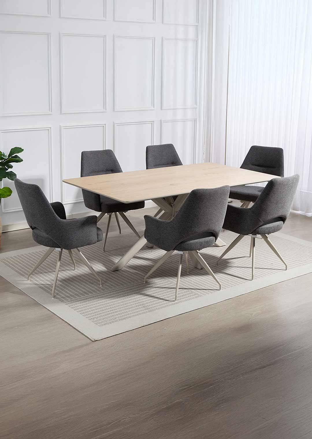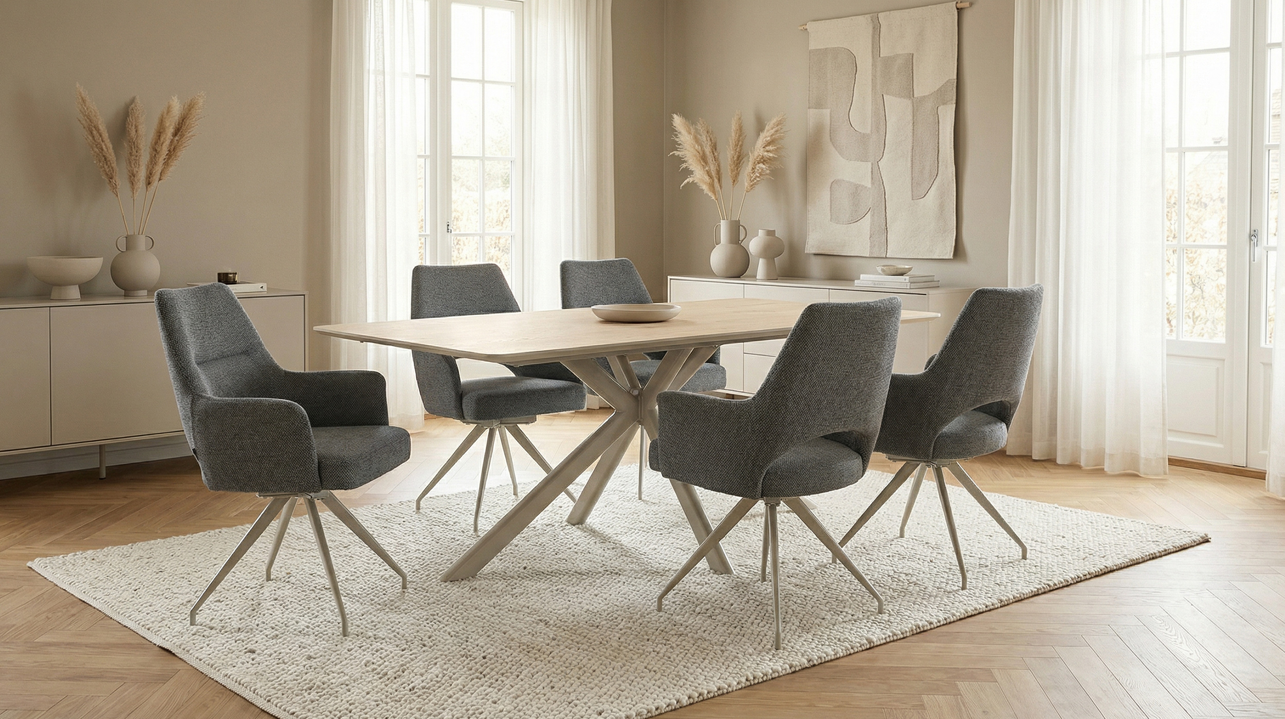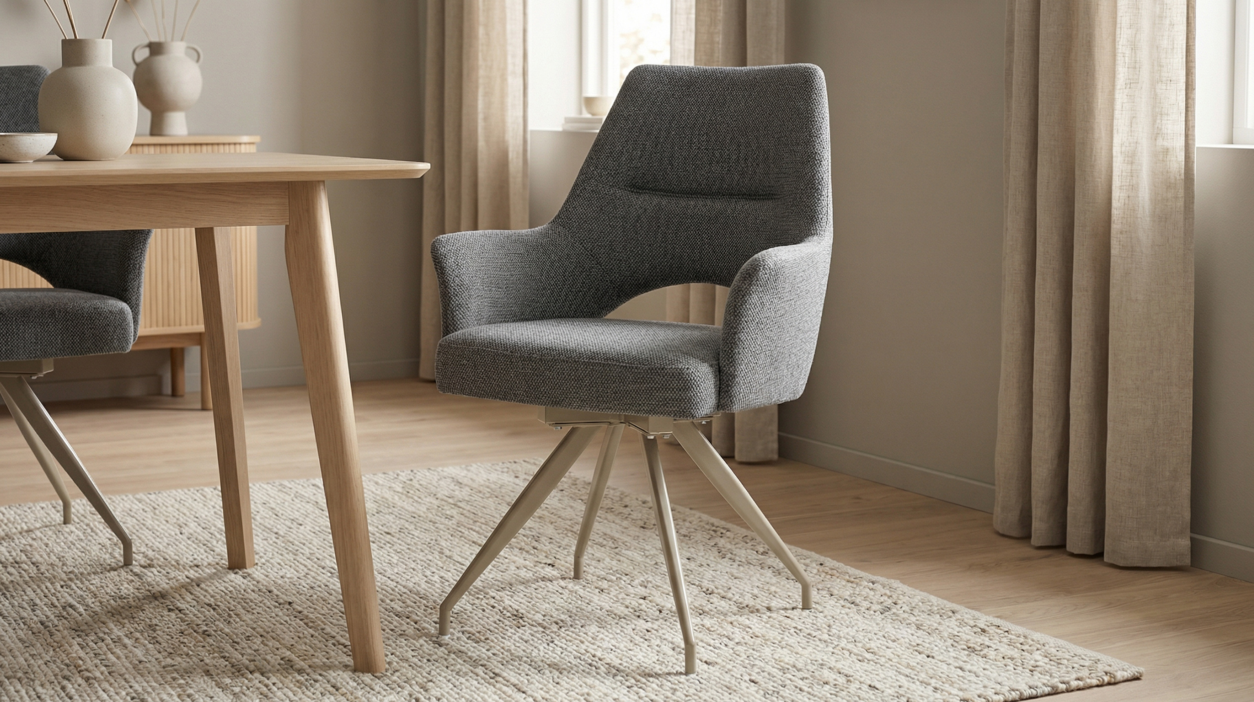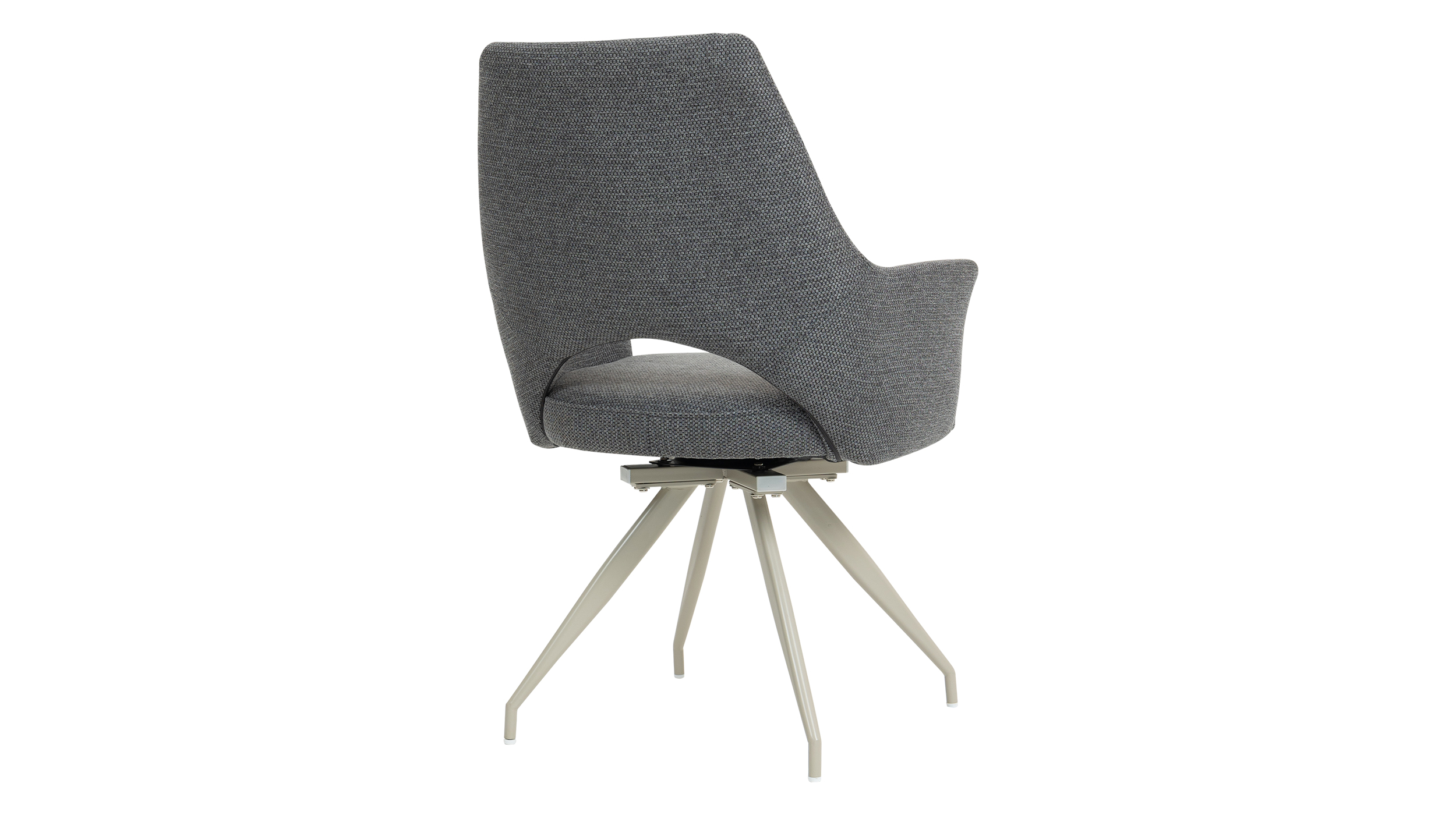 Stilvoller Komfort mit durchdachter Funktion - unser Armlehnstuhl MAILA! Der Armlehnstuhl MAILA verbindet modernes Design mit außergewöhnlicher Funktionalität und wird damit zu einem stilvollen Blickfang in jedem Wohn- oder Essbereich. Der Webstoff in Anthrazit verleiht dem Stuhl eine elegante, zeitlose Ausstrahlung und wirkt zugleich besonders edel und ausdrucksstark. Durch seine dunkle Farbgebung lässt sich der Armlehnstuhl vielseitig kombinieren und setzt markante Akzente, ohne dabei aufdringlich zu wirken. Optisch wird der Stuhl durch das filigrane Metallgestell in der eleganten Farbe Cashmere perfekt ergänzt. Der warme Farbton bildet einen stilvollen Kontrast zum anthrazitfarbenen Webstoff und unterstreicht den modernen Charakter des Designs. Ein echtes Highlight stellt die stylische Aussparung im unteren Bereich der Rückenlehne dar, die dem Stuhl nicht nur eine moderne, luftige Optik verleiht, sondern gleichzeitig die Bewegungsfreiheit erhöht und den Sitzkomfort zusätzlich unterstützt. Im täglichen Gebrauch zeigt der Armlehnstuhl MAILA seine besonderen Stärken. Die komfortabel gepolsterte Sitzfläche und die integrierten Armlehnen sorgen für ein entspanntes Sitzgefühl und bieten spürbare Entlastung, insbesondere bei längerem Verweilen. Dank der 180 Grad-Drehfunktion lässt sich der Stuhl flexibel bewegen, ohne ihn verrücken zu müssen, was ihn besonders praktisch im Alltag macht. Die integrierte Rückholfunktion mit Nivellierung sorgt dafür, dass der Stuhl nach dem Aufstehen automatisch in seine Ausgangsposition zurückkehrt. Dadurch bleibt das Gesamtbild am Tisch stets ordentlich und harmonisch, was vor allem im Essbereich oder in offenen Wohnkonzepten ein großer Vorteil ist. Diese durchdachte Funktionalität macht den Armlehnstuhl MAILA zu einer idealen Wahl für gesellige Runden, Meetings am Esstisch oder längere Abende in entspannter Atmosphäre. Bestellen Sie jetzt Ihren neuen Polsterstuhl direkt online oder rufen sie uns einfach an.Wir freuen uns auf Sie!| Produktdetails: | |