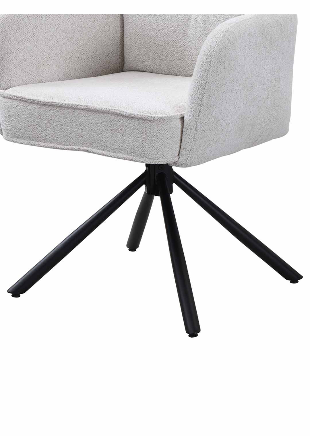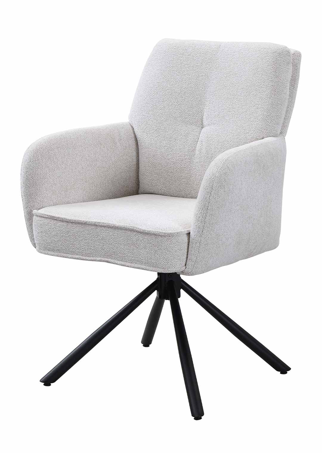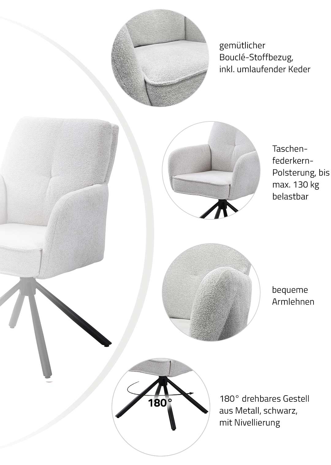 Ein komfortabler Eye-Catcher für Ihren Esstisch - unser Armlehnstuhl JÖRDIS! Mit unserem stilvollen Armlehnstuhl JÖRDIS bereichern Sie Ihr Zuhause und setzen gemütliche Statements an Ihrem Esstisch. In topaktuellem Bouclé-Stoff bezogen begeistert die Oberfläche mit ihrer texturierten und anschmiegsamen Haptik. Bouclé-Stoff überzeugt dank seiner einzigartigen Gestaltung, die durch ihre kunstvoll gewebten Schlingen elegante und trendige Raffinesse verströmt. Ideal für den skandinavischen Touch in Ihrem Zuhause. Der edle Look in Creme wird abgerundet mit Kedernähten und einer punktuellen Ziernaht am Rücken. Komplementierend zur anschmiegsamen Stoffgestaltung trägt das Metallgestell in Schwarz zu einer formschönen Linienführung bei und fördert zusätzlich die Stabilität. Die verbaute Taschenfederkern-Polsterung verwöhnt mit einem luxuriösen Komforterlebnis, ideal bei häufigem Sitzen wie um Ihren Esstisch herum. Die hochwertige Polsterung passt sich dabei perfekt an den Körper an und bietet gleichmäßige Unterstützung für eine optimale Körperhaltung. Der Esszimmerstuhl verfügt über eine praktische 180° Grad Drehfunktion. So können Sie sich Ihren Sitznachbarn zudrehen und dank der Nivellierung springt der Stuhl nach dem Aufstehen wieder in seine Ausgangsposition zurück. Ausdruckstarke Armlehnen fördern eine gelassene Haltung, besonders während längerer Mahlzeiten. Zusätzlich wird mit ihrer passenden Höhe eine Entlastung erzeugt, und der Drehstuhl lässt sich an diesen auch gekonnt greifen, um eine Positionierung um Ihren Tisch zu vereinfachen. Genießen Sie langanhaltenden Komfort und lehnen Sie sich entspannt zurück.Bestellen Sie Ihren neuen Armlehnstuhl direkt online. Wir freuen uns auf Sie!| Produktdetails: | |