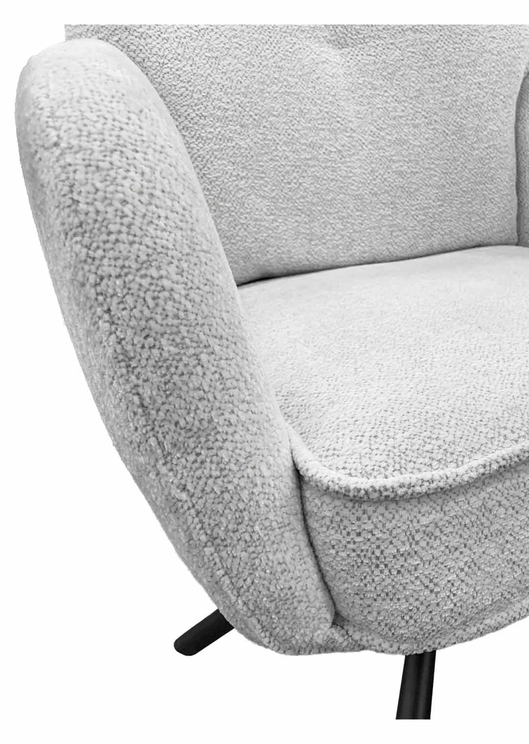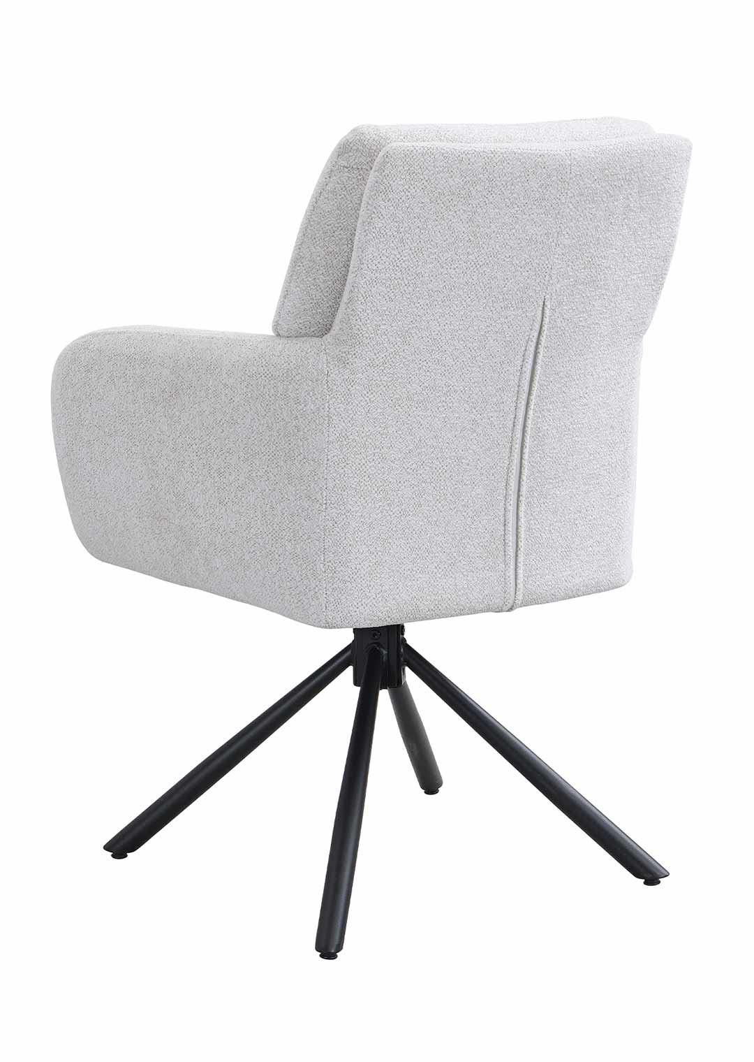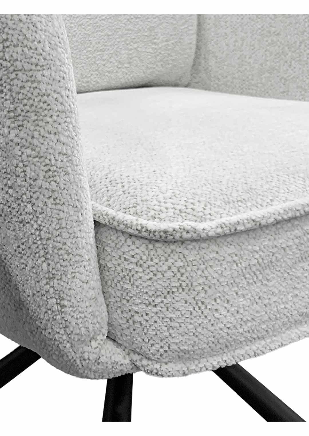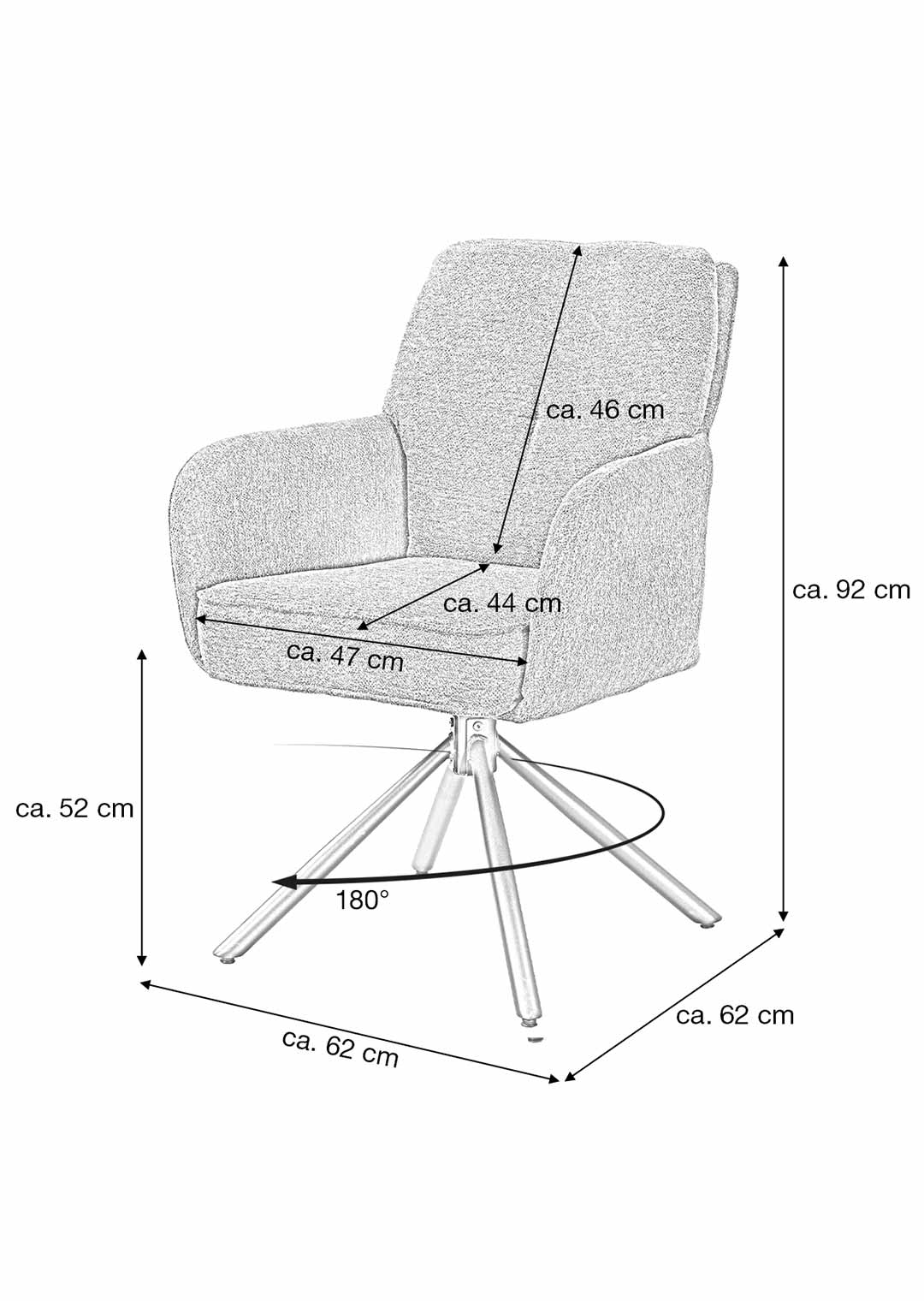 Ein komfortabler Eye-Catcher für Ihren Esstisch - unser Armlehnstuhl JÖRDIS! Mit unserem stilvollen Armlehnstuhl JÖRDIS bereichern Sie Ihr Zuhause und setzen gemütliche Statements an Ihrem Esstisch. In topaktuellem Bouclé-Stoff bezogen begeistert die Oberfläche mit ihrer texturierten und anschmiegsamen Haptik. Bouclé-Stoff überzeugt dank seiner einzigartigen Gestaltung, die durch ihre kunstvoll gewebten Schlingen elegante und trendige Raffinesse verströmt. Ideal für den skandinavischen Touch in Ihrem Zuhause. Der edle Look in Creme wird abgerundet mit Kedernähten und einer punktuellen Ziernaht am Rücken. Komplementierend zur anschmiegsamen Stoffgestaltung trägt das Metallgestell in Schwarz zu einer formschönen Linienführung bei und fördert zusätzlich die Stabilität. Die verbaute Taschenfederkern-Polsterung verwöhnt mit einem luxuriösen Komforterlebnis, ideal bei häufigem Sitzen wie um Ihren Esstisch herum. Die hochwertige Polsterung passt sich dabei perfekt an den Körper an und bietet gleichmäßige Unterstützung für eine optimale Körperhaltung. Der Esszimmerstuhl verfügt über eine praktische 180° Grad Drehfunktion. So können Sie sich Ihren Sitznachbarn zudrehen und dank der Nivellierung springt der Stuhl nach dem Aufstehen wieder in seine Ausgangsposition zurück. Ausdruckstarke Armlehnen fördern eine gelassene Haltung, besonders während längerer Mahlzeiten. Zusätzlich wird mit ihrer passenden Höhe eine Entlastung erzeugt, und der Drehstuhl lässt sich an diesen auch gekonnt greifen, um eine Positionierung um Ihren Tisch zu vereinfachen. Genießen Sie langanhaltenden Komfort und lehnen Sie sich entspannt zurück.Bestellen Sie Ihren neuen Armlehnstuhl direkt online. Wir freuen uns auf Sie!| Produktdetails: | |