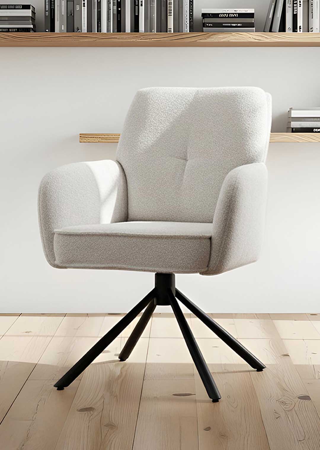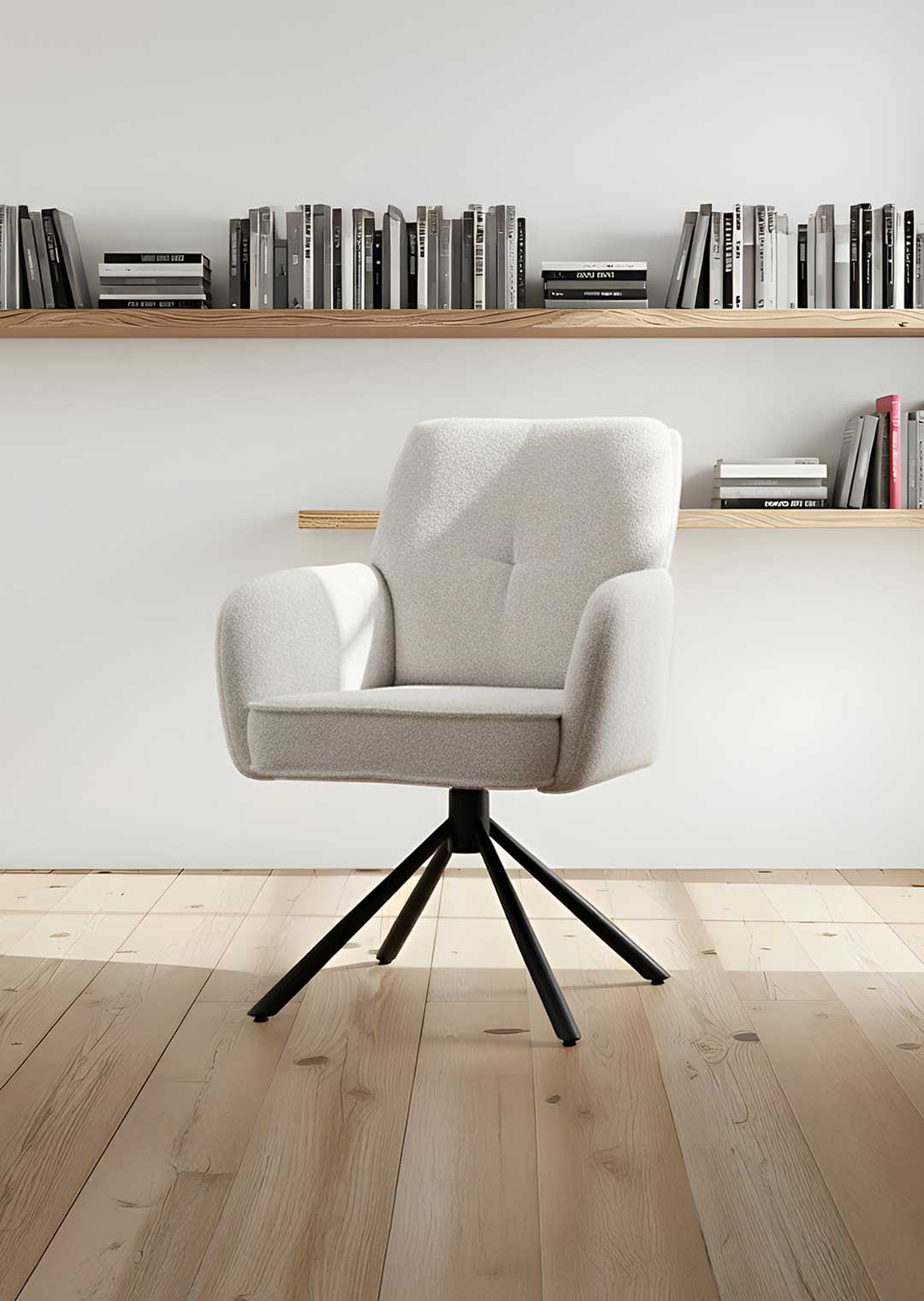 Mega bequemer Stuhl! 😍 Sieht richtig schick aus mit dem Bouclé-Stoff und passt perfekt zu unserem Esstisch. Drehen funktioniert super smooth, will ich nicht mehr missen!