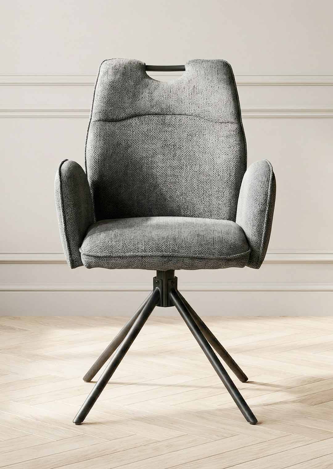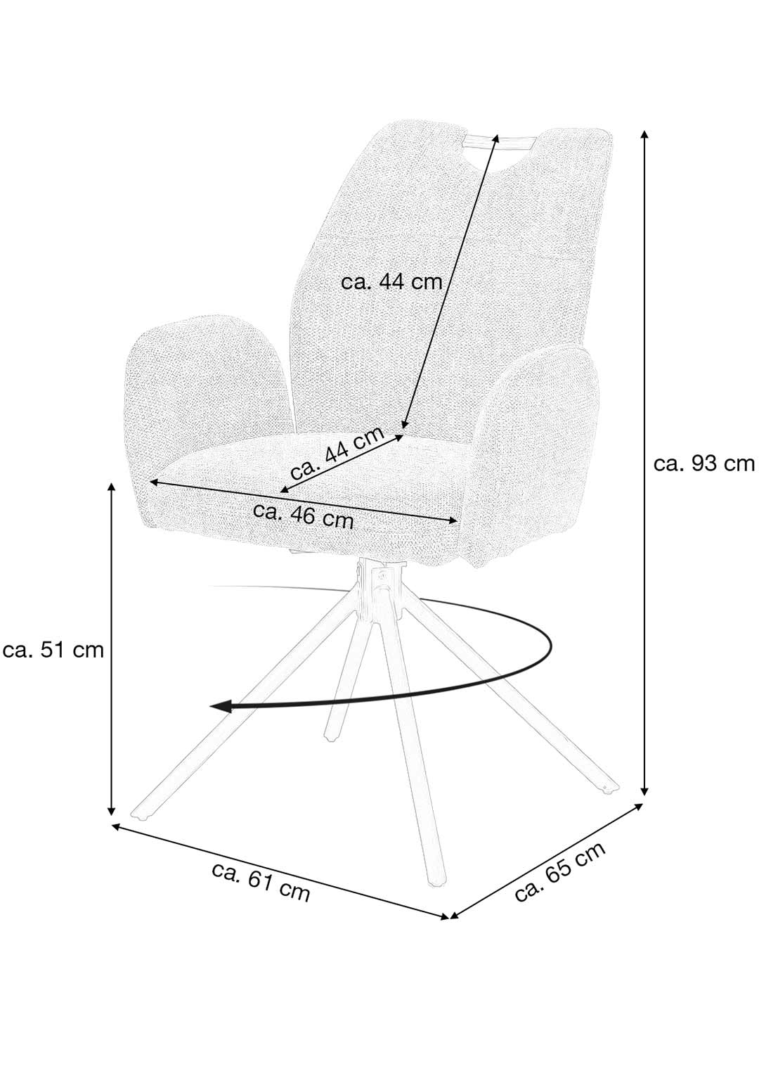 Auch hinsichtlich Komfort lässt der Esszimmerstuhl keine Wünsche offen: die angenehm hohe Rückenlehne, die weiche Polsterung auf Sitz- und Rückenfläche sowie die komfortablen hohen Armlehnen sorgen für ein entspanntes Sitzgefühl; perfekt für lange Dinnerabende oder gemütliche Gespräche mit Freunden. Dank der praktischen 360° Drehfunktion bleiben Sie flexibel und können auch dann, wenn es einmal enger wird, jederzeit bequem aufstehen.