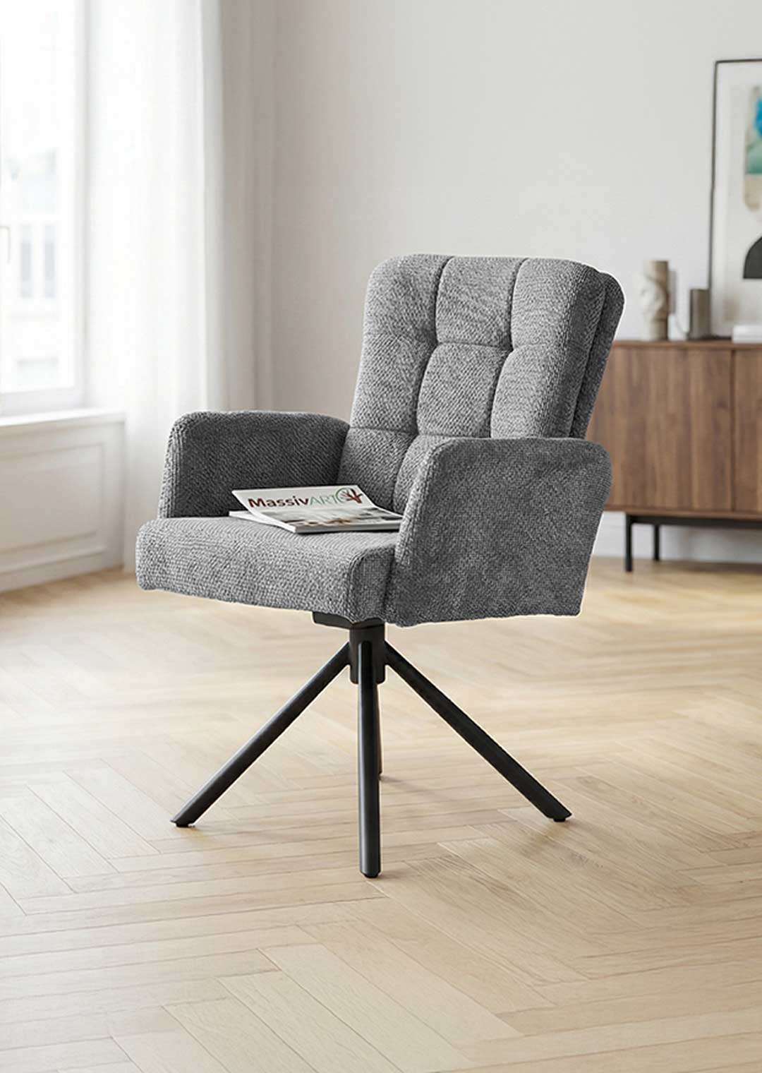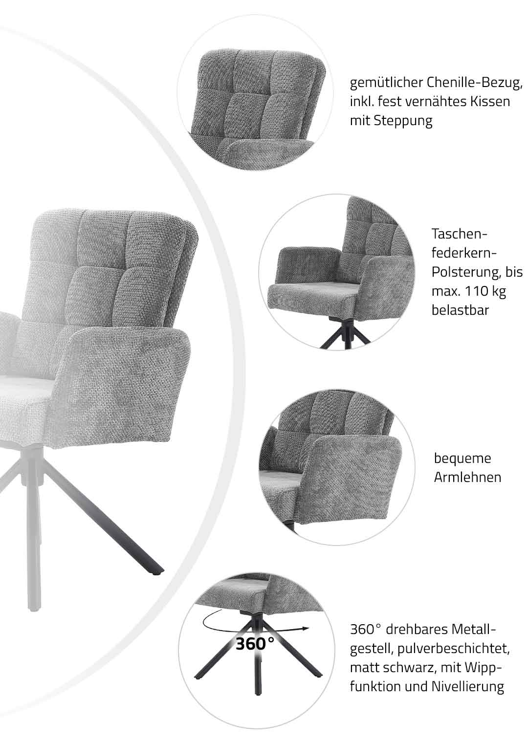 Armlehnstuhl grau Drehstuhl Taschenfederkern Chenille - HEDIA