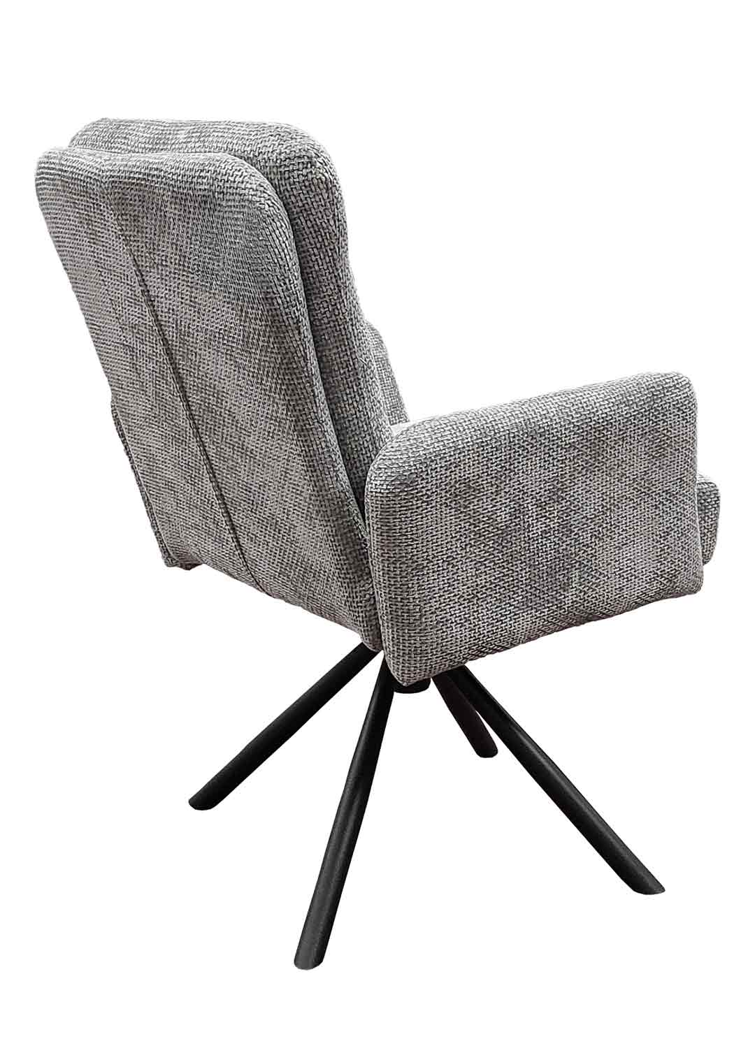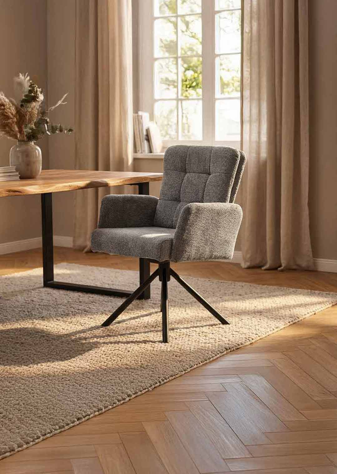 Unser Armlehnstuhl HEDIA erscheint in einem hochwertigen Chenille-Bezug in Grau. Dieser überzeugt durch seine besonders weiche Haptik und lädt zum Verweilen ein. Die Rückenlehne ist mit einem fest vernähten, aufgesetzten Kissen versehen, das dem Stuhl eine besondere Gemütlichkeit verleiht. Die auffällige Steppung im Kissen betont diese Gemütlichkeit noch zusätzlich. Für einen festen Stand im Alltag sorgt das pulverbeschichtete 4-Fuß-Gestell aus Metall in mattem Schwarz. Es verleiht dem Gesamtbild dieses Esszimmerstuhls eine ruhige, moderne Optik, sodass er sich harmonisch in klassische, wie zeitgemäße Einrichtungsstile einfügt.