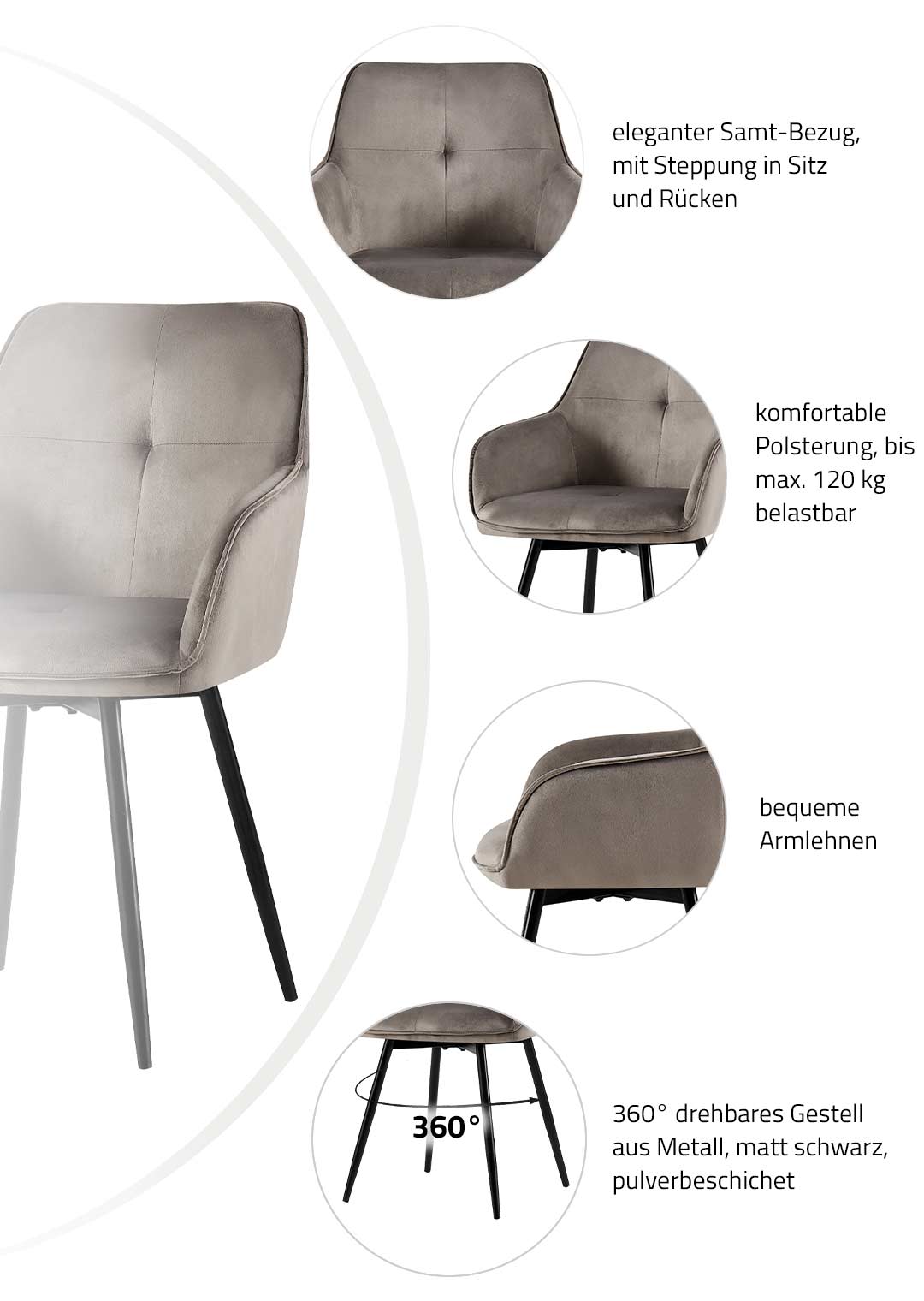 Armlehnstuhl grau Esszimmerstuhl - Samt Bezug - ALMA