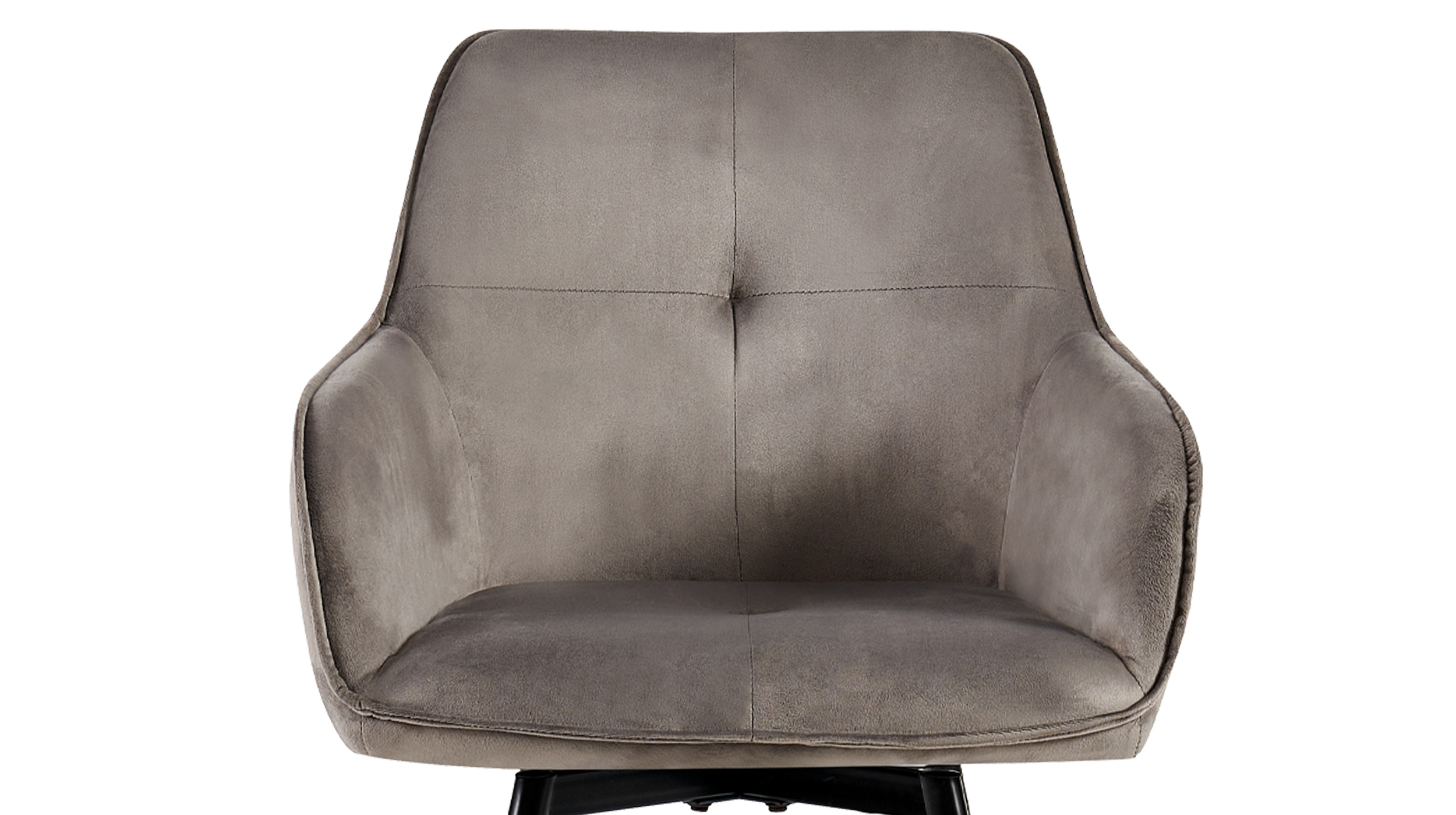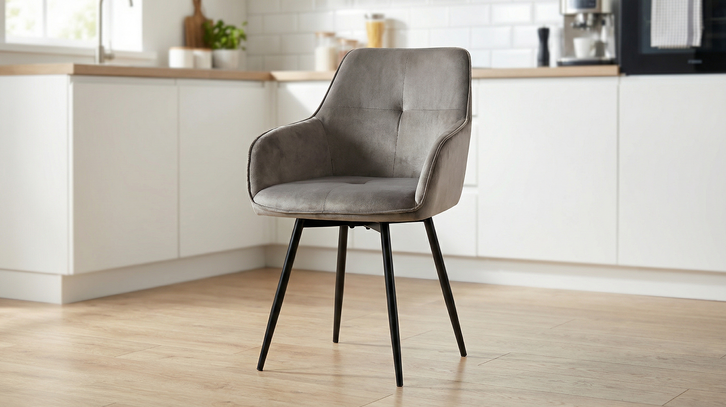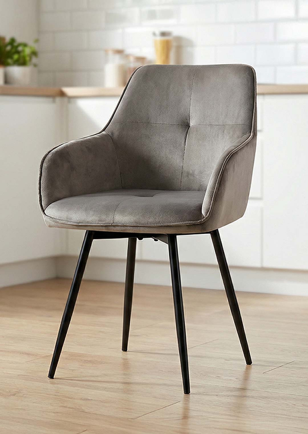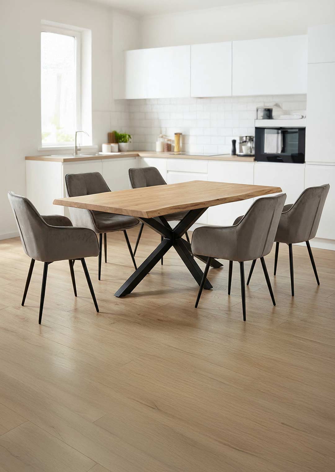 Mit dem Armlehnstuhl ALMA gelingt das mühelos. Der Samt-Bezug verleiht dem Armlehnstuhl eine stilvolle Optik und bringt in Grau pure Eleganz an den Esstisch. Gleichzeitig fühlt sich der Bezug angenehm weich auf der Haut an. Weiche Kanten und die Steppung im Rücken und auf der Sitzfläche verstärken die wohnliche, äußere Erscheinung des Stuhls. Das schlanke, matt schwarze Metallgestell ist pulverbeschichtet und sorgt sowohl für Stabilität, als auch eine moderne Leichtigkeit.
