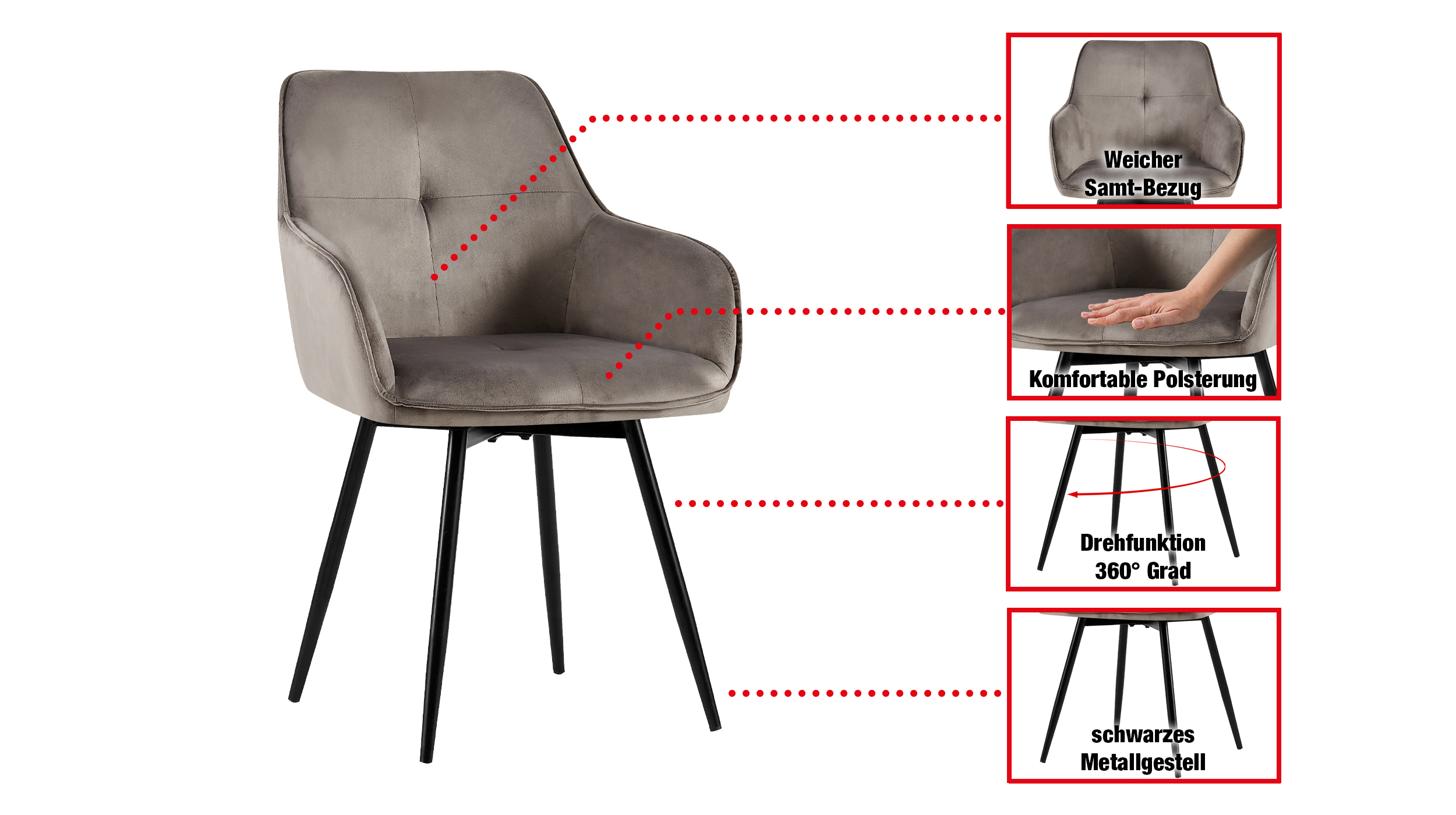 Armlehnstuhl Samt grau - 360° Grad drehbar - ALMA