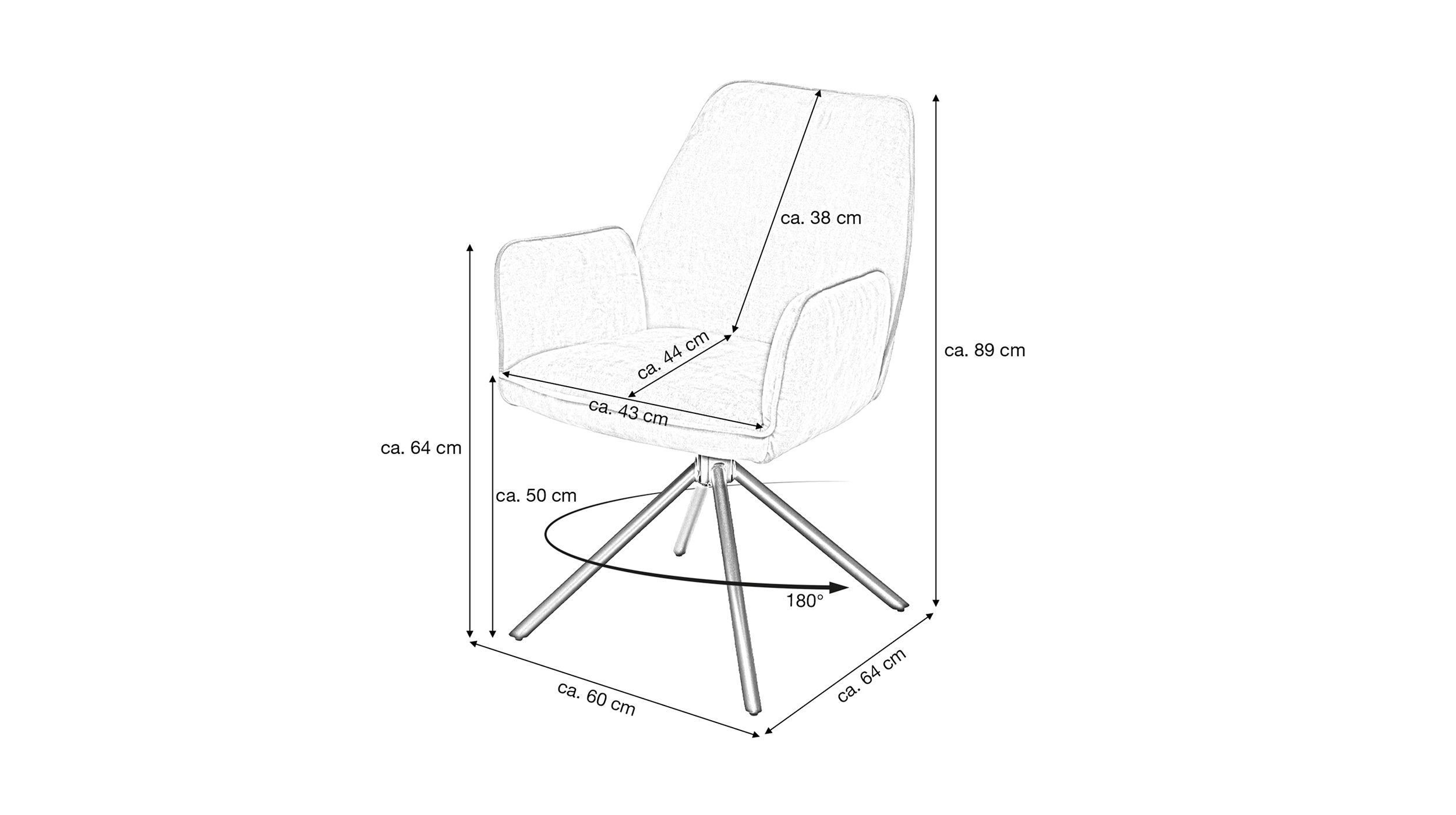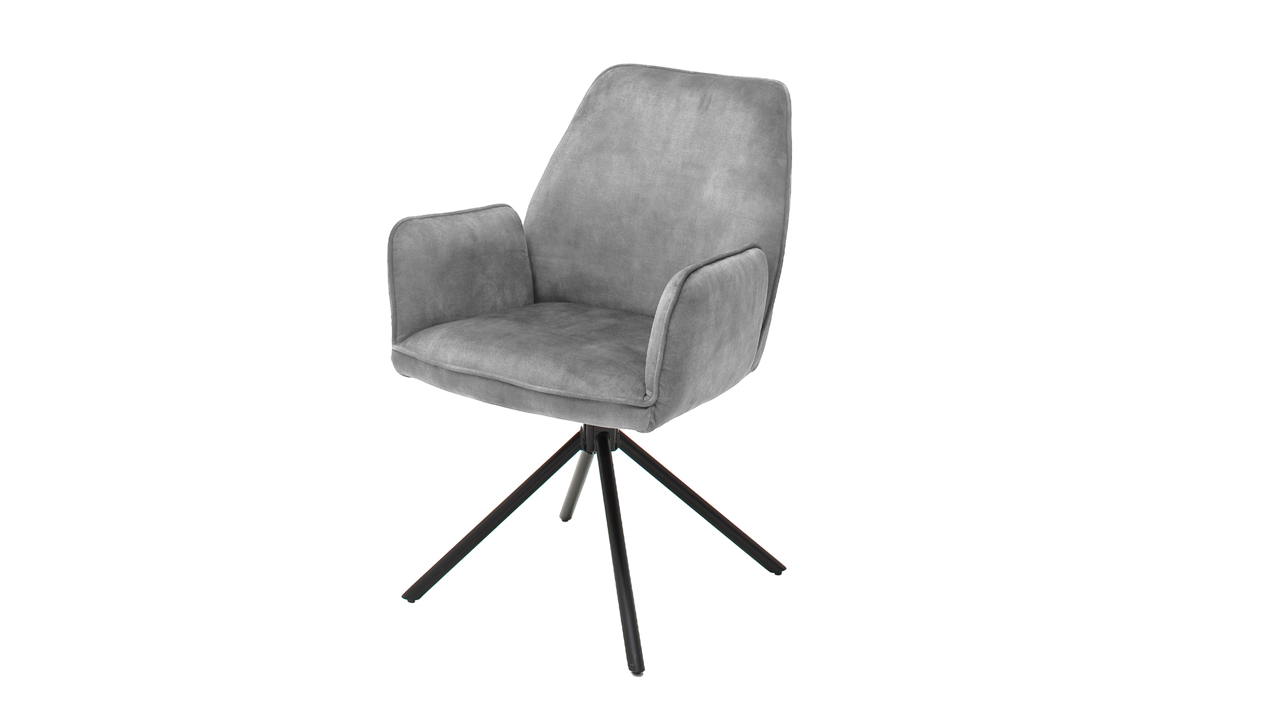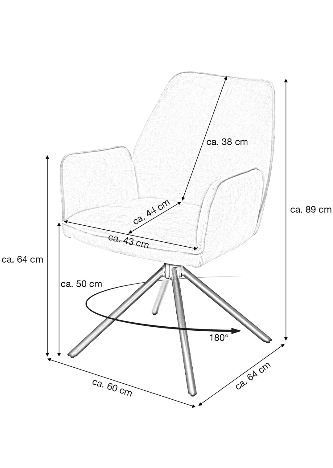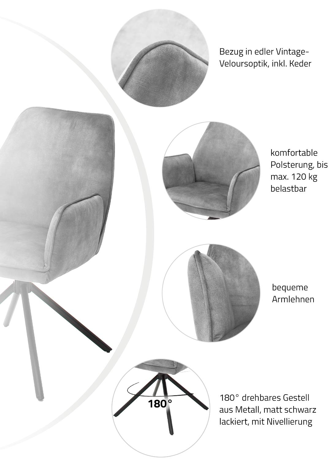Der Armlehnstuhl überzeugt aber nicht nur optisch, sondern auch durch seinen Sitzkomfort. Sitzfläche und Rückenlehne sind mit einer Schaumpolsterung ausgestattet, welche sich angenehm an den Körper anpasst und auch bei längerem Sitzen für Wohlbefinden sorgt. Ergonomisch geformte Armlehnen bieten zusätzlichen Komfort und laden dazu ein, sich entspannt zurückzulehnen. Mit einer Sitzhöhe von etwa ca. 50 cm eignet sich dieser Stuhl ideal für Einsatz am Esstisch oder in der Leseecke. Ein besonderes Highlight ist die 180-Grad-Drehfunktion mit automatischer Nivellierung. Diese Funktion ermöglicht flexibles Bewegen und erlaubt Drehen nach Belieben, ohne an Stabilität einzubüßen. Nach jeder Drehung kehrt Stuhl automatisch in die Ausgangsposition zurück. Dieser Armlehnstuhl vereint Komfort, Stil und Funktionalität in einem Möbelstück.