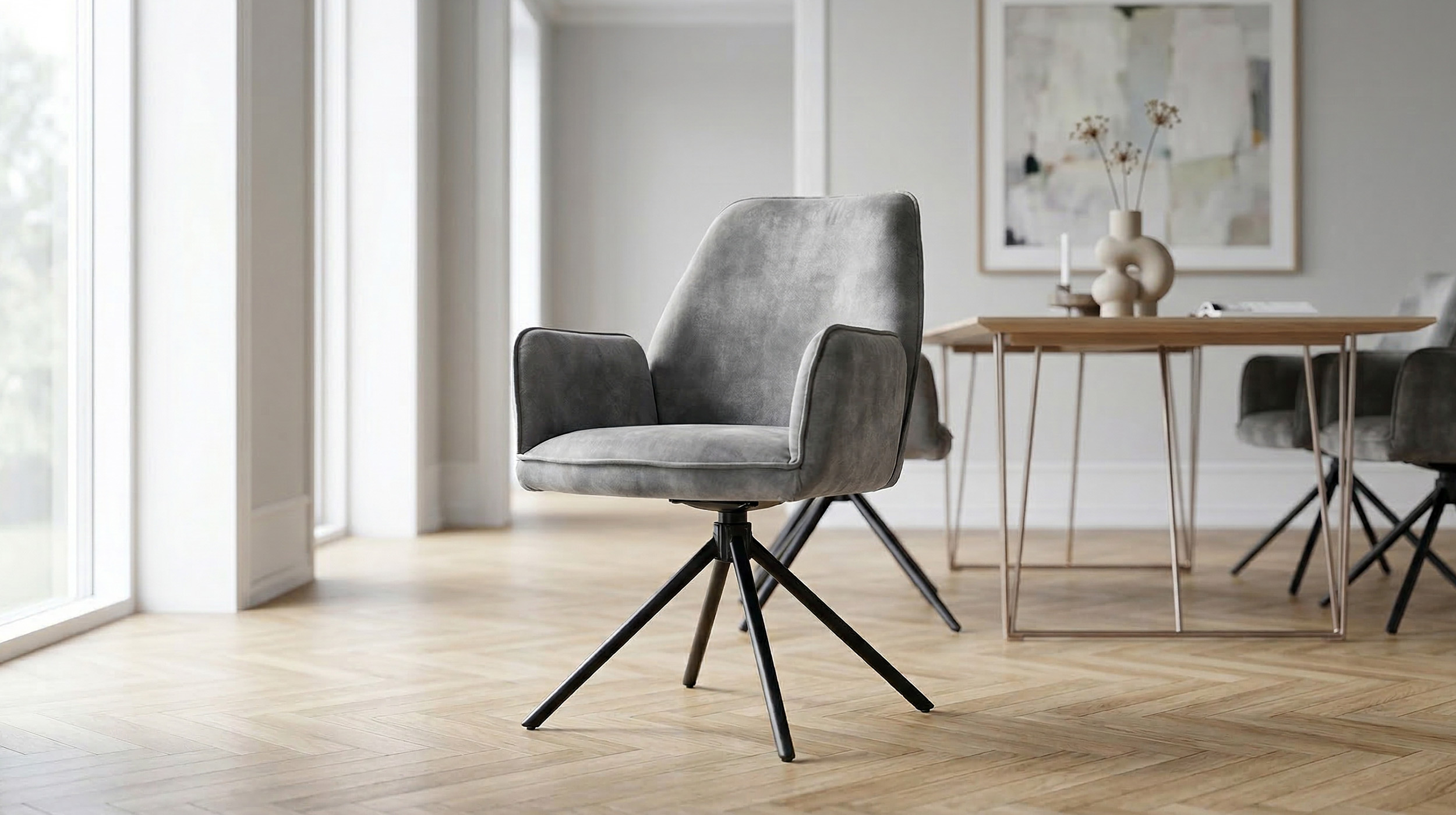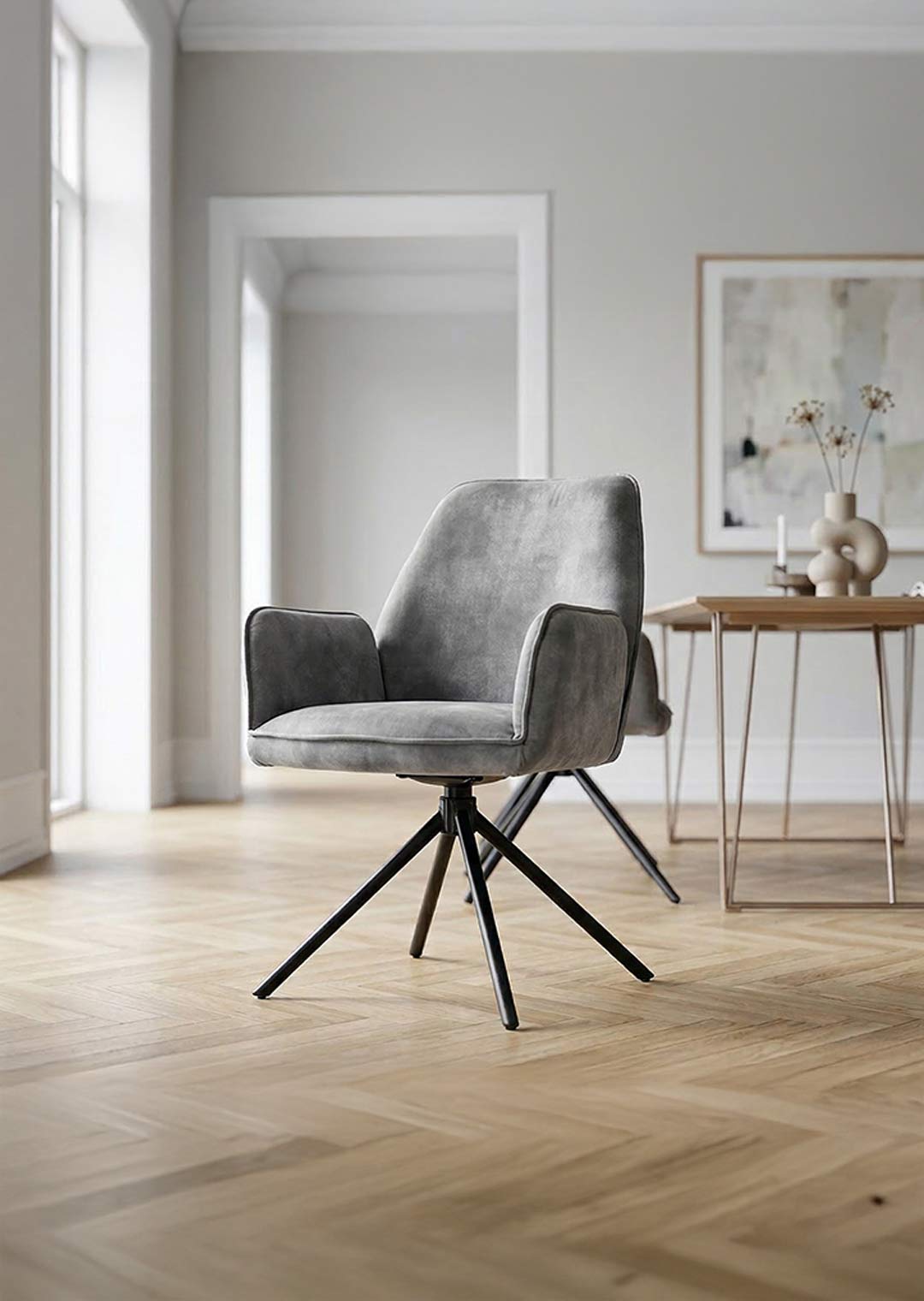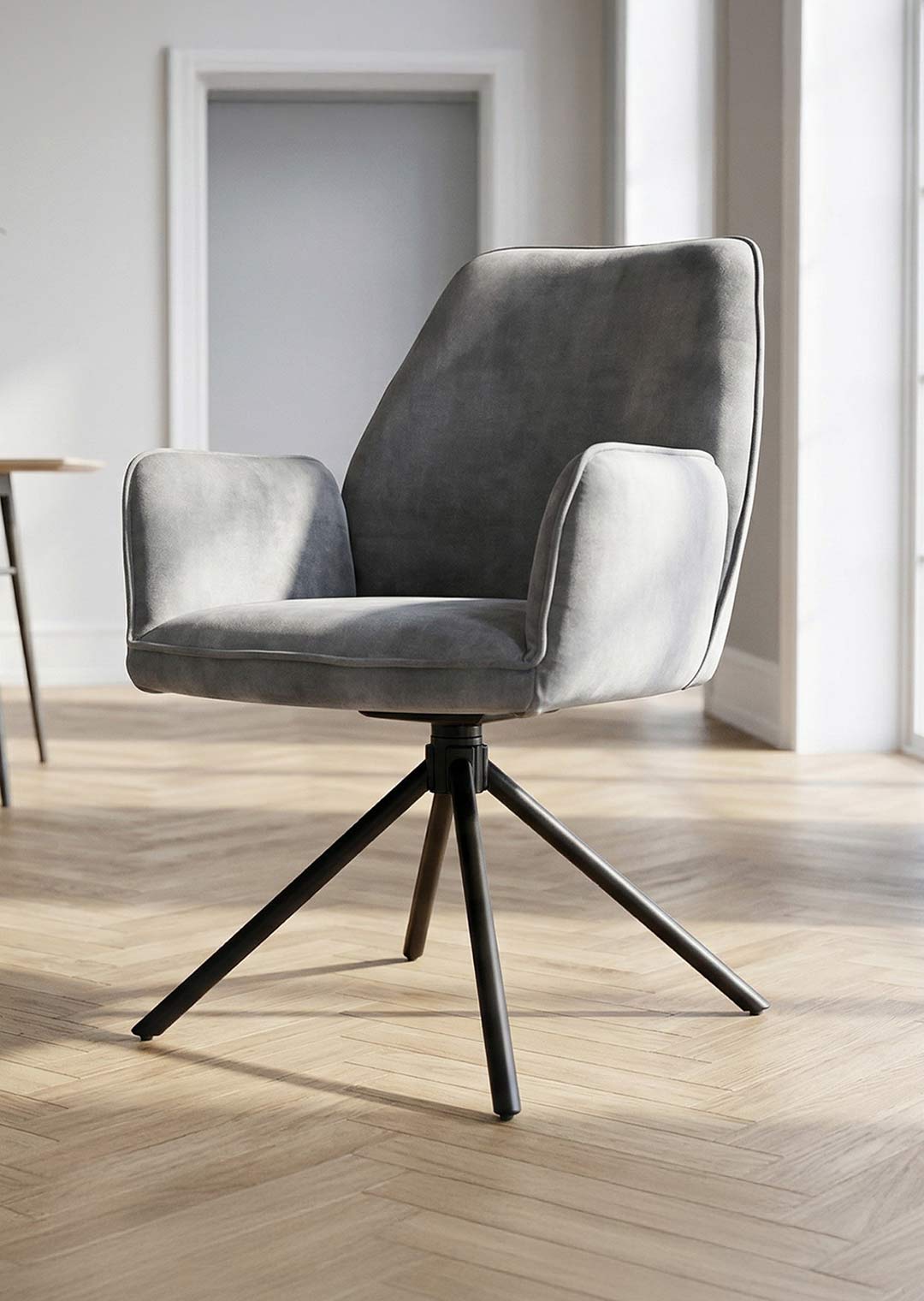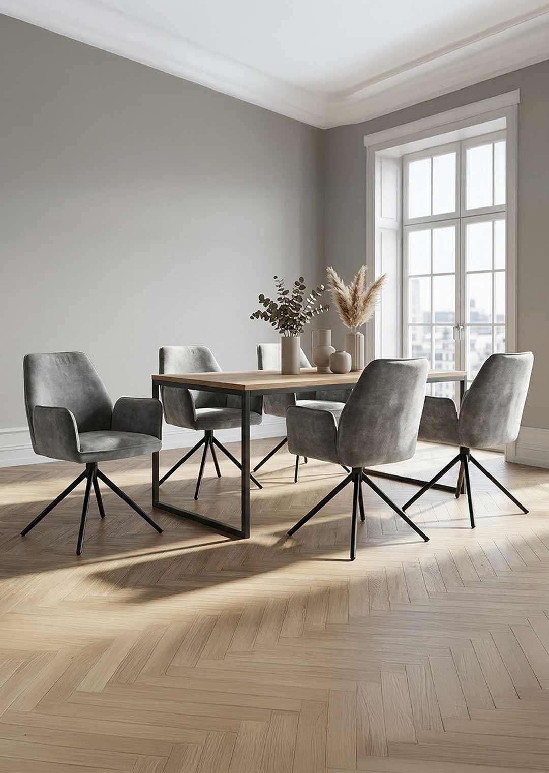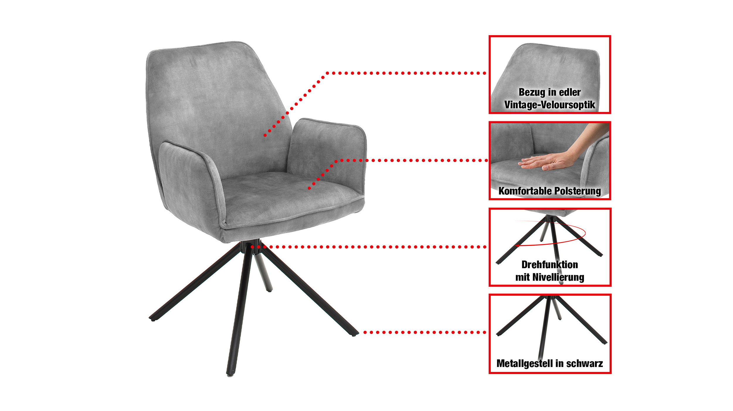 Der Armlehnstuhl überzeugt aber nicht nur optisch, sondern auch durch seinen Sitzkomfort. Sitzfläche und Rückenlehne sind mit einer Schaumpolsterung ausgestattet, welche sich angenehm an den Körper anpasst und auch bei längerem Sitzen für Wohlbefinden sorgt. Ergonomisch geformte Armlehnen bieten zusätzlichen Komfort und laden dazu ein, sich entspannt zurückzulehnen. Mit einer Sitzhöhe von etwa ca. 50 cm eignet sich dieser Stuhl ideal für Einsatz am Esstisch oder in der Leseecke. Ein besonderes Highlight ist die 180-Grad-Drehfunktion mit automatischer Nivellierung. Diese Funktion ermöglicht flexibles Bewegen und erlaubt Drehen nach Belieben, ohne an Stabilität einzubüßen. Nach jeder Drehung kehrt Stuhl automatisch in die Ausgangsposition zurück. Dieser Armlehnstuhl vereint Komfort, Stil und Funktionalität in einem Möbelstück.