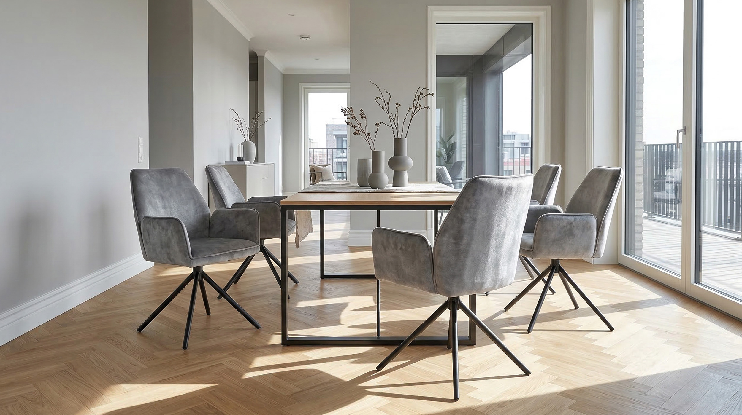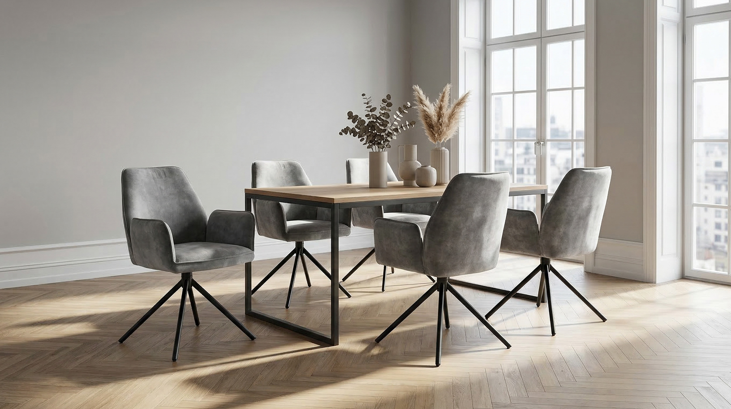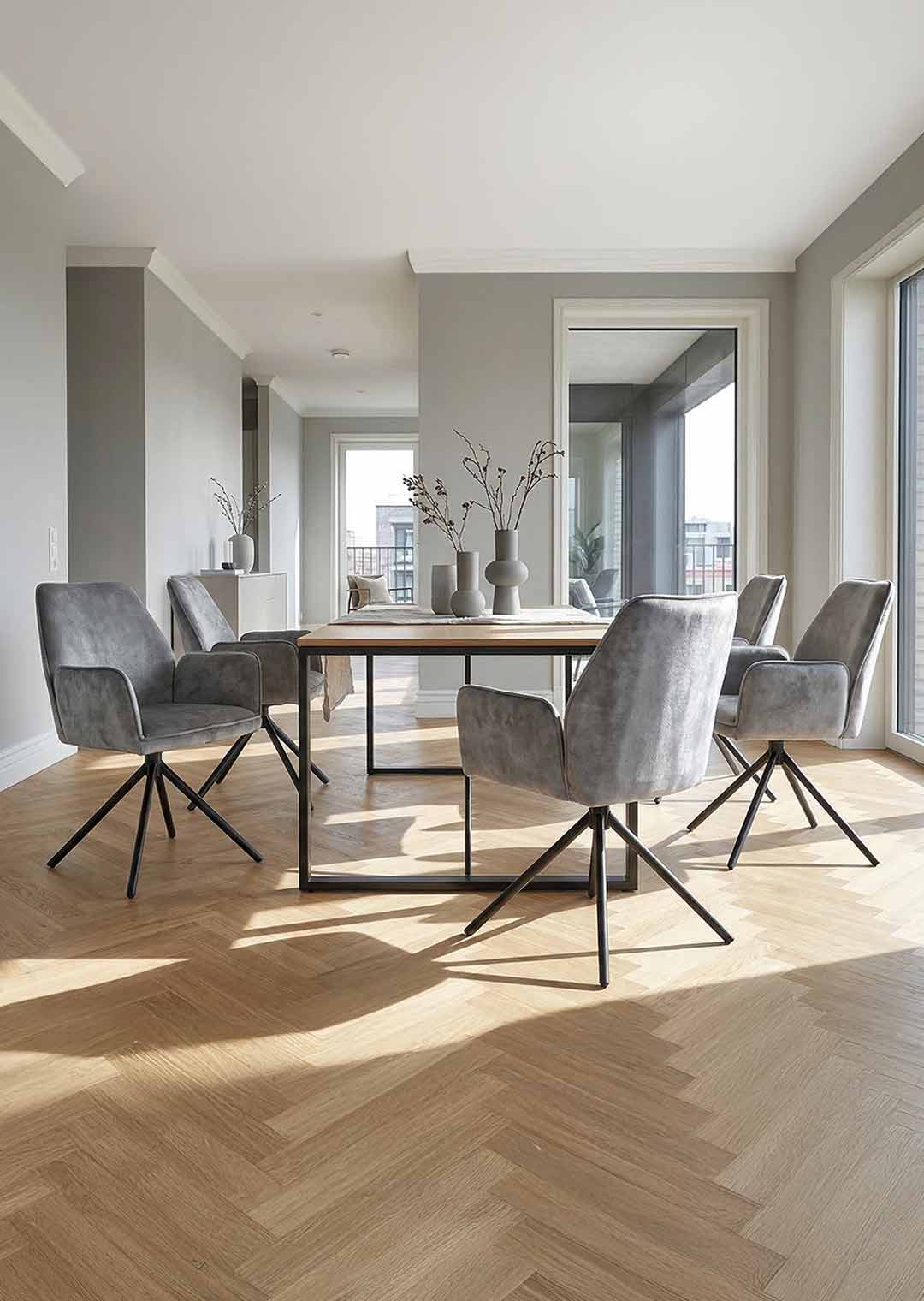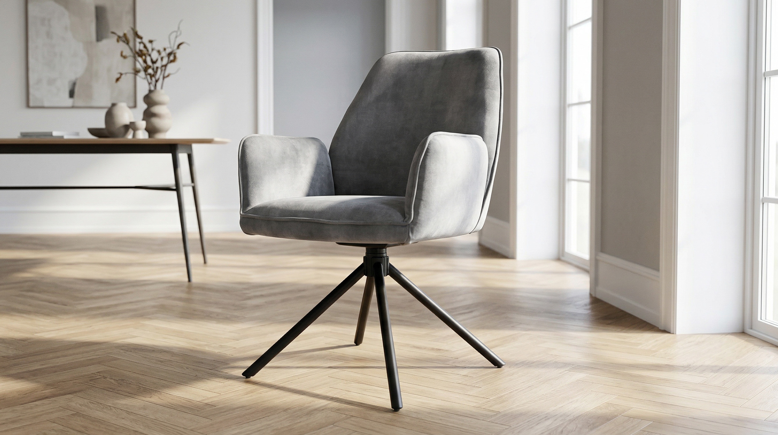 Der Armlehnstuhl überzeugt aber nicht nur optisch, sondern auch durch seinen Sitzkomfort. Sitzfläche und Rückenlehne sind mit einer Schaumpolsterung ausgestattet, welche sich angenehm an den Körper anpasst und auch bei längerem Sitzen für Wohlbefinden sorgt. Ergonomisch geformte Armlehnen bieten zusätzlichen Komfort und laden dazu ein, sich entspannt zurückzulehnen. Mit einer Sitzhöhe von etwa ca. 50 cm eignet sich dieser Stuhl ideal für Einsatz am Esstisch oder in der Leseecke. Ein besonderes Highlight ist die 180-Grad-Drehfunktion mit automatischer Nivellierung. Diese Funktion ermöglicht flexibles Bewegen und erlaubt Drehen nach Belieben, ohne an Stabilität einzubüßen. Nach jeder Drehung kehrt Stuhl automatisch in die Ausgangsposition zurück. Dieser Armlehnstuhl vereint Komfort, Stil und Funktionalität in einem Möbelstück.