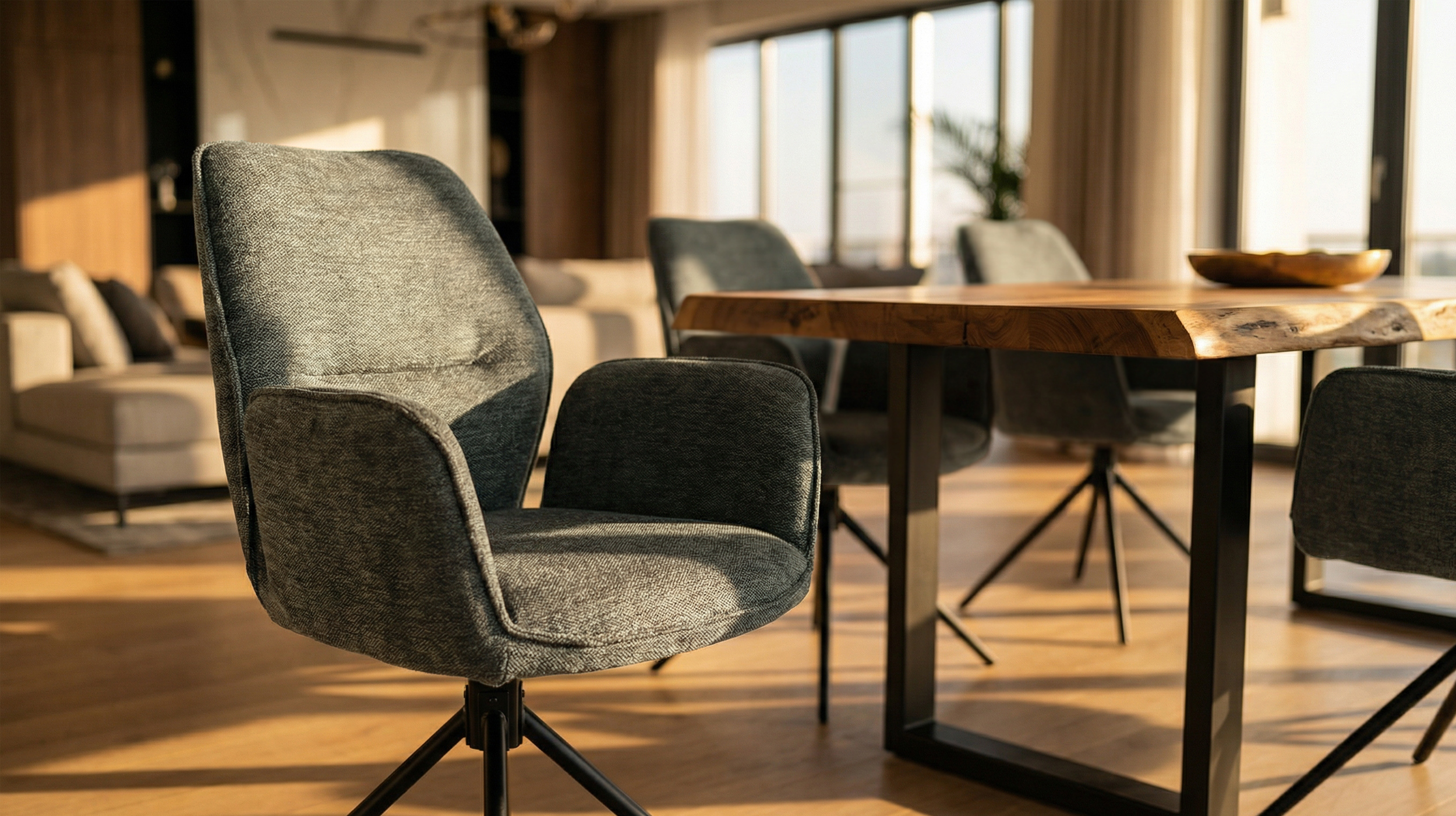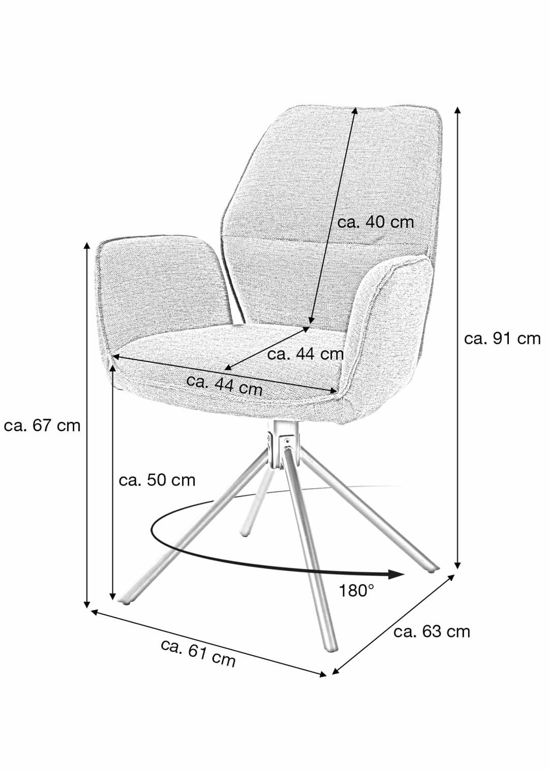 Neben seiner interessanten Erscheinung erleben Sie echten Sitzkomfort mit dem Armlehnstuhl GREYTON. Hierfür sorgen unter anderem die hohen, ergonomisch gestalteten Armlehnen, auf die Sie sich bequem stützen können. Der angenehm gepolsterte Sitz mit einer Sitzbreite und einer Sitztiefe von ca. 44 cm ermöglicht eine entspannte Sitzposition, sowohl beim schnellen Frühstück, als auch bei längeren, geselligen Abenden mit Familie und Freunden. GREYTON ist um 180 Grad drehbar, sodass Sie Bewegungsfreiheit am Esstisch genießen können. Und dank Nivellierung kehrt der Drehstuhl auch automatisch wieder in seine Ausgangsposition zurück.
