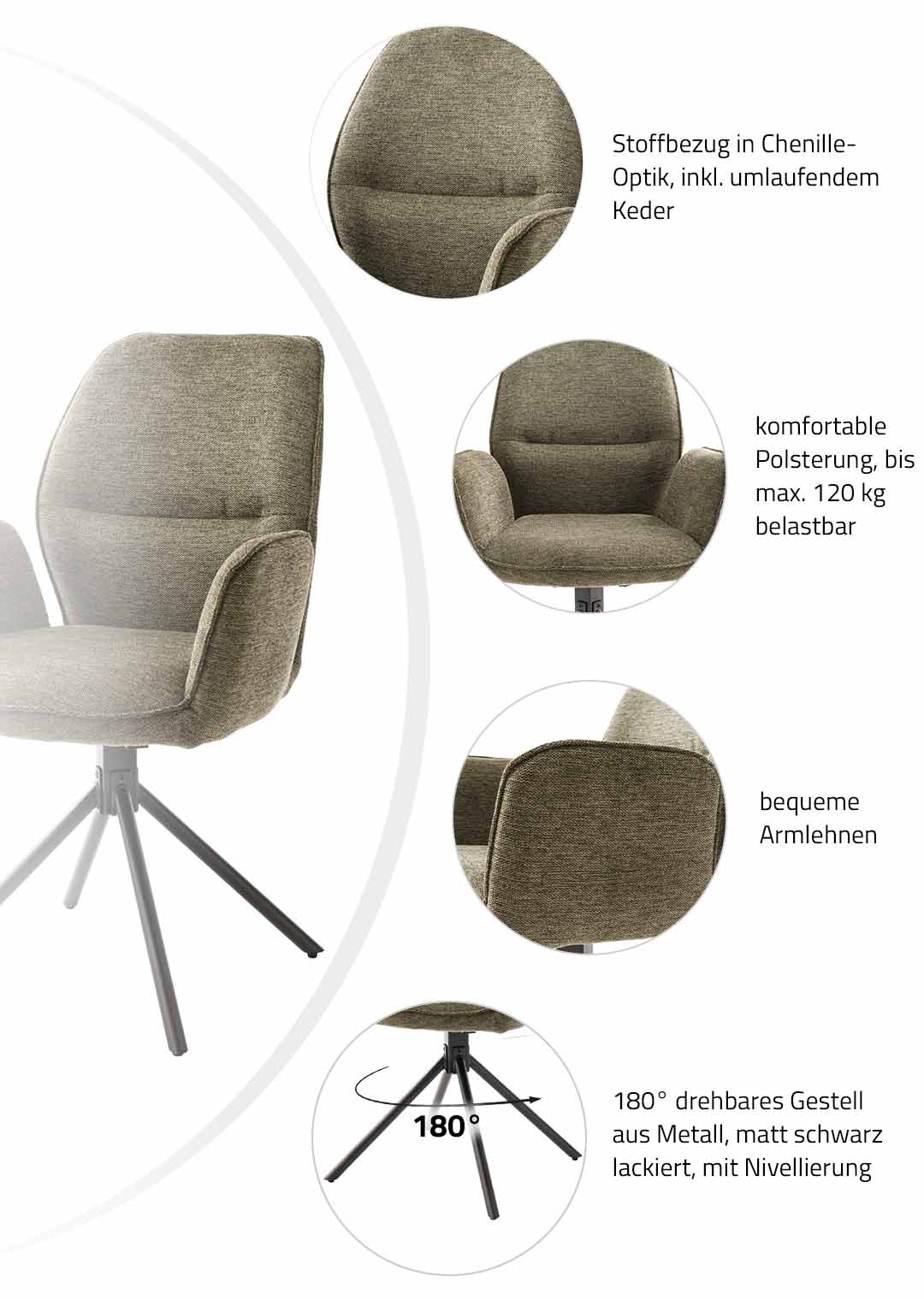 Armlehnstuhl olive Drehstuhl Stoffbezug Chenille Optik - GREYTON