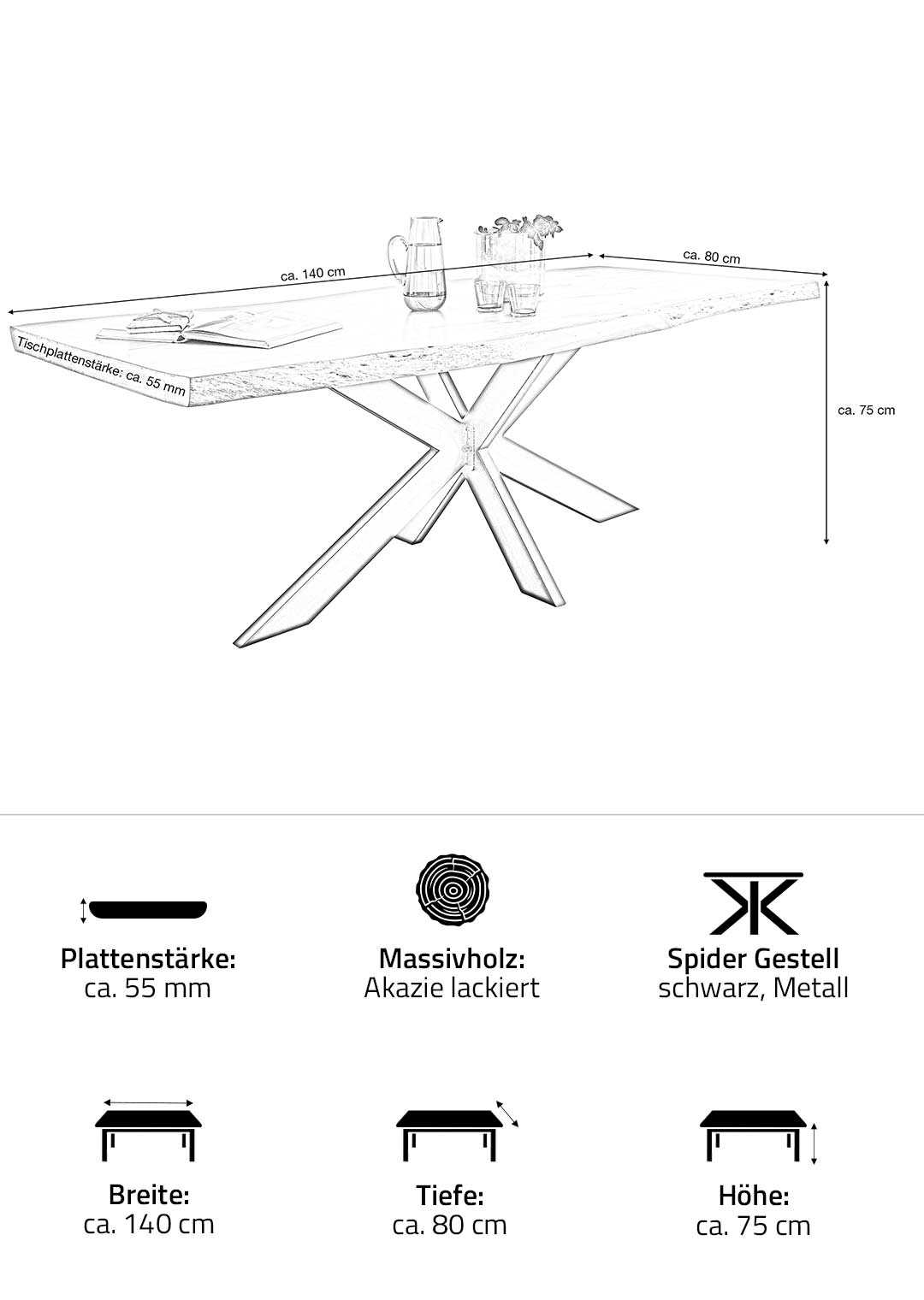 | Bestandteile | 1 Tischplatte Akazie lackiert Massivholz ca. 55 mm Stärke, 1 Spider-Gestell in Metall schwarz |