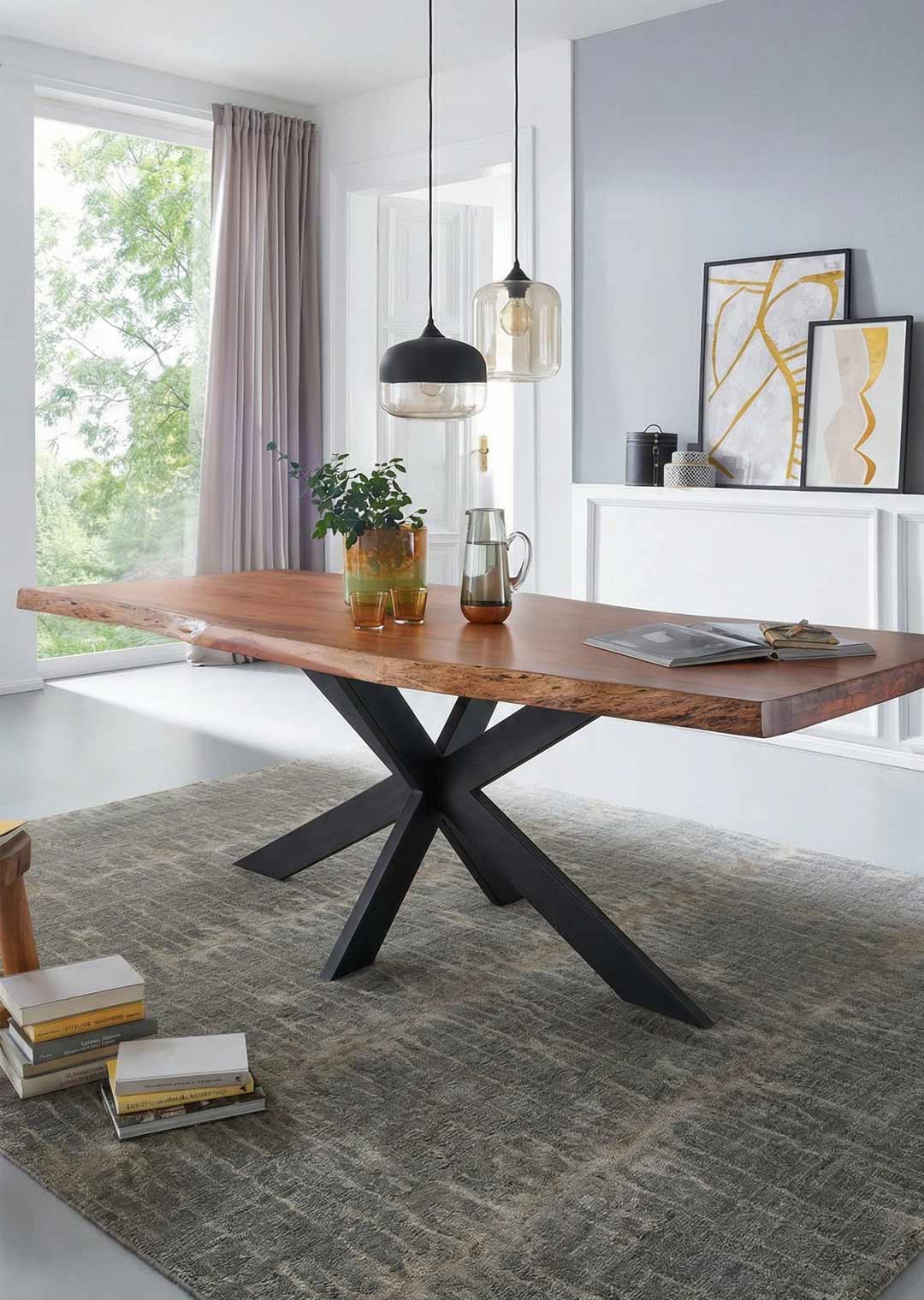 Jeder Baumkantentisch aus unserem Sortiment ist ein echtes Unikat – gefertigt aus massivem Akazienholz mit natürlicher Baumkante. Die individuelle Maserung, die warmen, rötlich-braunen Farbtöne und die markanten Strukturen machen jeden Massivholztisch zu einem stilvollen Highlight in Ihrem Esszimmer. Durch die Kombination von naturbelassenem Holz mit modernen Tischgestellen aus Metall, Eisen oder pulverbeschichtetem Stahl entsteht ein zeitloses Design, das rustikales Flair mit industriellem Chic verbindet.