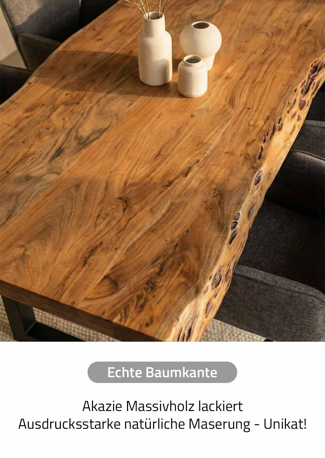 Entdecken Sie die natürliche Schönheit und Qualität eines Esstisches aus Akazienholz mit Baumkante – handgefertigt, nachhaltig und exklusiv bei MASSIVART.