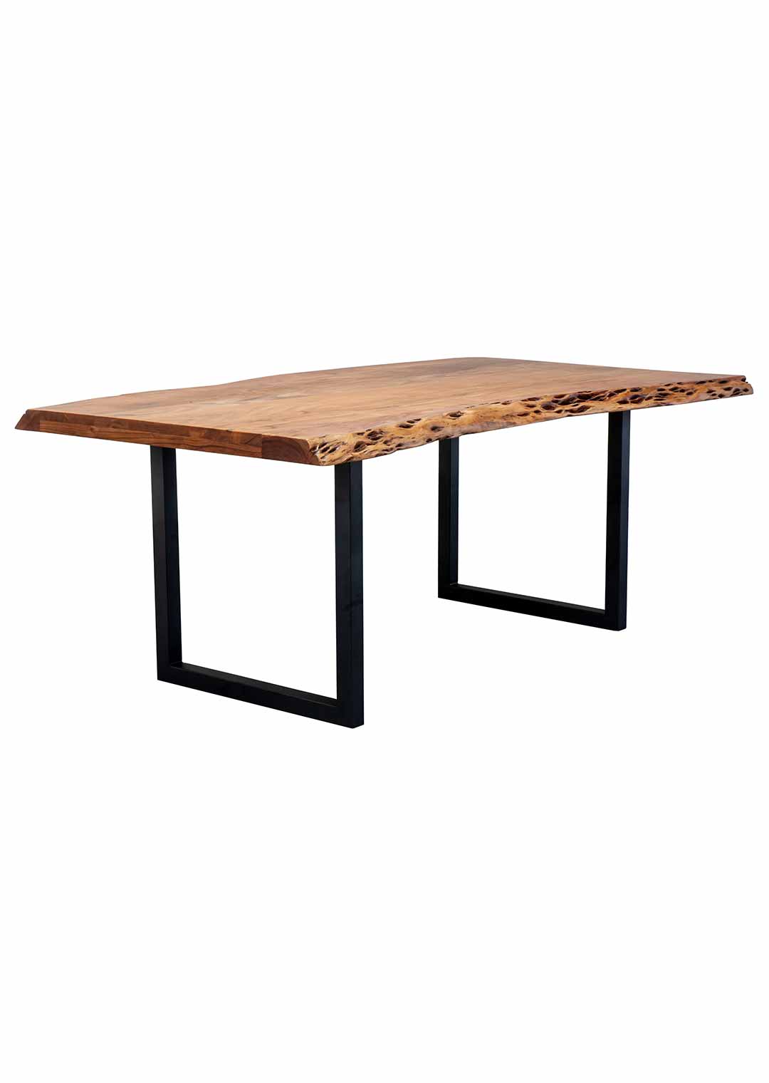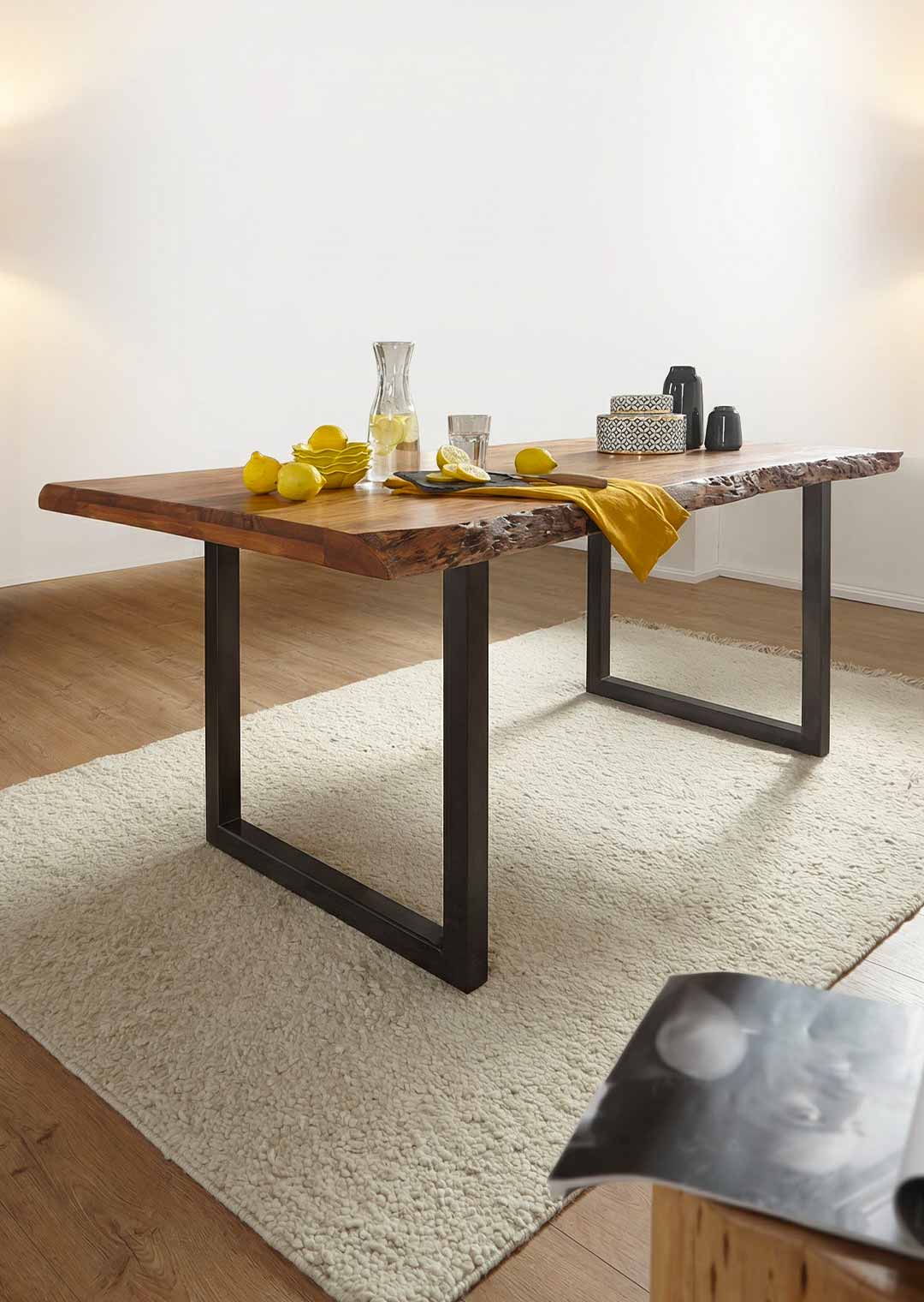 Der Baumkantentisch TICO bringt die lebendige Wärme echten Holzes mit der Klarheit moderner Formen zusammen. Die naturbelassene Tischkante folgt dem ursprünglichen Verlauf des Baumes und gibt dem Möbelstück seine charakterstarke Note. Das schwarz lackierte, U-förmige Metallgestell setzt einen kühlen Kontrast zur warmen Ausstrahlung des Akazienholzes und sorgt gleichzeitig für zuverlässige Stabilität. Ein Möbelstück, das Ursprünglichkeit und modernes Design stilvoll vereint.