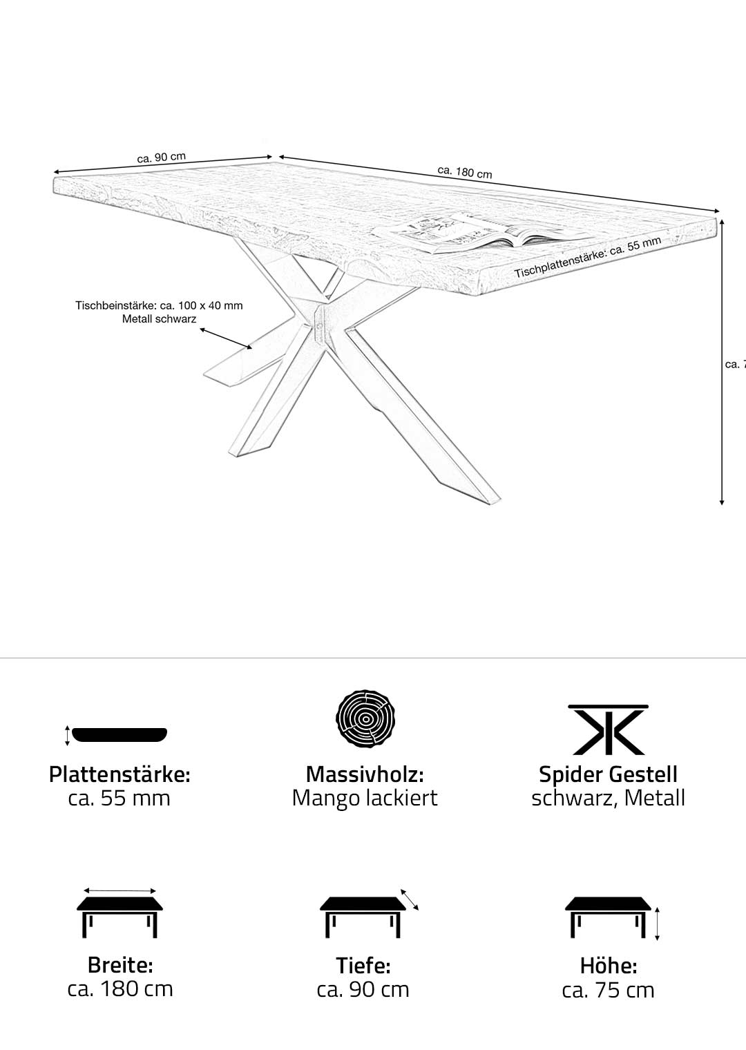 | Bestandteile | 1 Tischplatte Mango lackiert Massivholz ca. 55 mm Stärke, 1 Spider-Gestell in Metall schwarz |