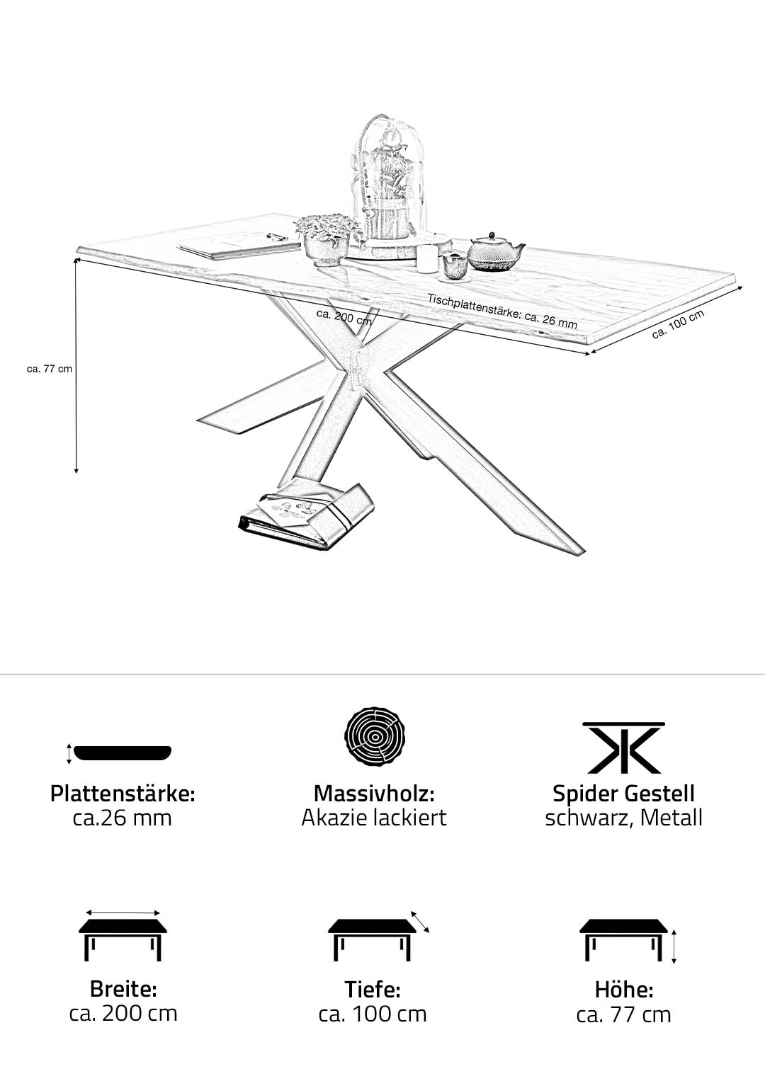 Die ca. 200 x 100 cm große Tischplatte aus massiver Akazie bietet ausreichend Platz für bis zu sechs Personen. Ihre Stärke von ca. 26 mm verleiht dem Tisch eine solide Erscheinung. Das besondere Spider-Gestell mit zusammenlaufenden Metallstreben gewährleistet nicht nur einen sicheren Stand, sondern rundet das moderne Design stimmig ab. Die lackierte Oberfläche schützt das Holz und macht es besonders pflegeleicht – ideal für den Alltag.