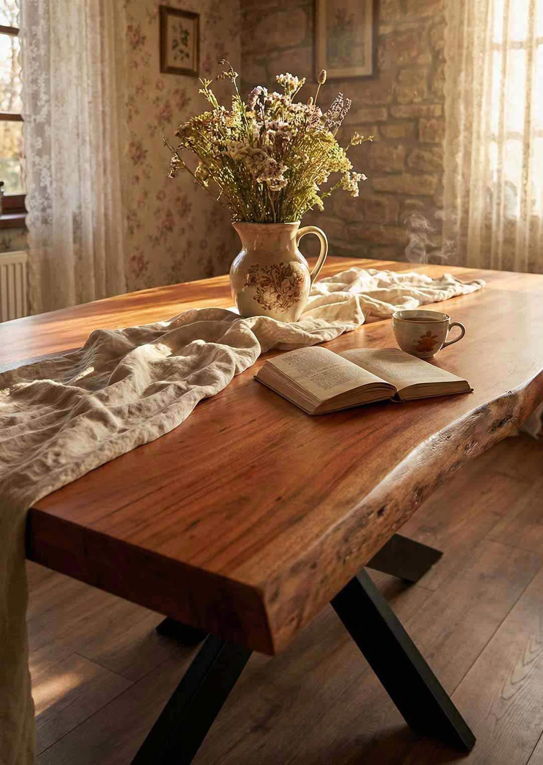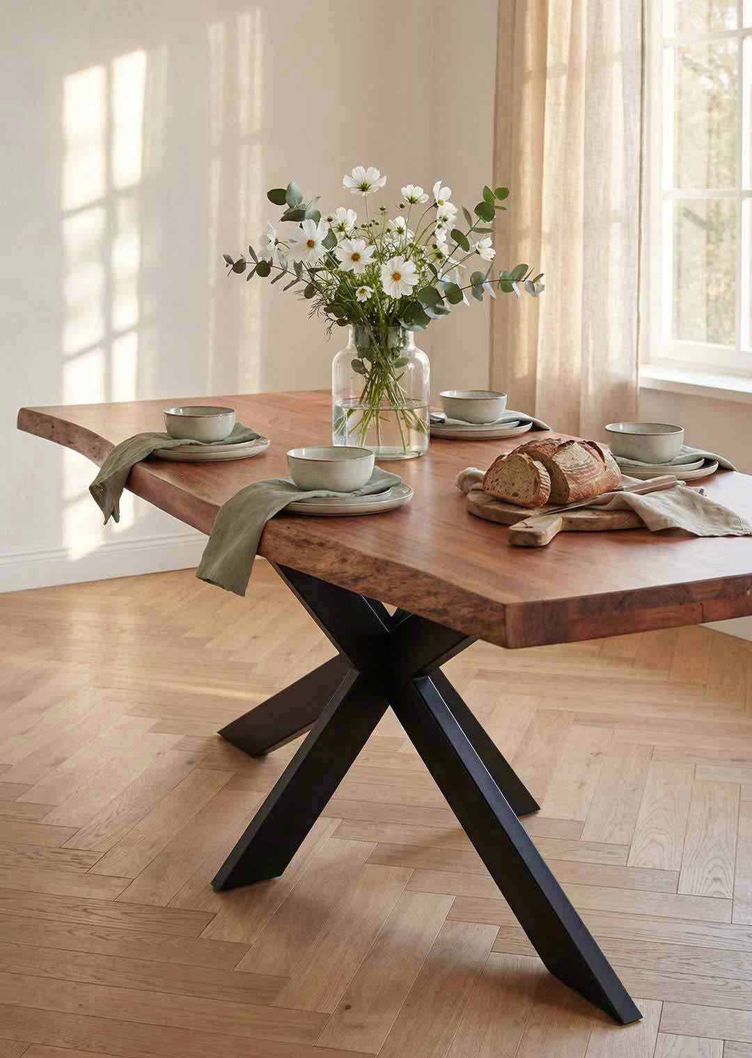 Jetzt ist Ihr neuer Massivholz-Esstisch mit natürlicher Baumkante bereit, stilvoll in Szene gesetzt zu werden. Platzieren Sie ihn an einem zentralen Ort in Ihrem Zuhause und verleihen Sie Ihrem Essbereich eine warme, einladende Atmosphäre. Laden Sie Freunde und Familie ein und genießen Sie gemeinsame Momente an einem Tisch, der Charakter zeigt – stabil, natürlich und von Hand gefertigt. Ein Möbelstück, das Generationen überdauern kann.