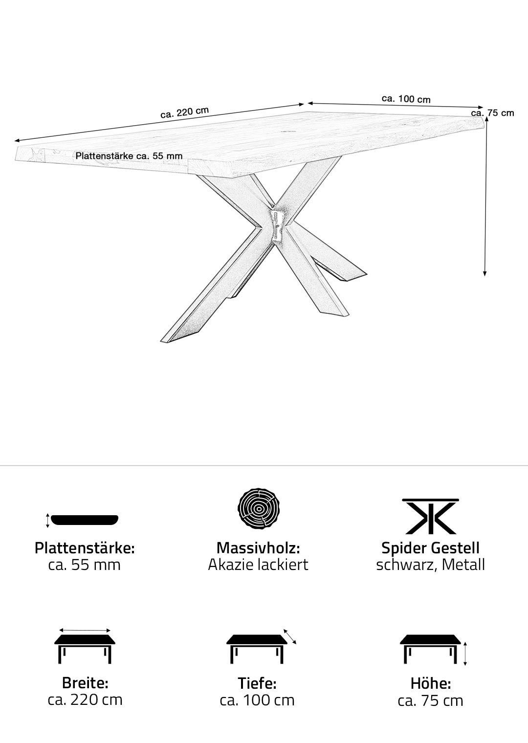 | Bestandteile | 1 Tischplatte Akazie lackiert Massivholz ca. 55 mm Stärke, 1 Spider-Gestelll in Metall schwarz |