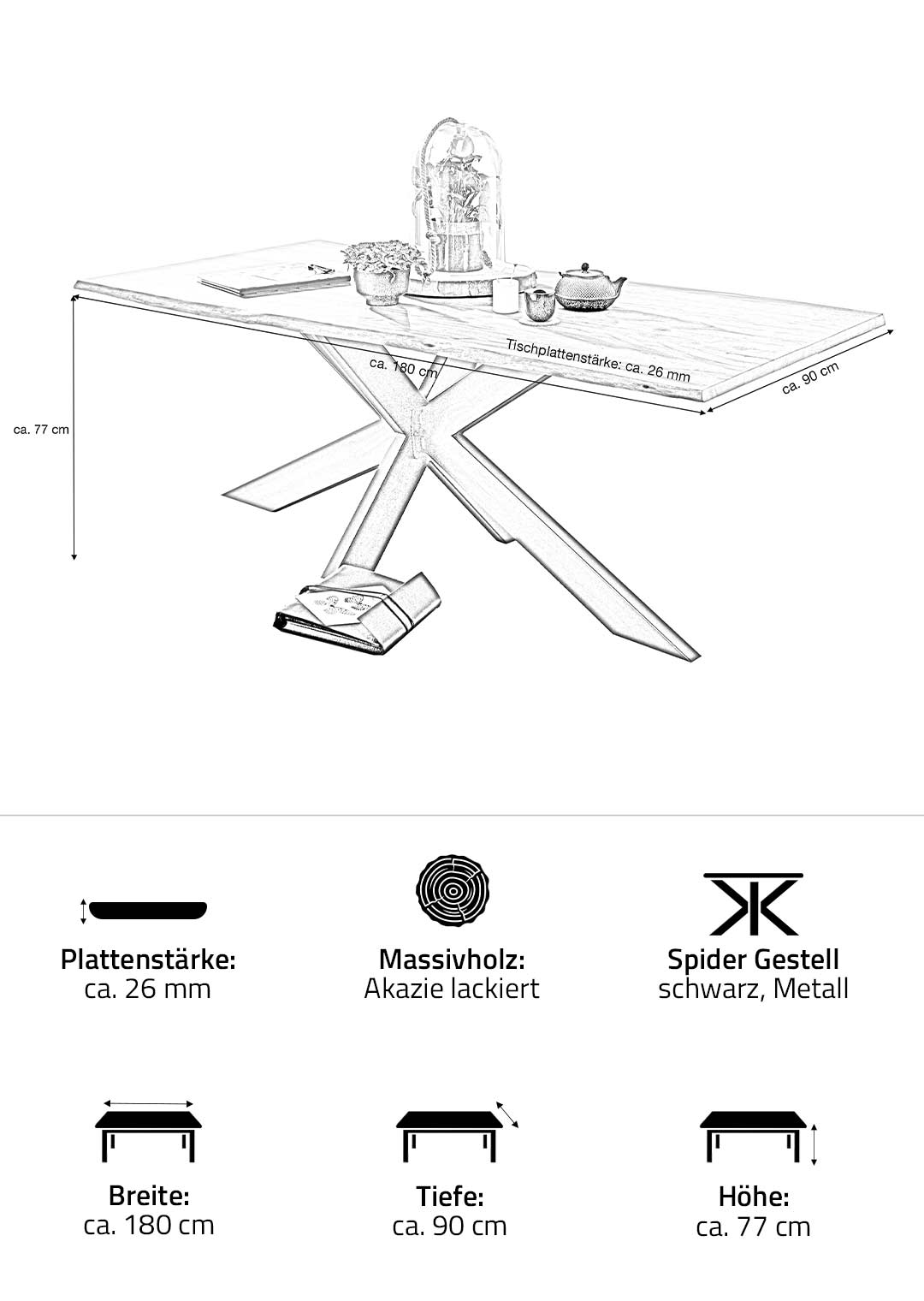 Die ca. 180 x 90 cm große Tischplatte aus massiver Akazie bietet ausreichend Platz für bis zu sechs Personen. Ihre Stärke von ca. 26 mm verleiht dem Tisch eine solide Erscheinung. Das besondere Spider-Gestell mit zusammenlaufenden Metallstreben gewährleistet nicht nur einen sicheren Stand, sondern rundet das moderne Design stimmig ab. Die lackierte Oberfläche schützt das Holz und macht es besonders pflegeleicht – ideal für den Alltag.