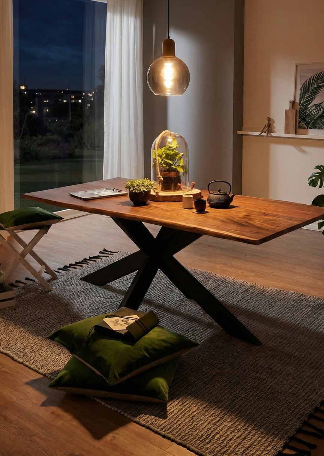 Jetzt ist Ihr neuer Massivholz-Esstisch mit natürlicher Baumkante bereit, stilvoll in Szene gesetzt zu werden. Platzieren Sie ihn an einem zentralen Ort in Ihrem Zuhause und verleihen Sie Ihrem Essbereich eine warme, einladende Atmosphäre. Laden Sie Freunde und Familie ein und genießen Sie gemeinsame Momente an einem Tisch, der Charakter zeigt – stabil, natürlich und von Hand gefertigt. Ein Möbelstück, das Generationen überdauern kann.