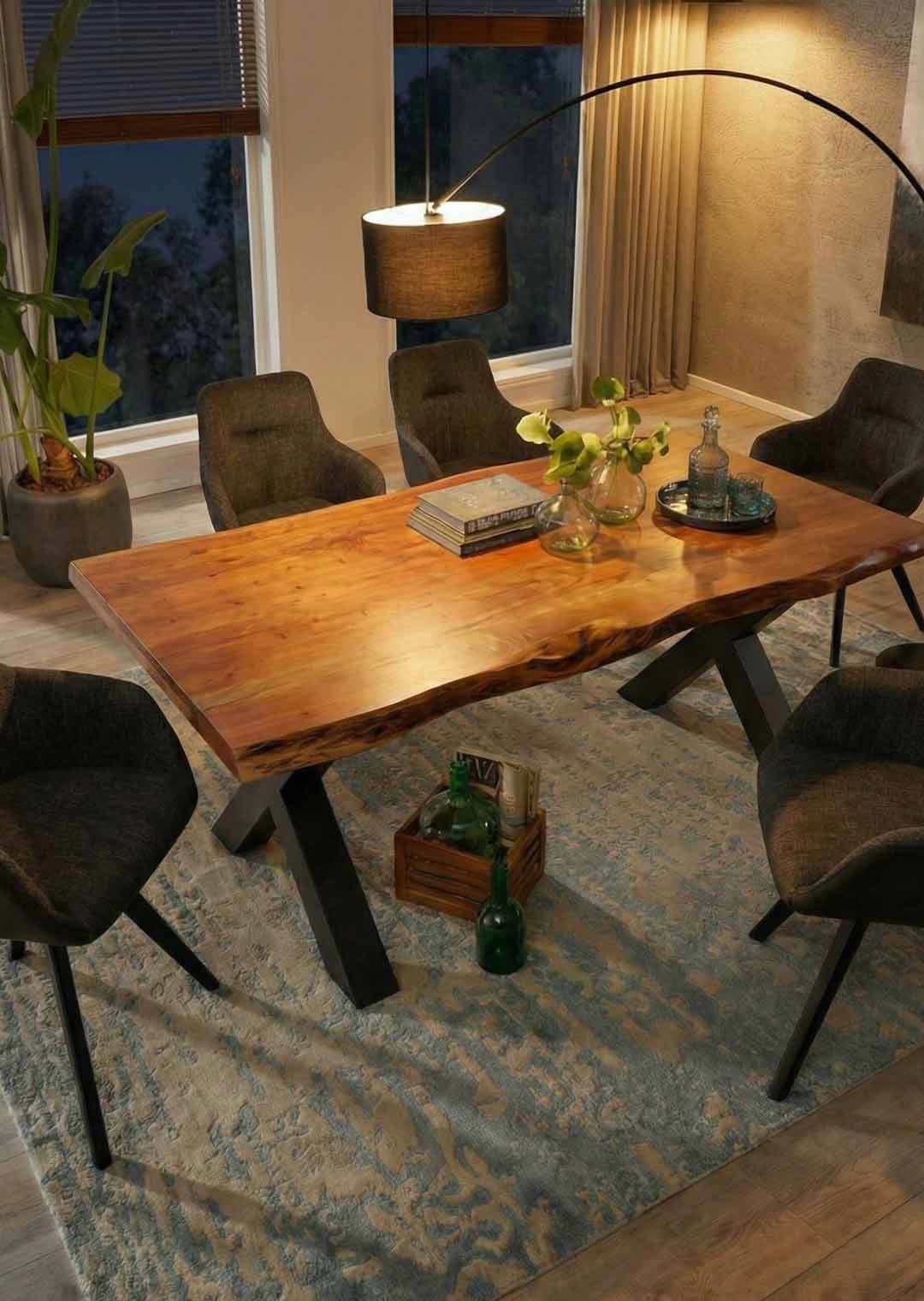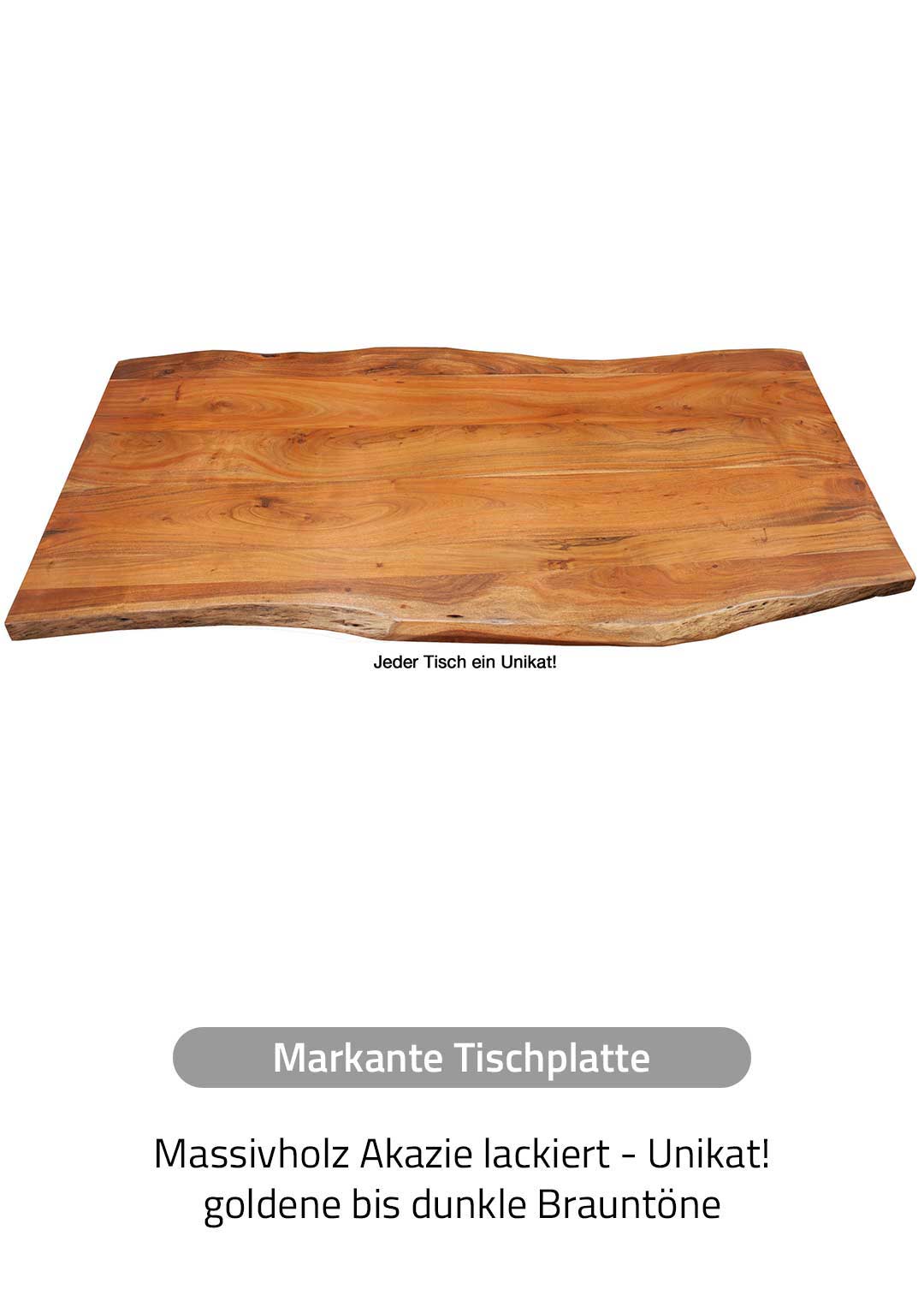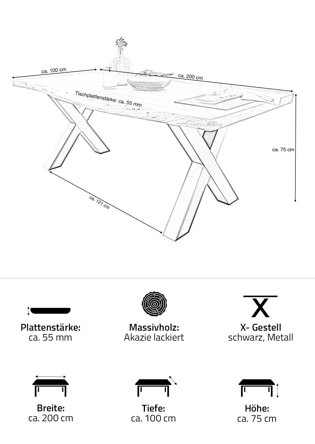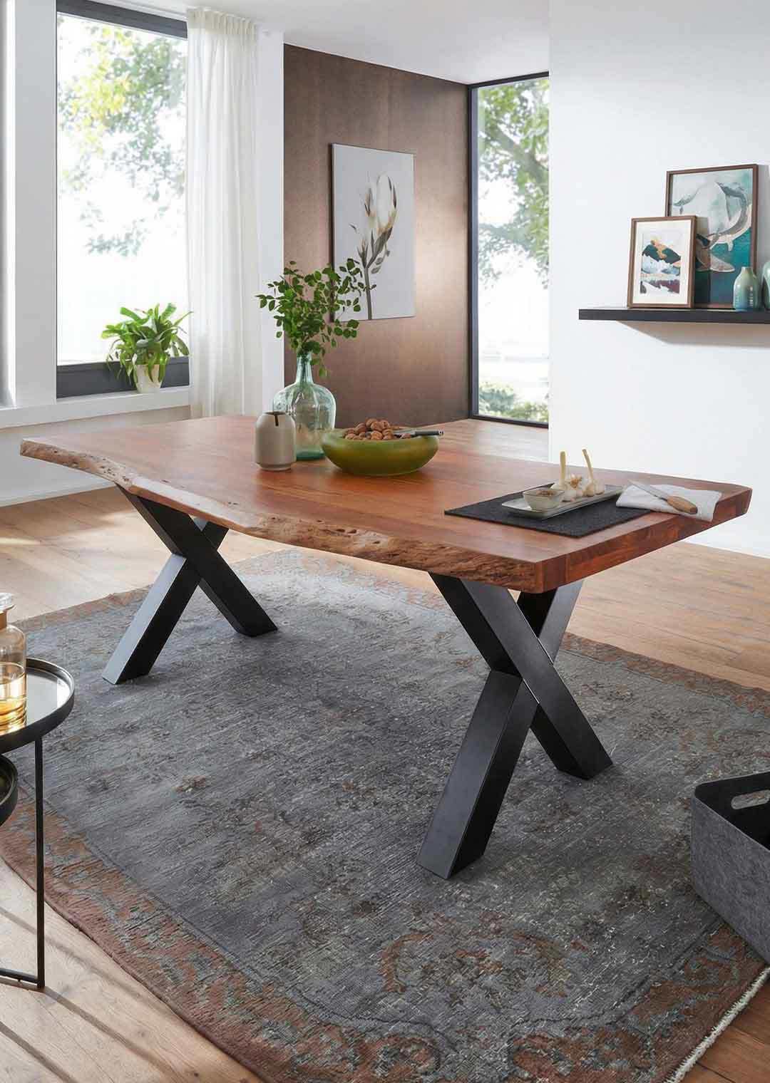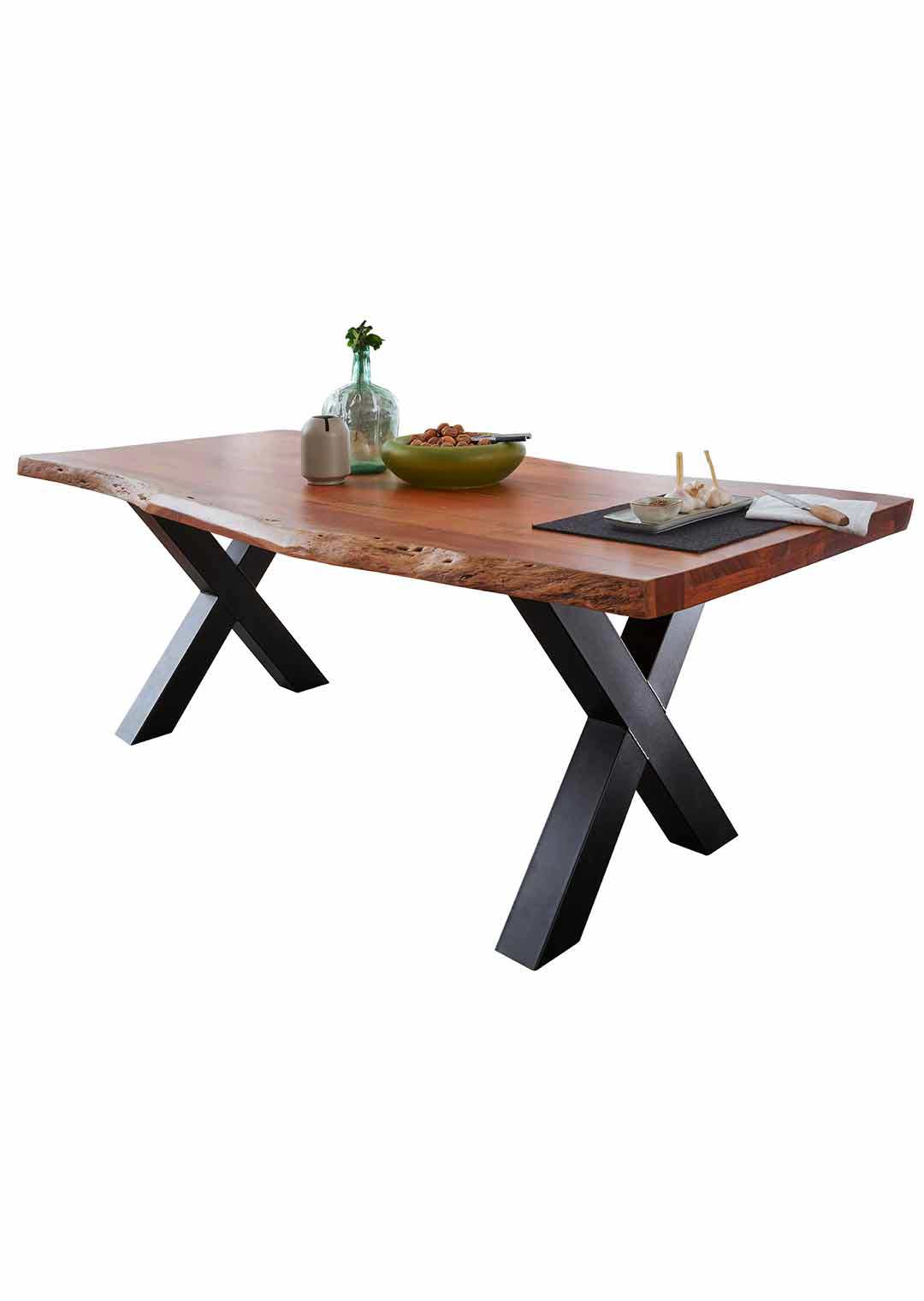 Baumkantentisch aus Akazie Massivholz 200 cm X-Gestell - TOMASO