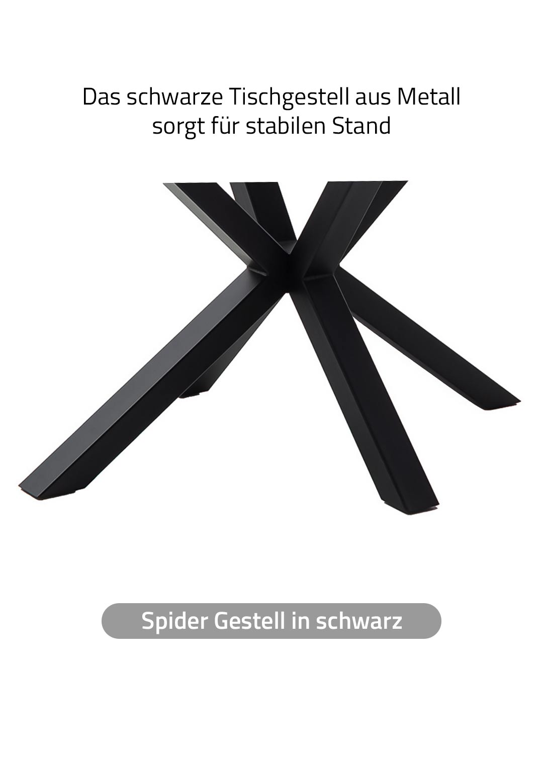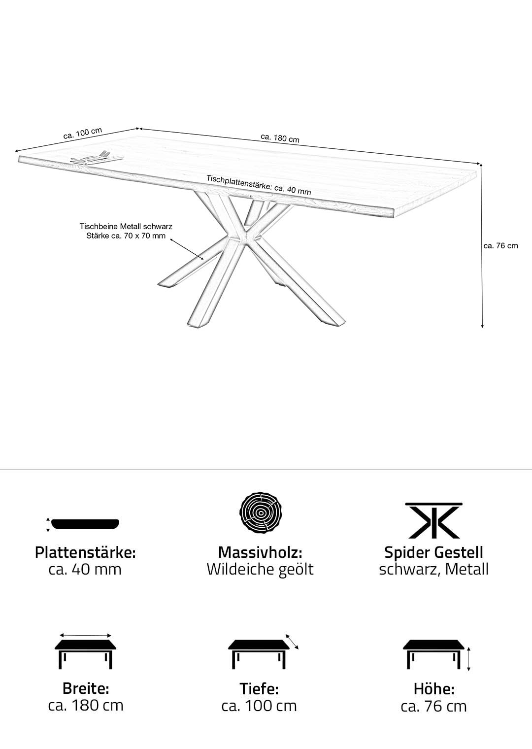 | Bestandteile | 1 Tischplatte in Wildeiche Massivholz geölt mit Baumkantenoptik, Spider-Gestell schwarz Metall |
