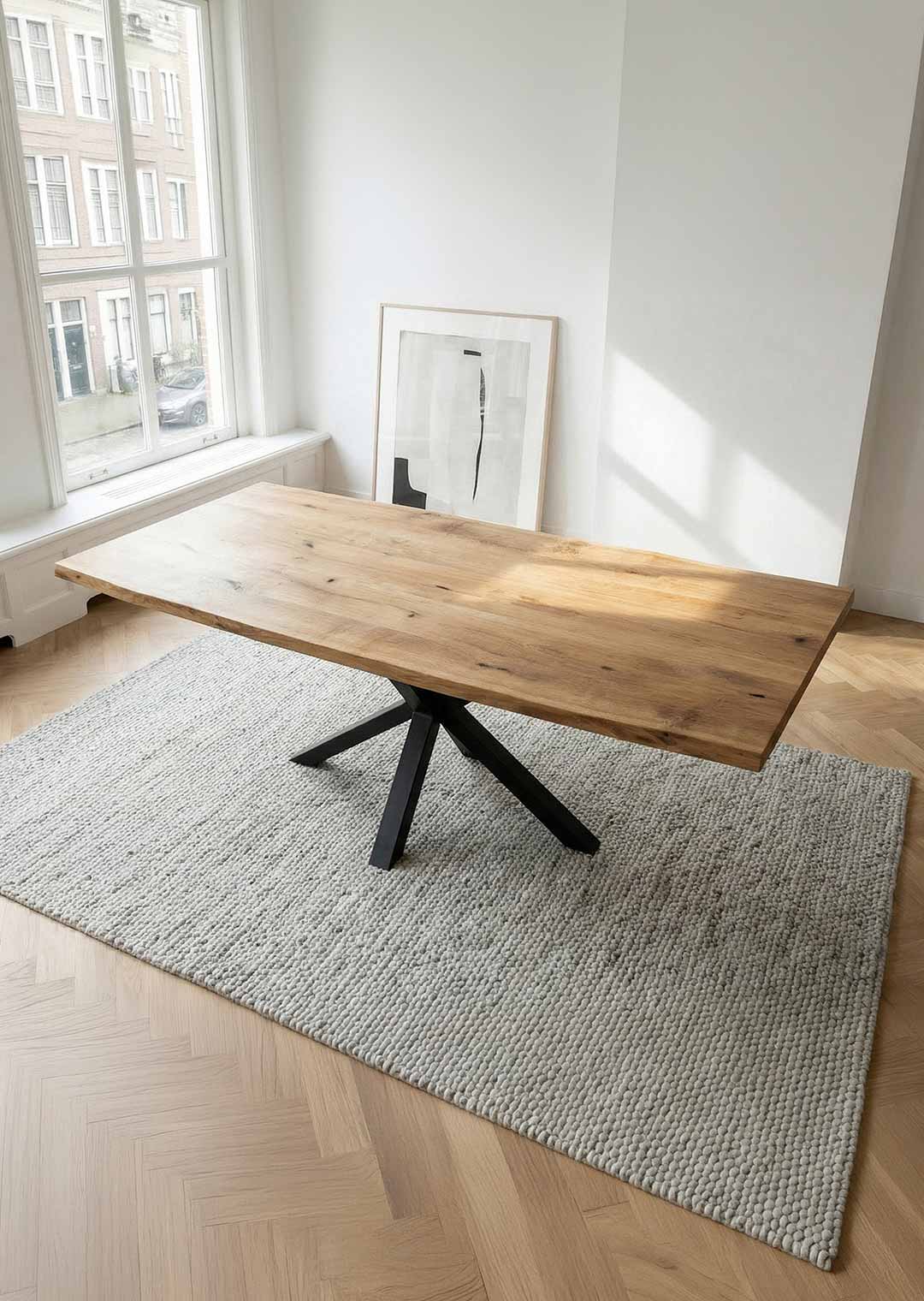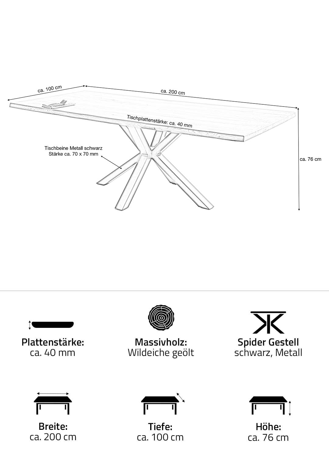 | Bestandteile | 1 Tischplatte in Wildeiche Massivholz geölt mit Baumkantenoptik, Spider-Gestell schwarz Metall |