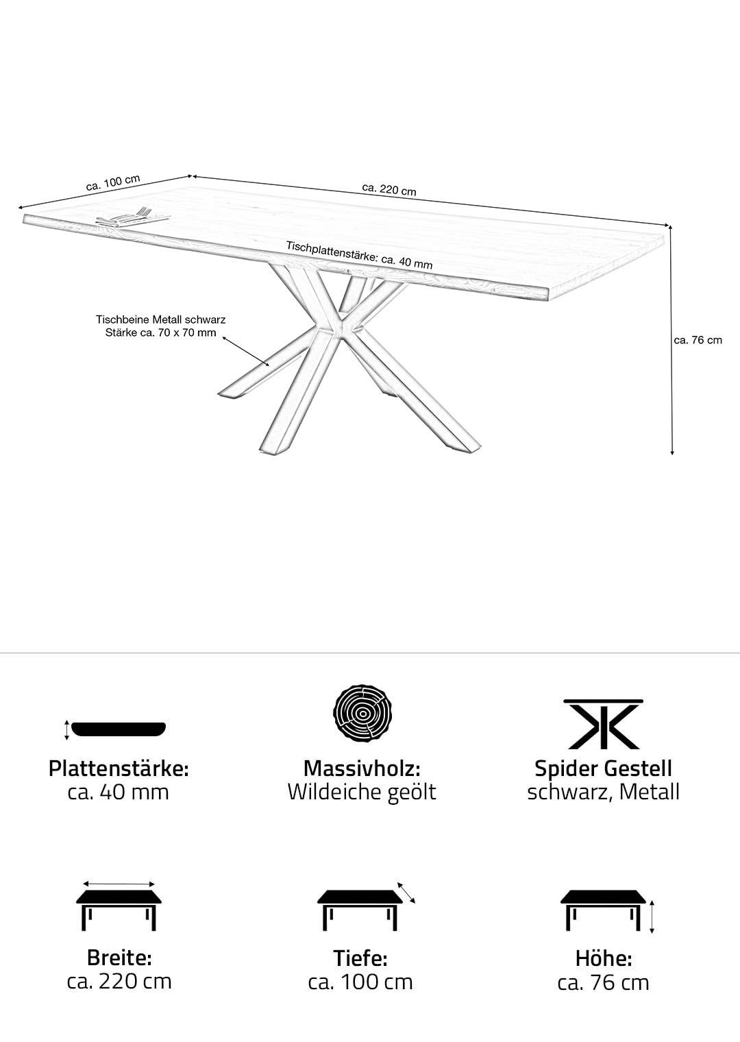 | Bestandteile | 1 Tischplatte in Wildeiche Massivholz geölt mit Baumkantenoptik, Spider-Gestell schwarz Metall |