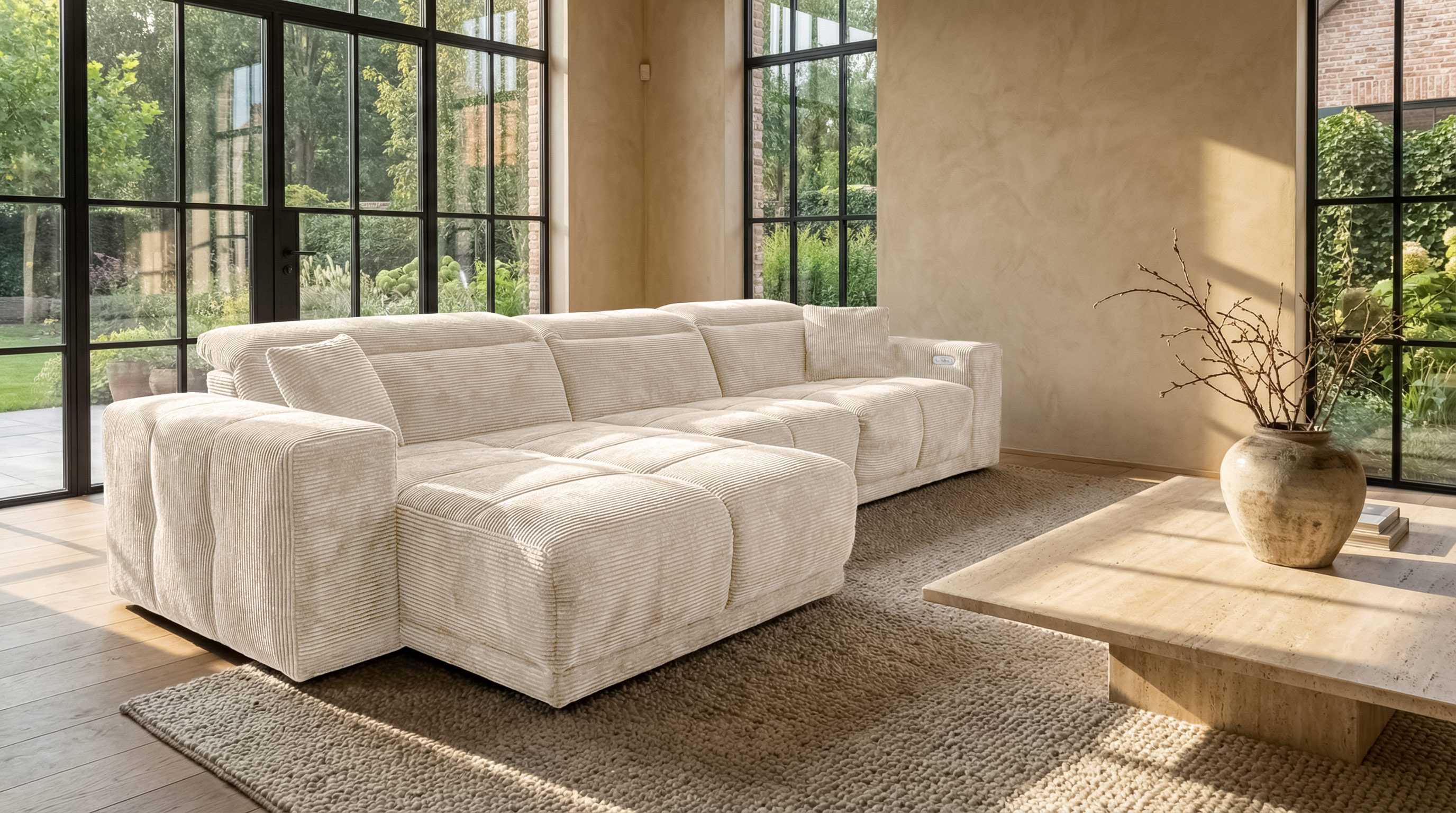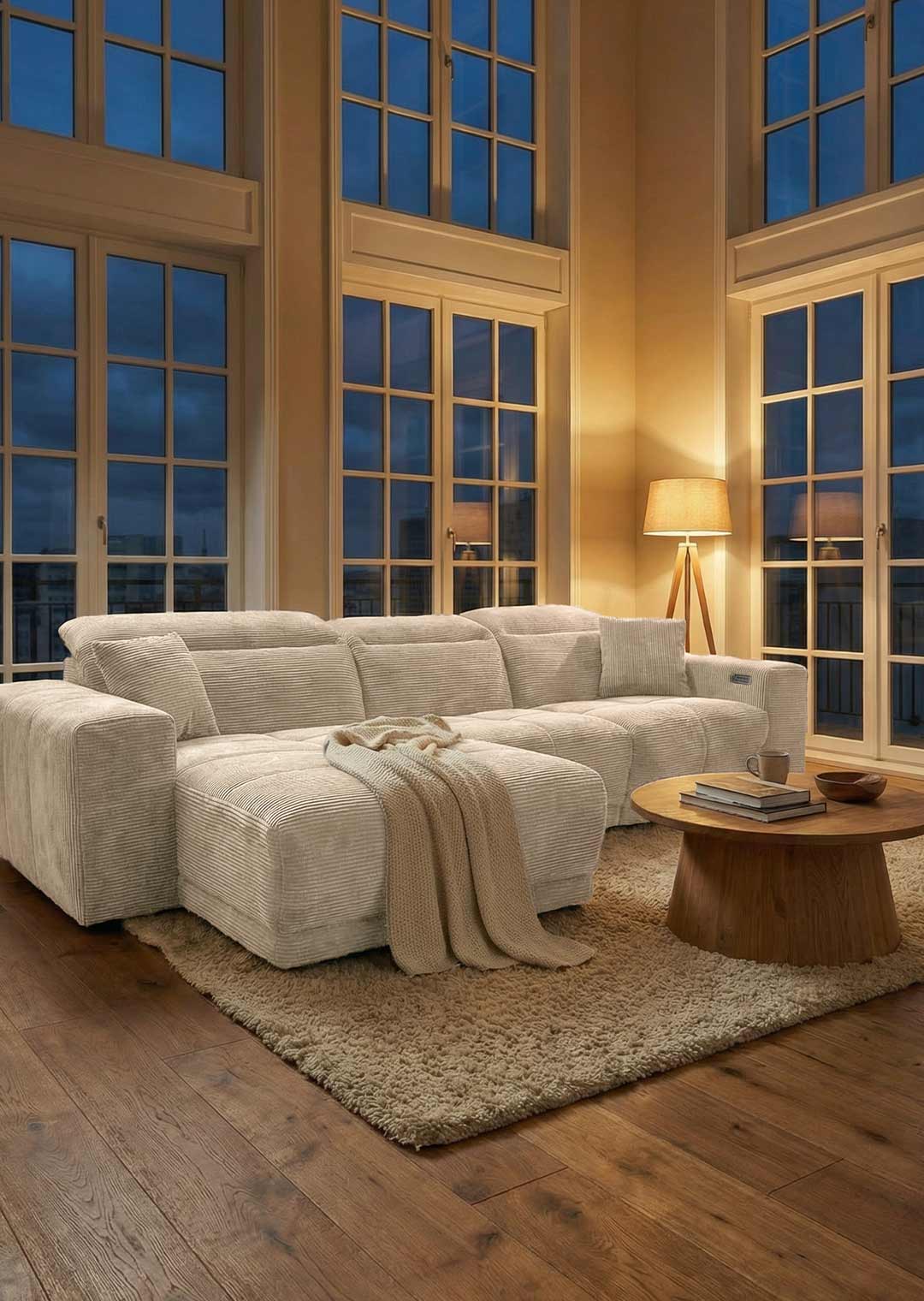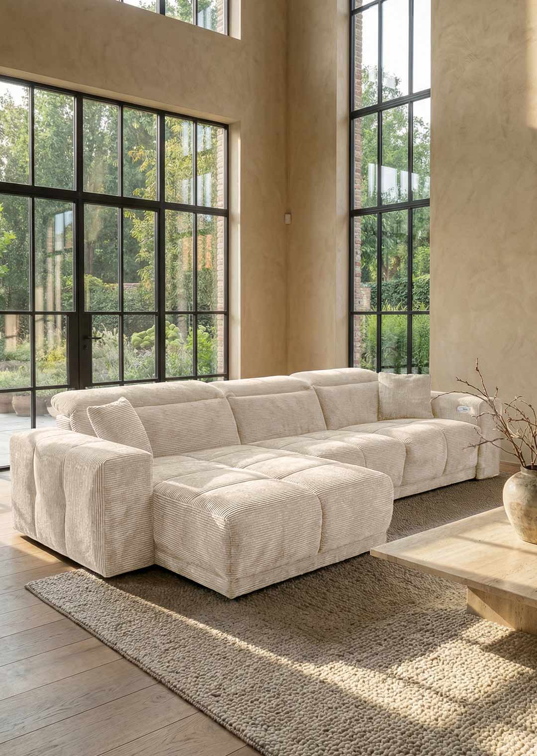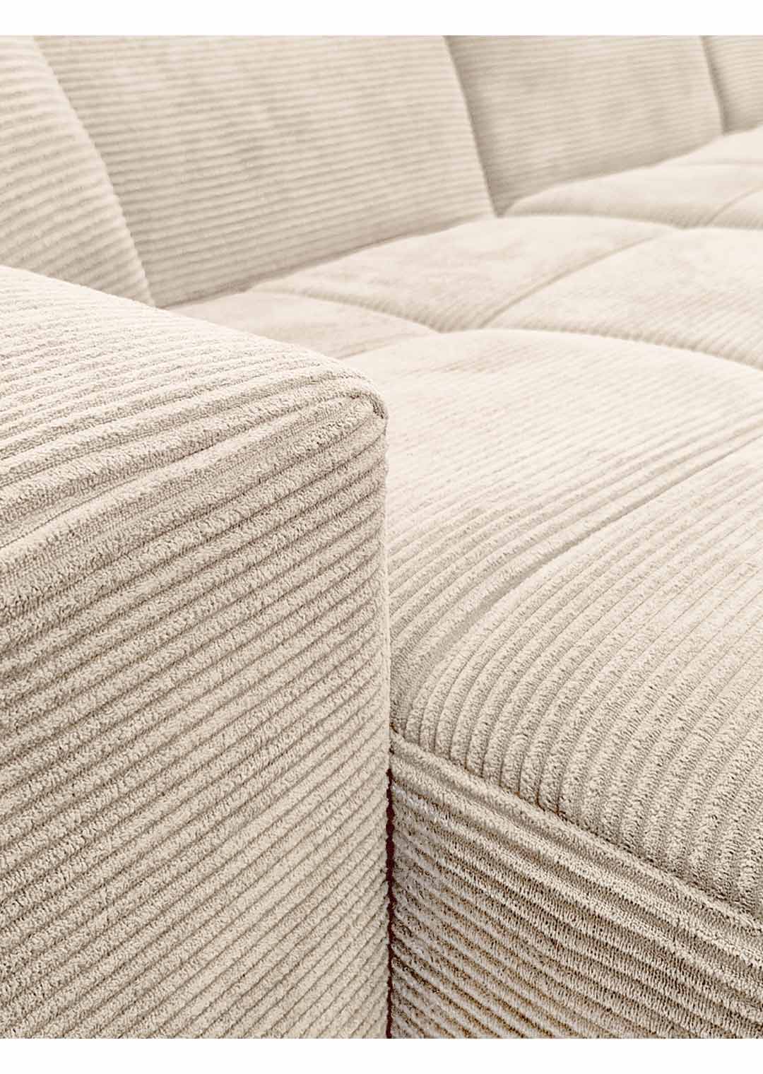 Das Ecksofa TONI wird dank seiner Funktionalitäten und seiner ansprechenden Optik im Handumdrehen zu Ihrem neuen Lieblingsplatz. Der trendige, feingerippte Cordbezug hat eine besonders weiche Haptik und strahlt eine einladende Gemütlichkeit aus. In einem eleganten Beige hat das Sofa dabei eine ganz besondere Präsenz im Raum, ohne jedoch aufdringlich zu sein. Die moderne Optik wird durch die großen Steppungen unterstrichen. Perfekt abgerundet wird das Design dieses Ecksofas durch die schwarzen Füße, die sich harmonisch in das Gesamtbild einfügen. Das Ecksofa TONI zieht garantiert alle Blicke auf sich. Der Rücken ist echt bezogen und ermöglicht es Ihnen, das Sofa auch frei im Raum zu platzieren - ideal für eine offene, individuelle Raumgestaltung.