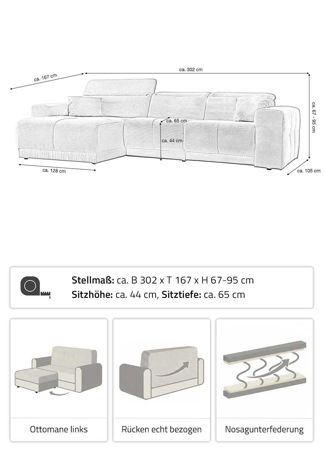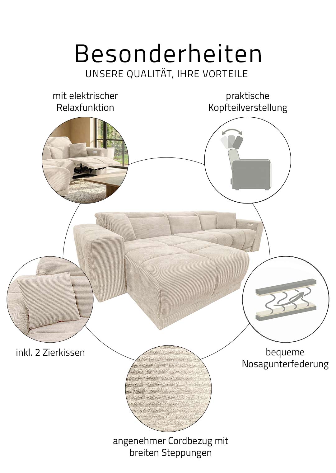 Ecksofa Cord beige 302 x 167 cm mit Relaxfunktion - OT links - TONI
