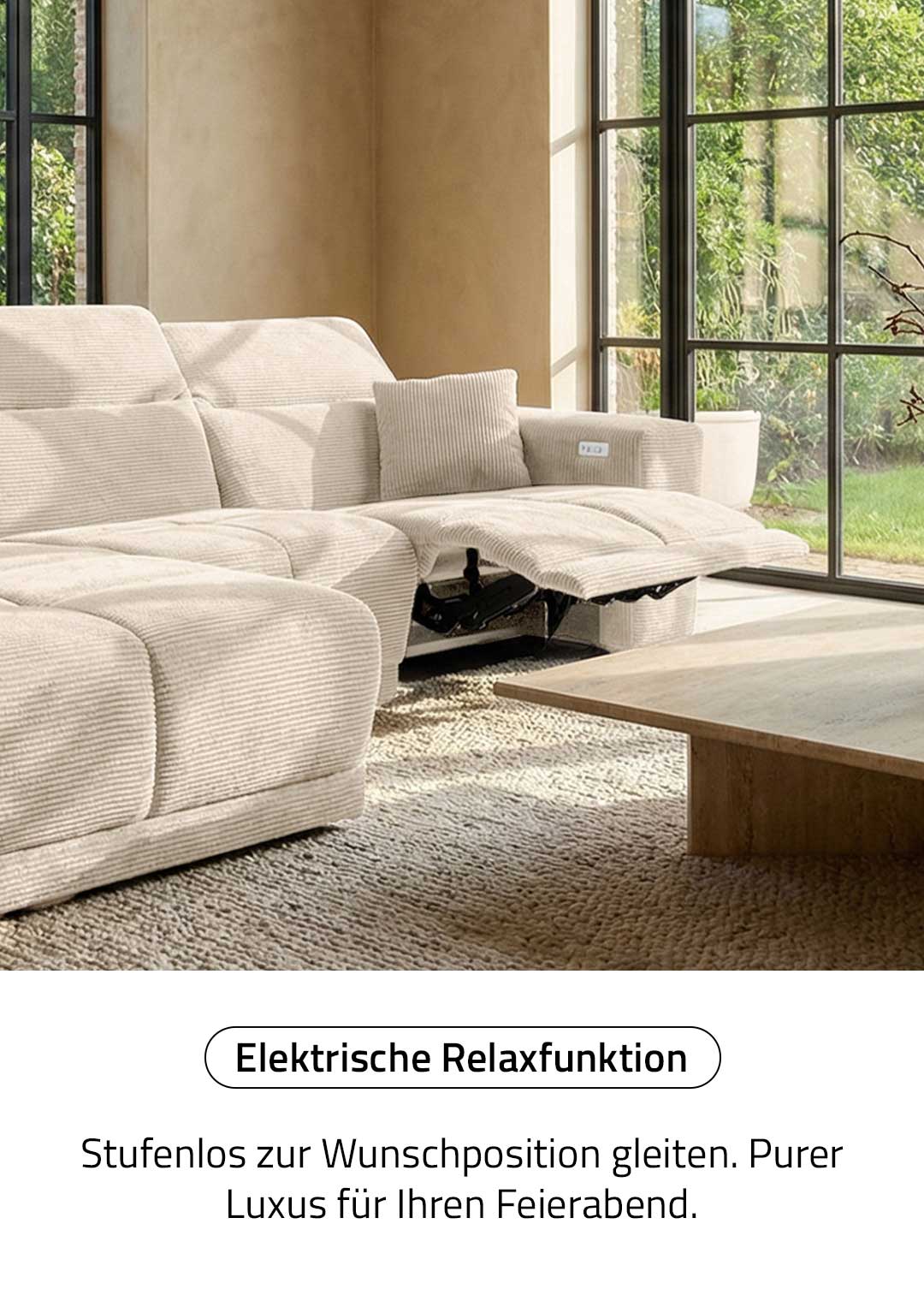 Das Sofa bietet mit einer Breite von ca. 302 cm richtig viel Platz für die ganze Familie, oder einfach zum gemütlichen Ausstrecken. Dabei lädt es nicht nur mit seinen großzügigen Maßen zum Relaxen ein. Ausgestattet mit einer elektrischen Relaxfunktion lässt sich der äußere 1-Sitzer per Knopfdruck in eine entspannende Position bringen. Lehnen Sie sich nach einem langen Tag mit einem guten Buch zurück und lassen Sie den Alltag einfach hinter sich. Die Kopfteile können dank Kopfteilverstellung individuell verstellt werden, sodass Sie immer in der perfekten Position sitzen. Den entsprechenden Sitzkomfort garantiert die Polsterung mit Nosagunterfederung. Bereits im Lieferumfang enthalten sind 2 Zierkissen , ebenfalls im dunkelgrauen Cordbezug, für noch mehr Gemütlichkeit.