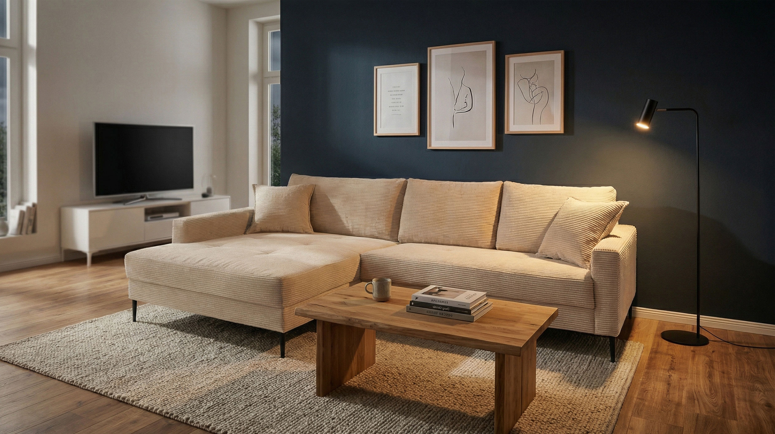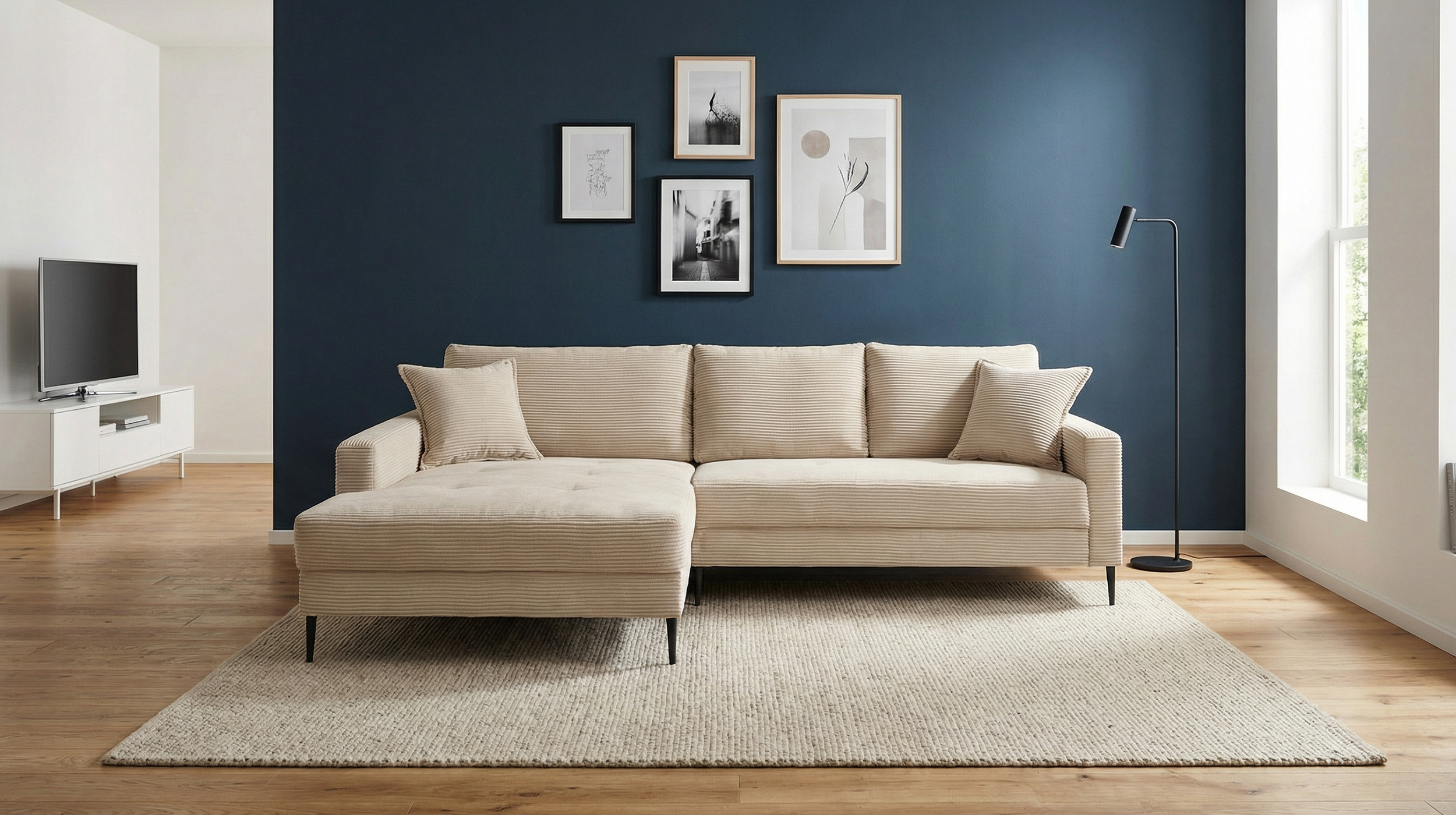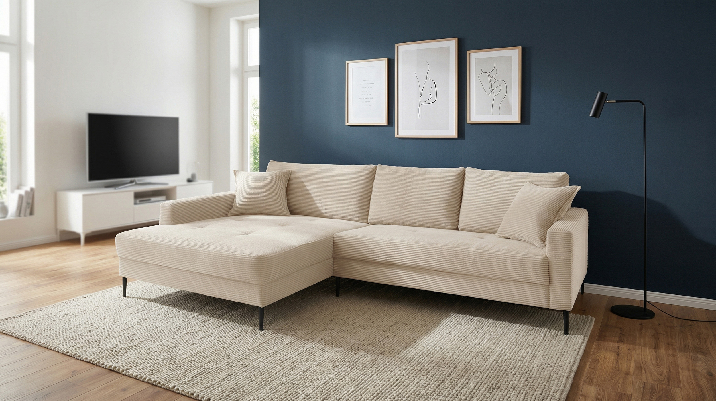 Unser Modell SUMMER bringt auch in der kalten Jahreszeit ein Stück Sommer in Ihren Wohnraum. Der weiche Cordbezug lädt durch eine angenehme Struktur zum Kuscheln ein und sorgt gleichzeitig für das gewisse Etwas. Die helle Farbgebung in Creme strahlt Freundlichkeit aus und kann wunderbar kombiniert werden. Egal ob als Fortführung eines minimalistischen Stils oder als Eyecatcher in einer bunten Einrichtung - das Ecksofa ergänzt Ihren Wohnstil mit seinem einzigartigen Charme. Als gekonnt gesetzter Kontrast fungieren die schwarzen Metallfüße. Da der Rücken echt bezogen wurde, genießen Sie alle Freiheiten in der Gestaltung Ihrer Räumlichkeiten.
