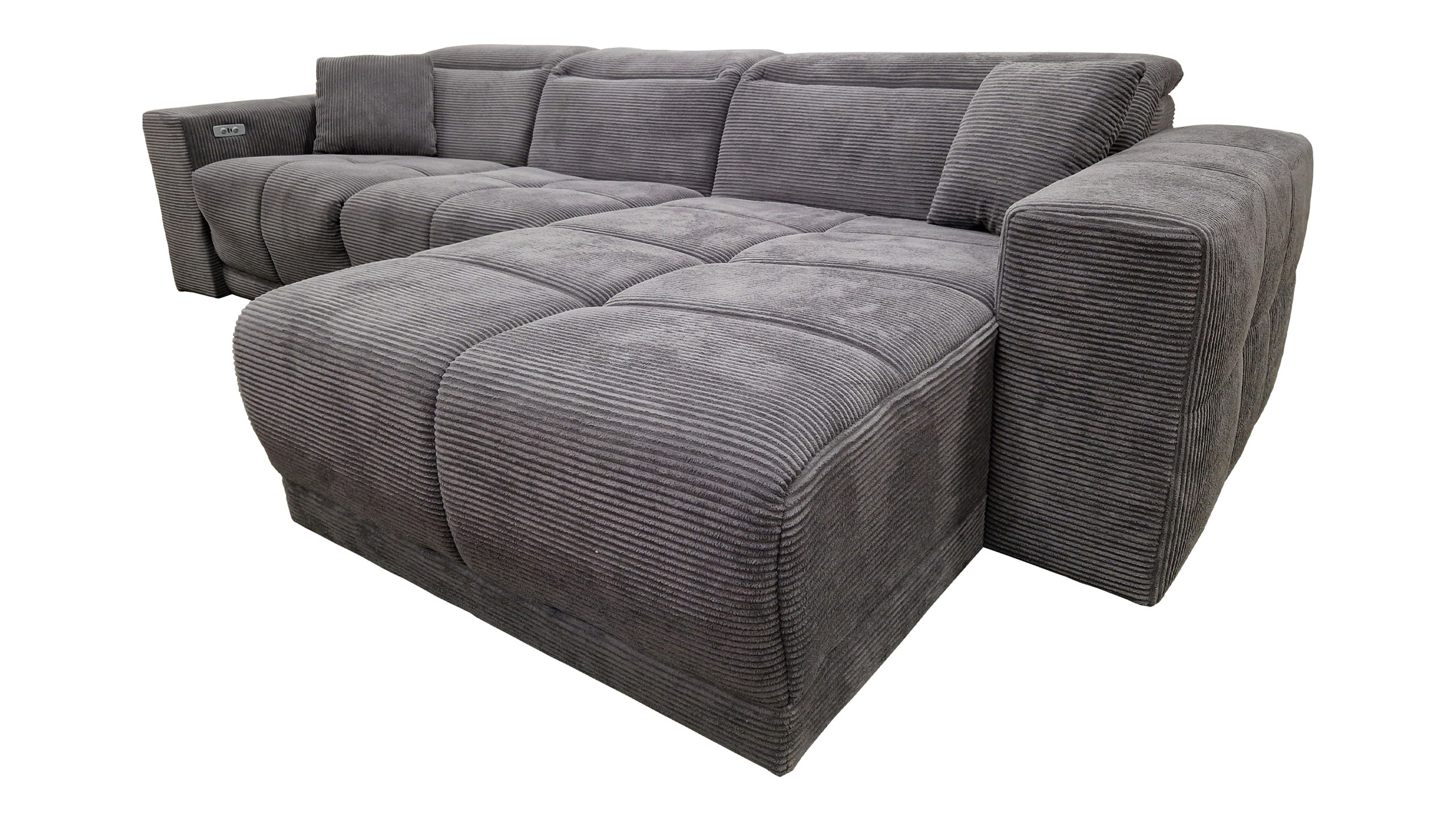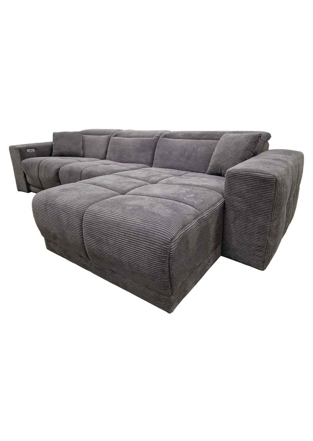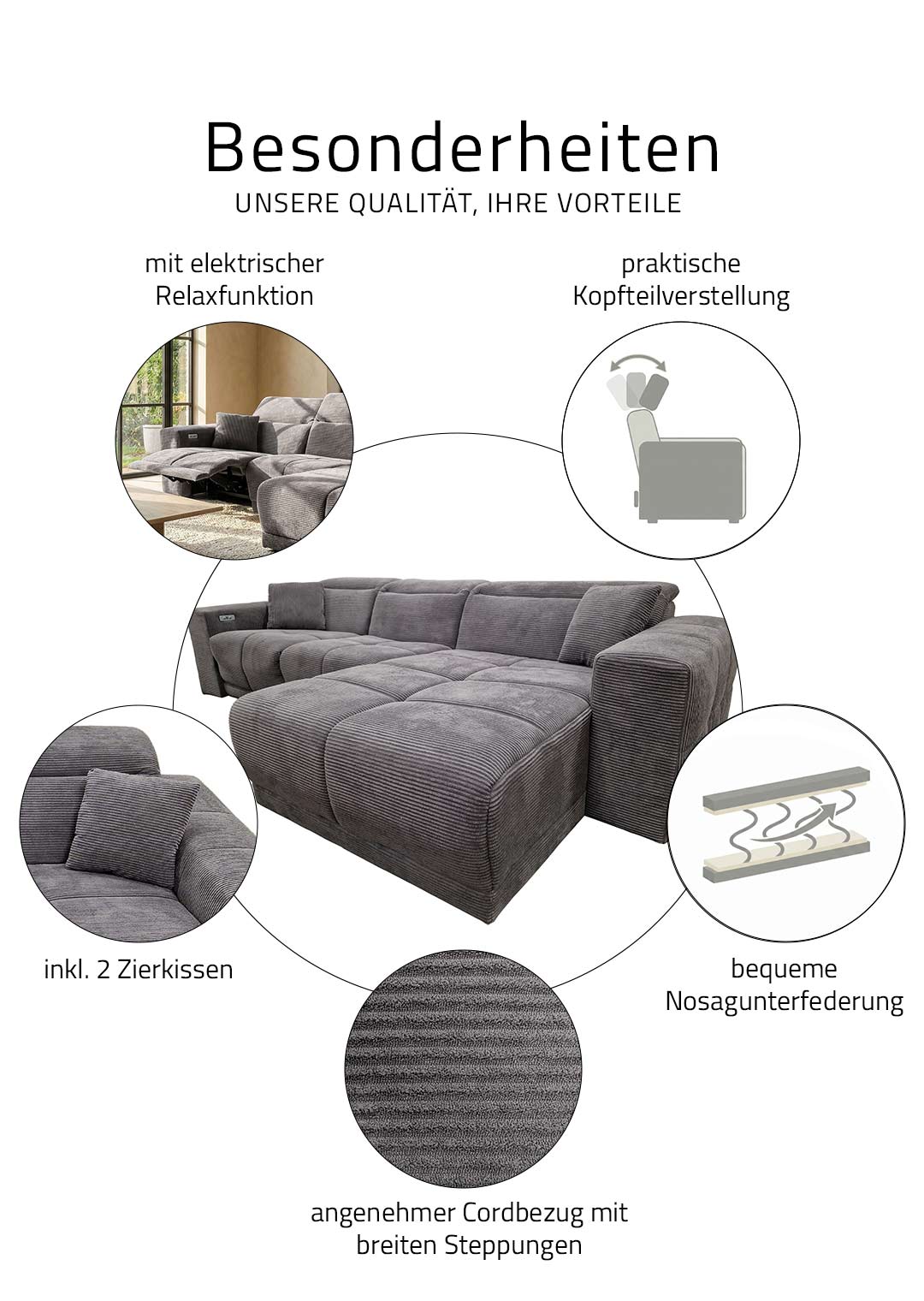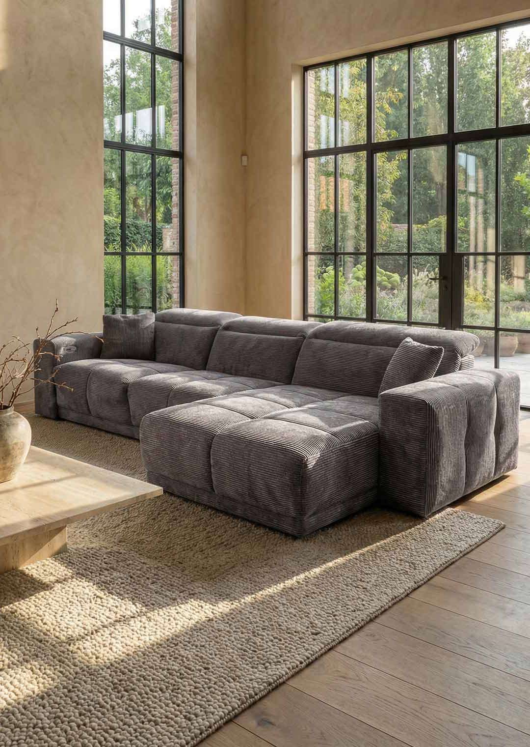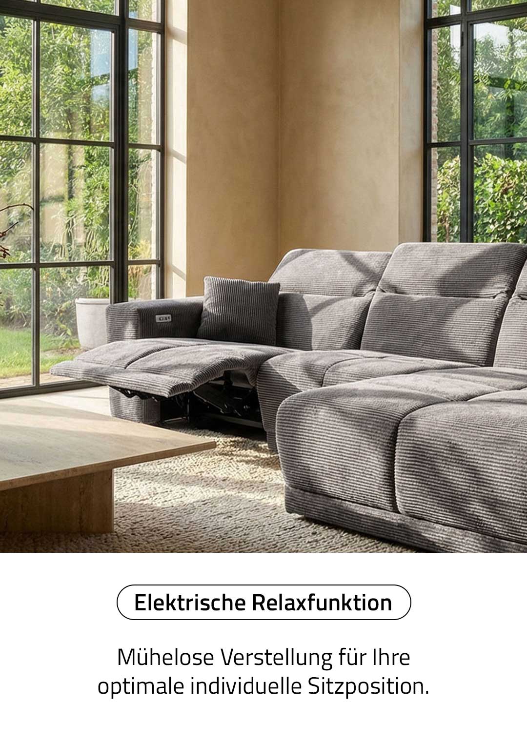 Das Sofa bietet mit einer Breite von ca. 302 cm richtig viel Platz für die ganze Familie, oder einfach zum gemütlichen Ausstrecken. Dabei lädt es nicht nur mit seinen großzügigen Maßen zum Relaxen ein. Ausgestattet mit einer elektrischen Relaxfunktion lässt sich der äußere 1-Sitzer per Knopfdruck in eine entspannende Position bringen. Lehnen Sie sich nach einem langen Tag mit einem guten Buch zurück und lassen Sie den Alltag einfach hinter sich. Die Kopfteile können dank Kopfteilverstellung individuell verstellt werden, sodass Sie immer in der perfekten Position sitzen. Den entsprechenden Sitzkomfort garantiert die Polsterung mit Nosagunterfederung. Bereits im Lieferumfang enthalten sind 2 Zierkissen , ebenfalls im dunkelgrauen Cordbezug, für noch mehr Gemütlichkeit.