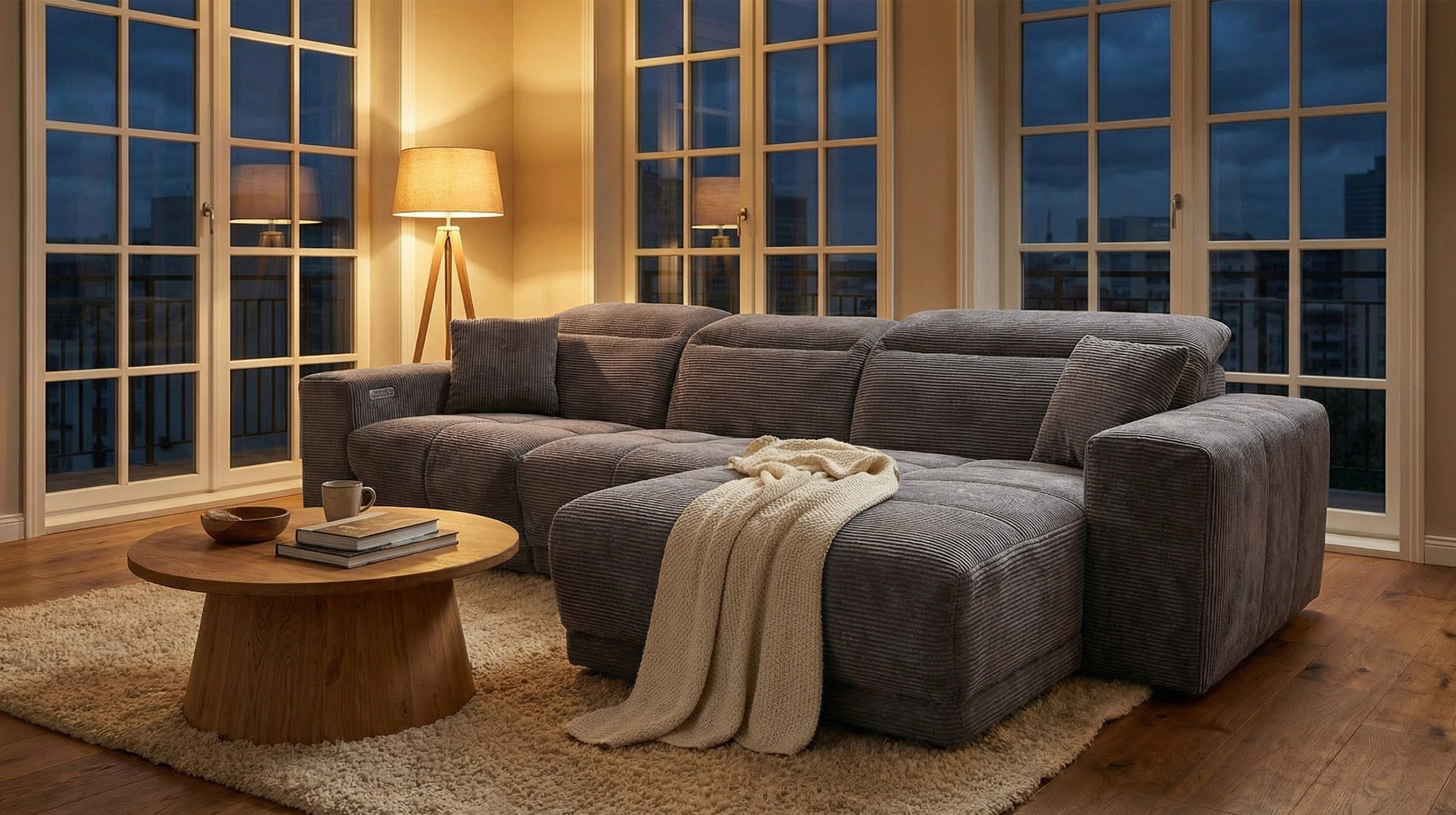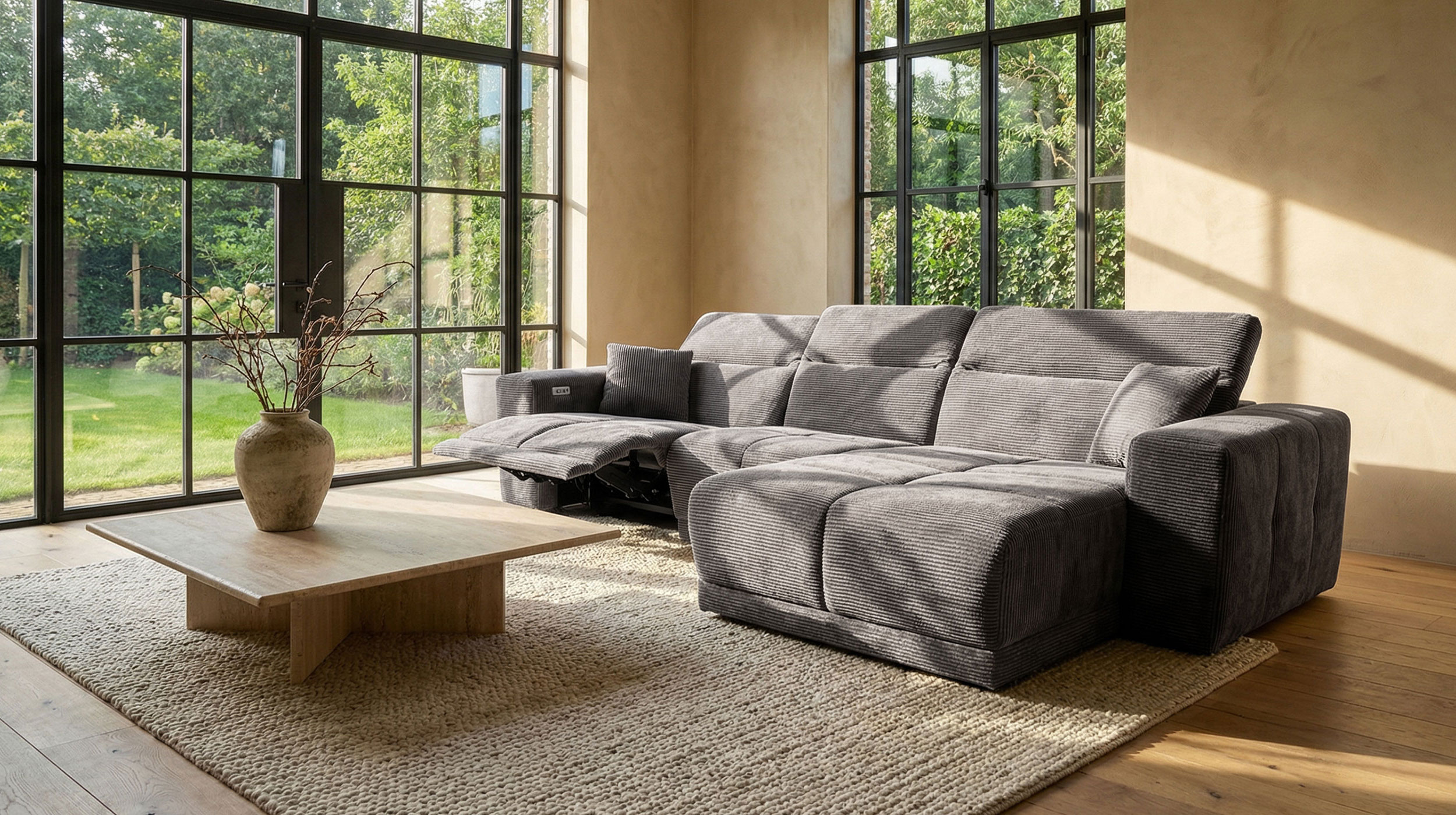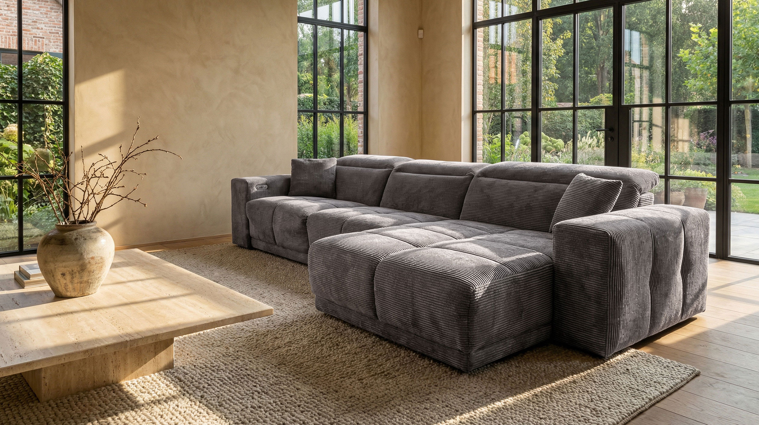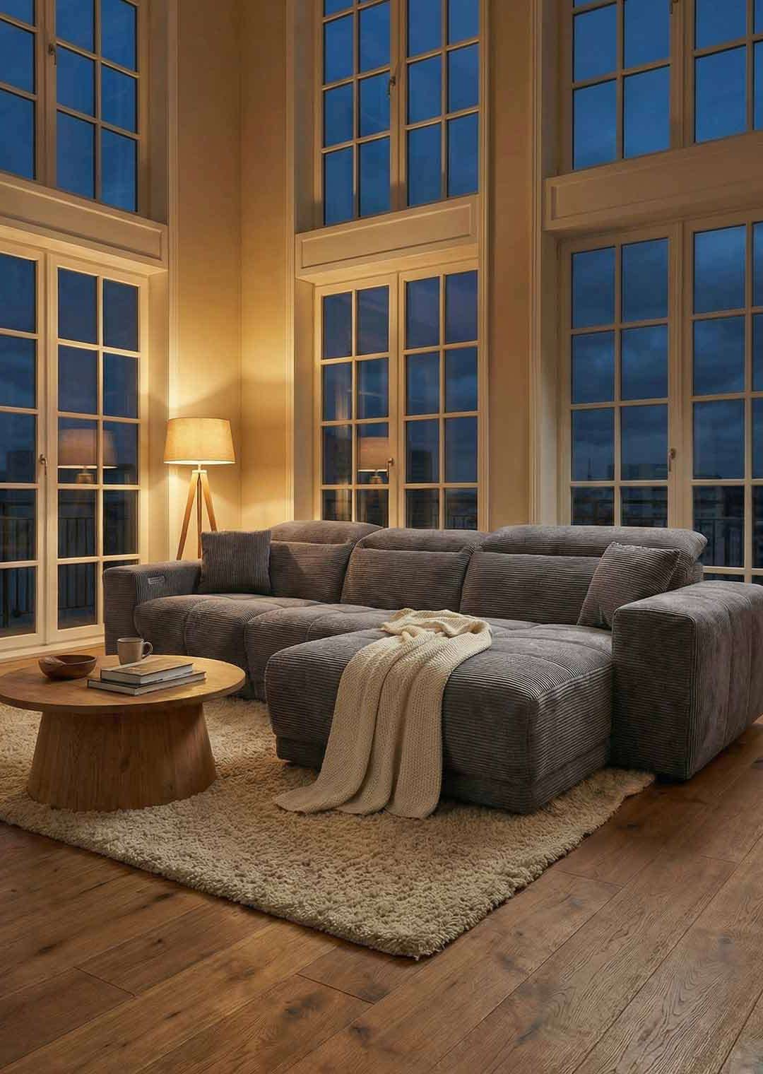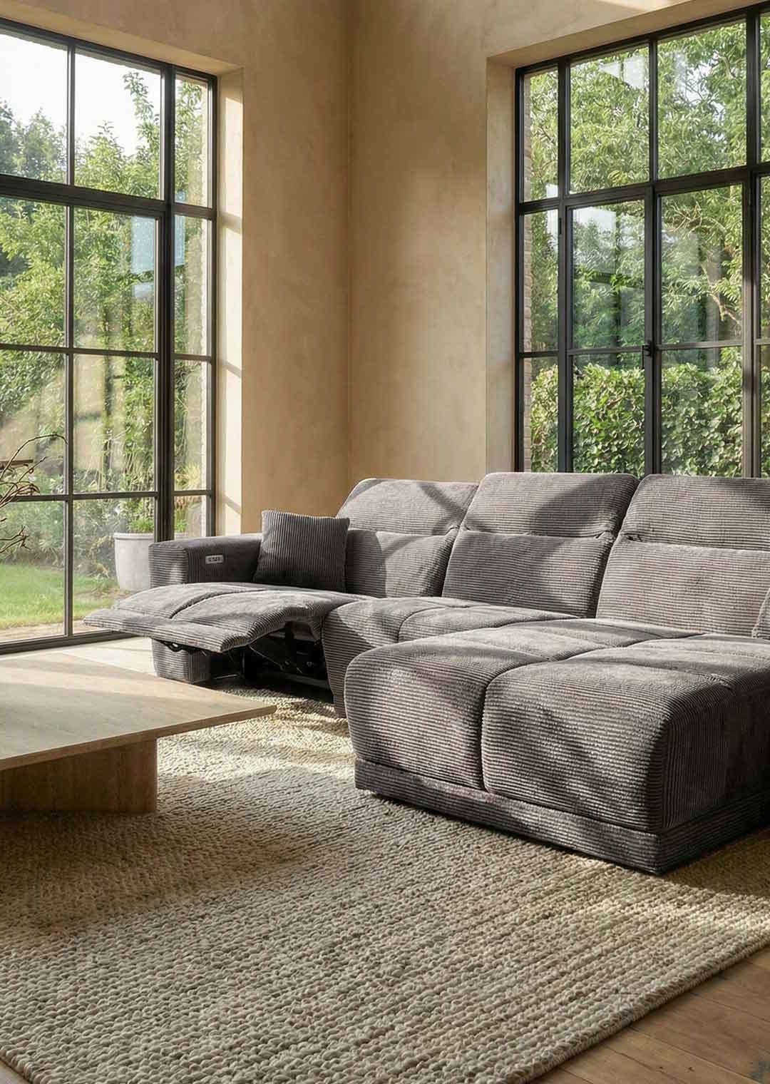 Das Sofa bietet mit einer Breite von ca. 302 cm richtig viel Platz für die ganze Familie, oder einfach zum gemütlichen Ausstrecken. Dabei lädt es nicht nur mit seinen großzügigen Maßen zum Relaxen ein. Ausgestattet mit einer elektrischen Relaxfunktion lässt sich der äußere 1-Sitzer per Knopfdruck in eine entspannende Position bringen. Lehnen Sie sich nach einem langen Tag mit einem guten Buch zurück und lassen Sie den Alltag einfach hinter sich. Die Kopfteile können dank Kopfteilverstellung individuell verstellt werden, sodass Sie immer in der perfekten Position sitzen. Den entsprechenden Sitzkomfort garantiert die Polsterung mit Nosagunterfederung. Bereits im Lieferumfang enthalten sind 2 Zierkissen , ebenfalls im dunkelgrauen Cordbezug, für noch mehr Gemütlichkeit.