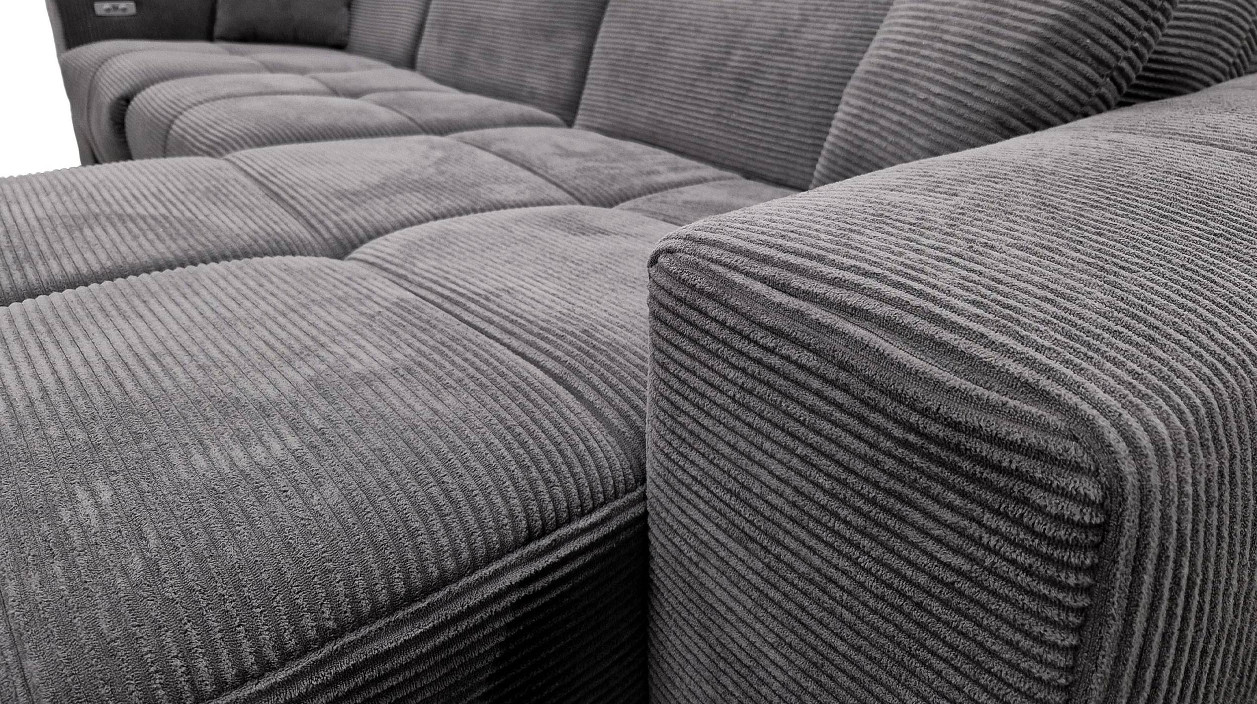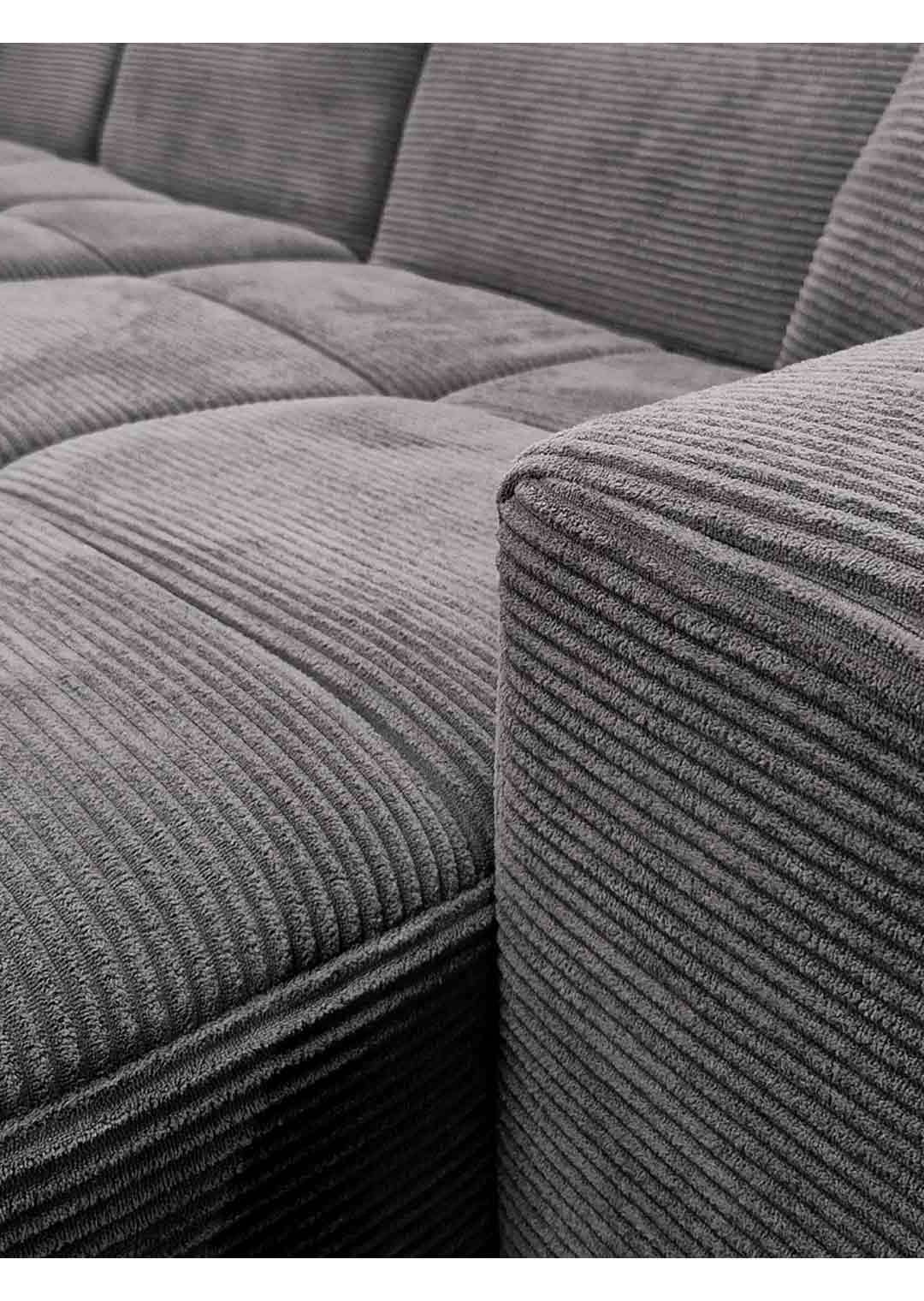 Das Ecksofa TONI wird dank seiner Funktionalitäten und seiner ansprechenden Optik im Handumdrehen zu Ihrem neuen Lieblingsplatz. Der trendige, feingerippte Cordbezug hat eine besonders weiche Haptik und strahlt eine einladende Gemütlichkeit aus. In einem dunklen Grau hat das Sofa dabei eine ganz besondere Präsenz im Raum, ohne jedoch aufdringlich zu sein. Die moderne Optik wird durch die großen Steppungen unterstrichen. Perfekt abgerundet wird das Design dieses Ecksofas durch die schwarzen Füße, die sich harmonisch in das Gesamtbild einfügen. Das Ecksofa TONI zieht garantiert alle Blicke auf sich. Der Rücken ist echt bezogen und ermöglicht es Ihnen, das Sofa auch frei im Raum zu platzieren - ideal für eine offene, individuelle Raumgestaltung.