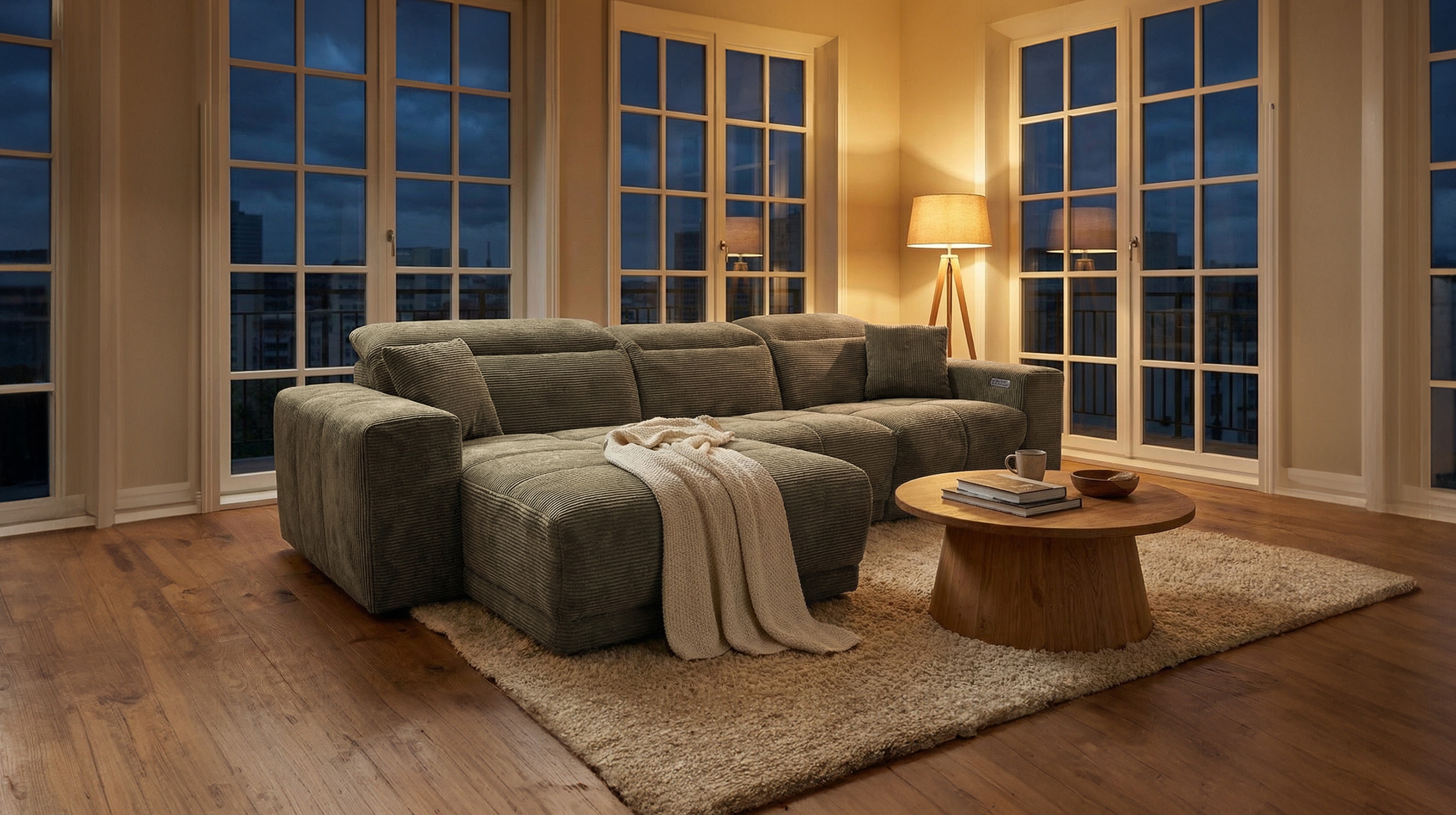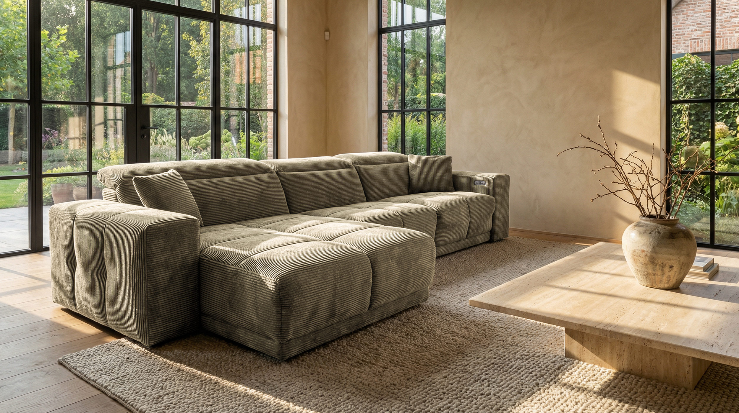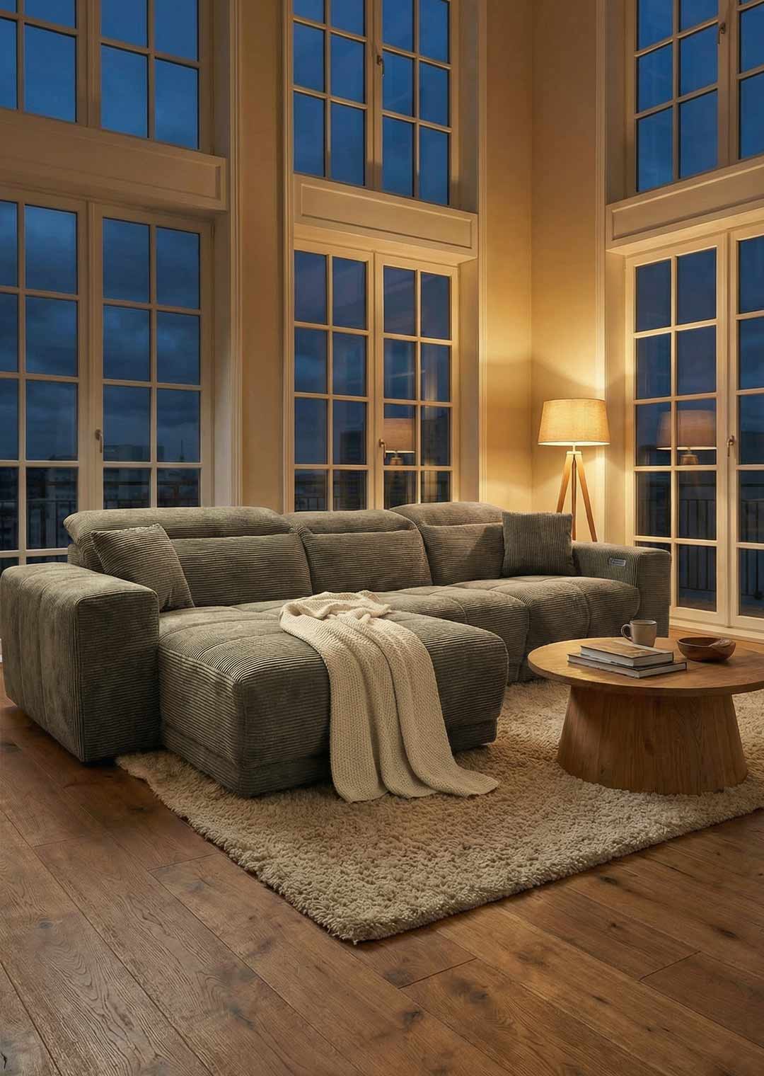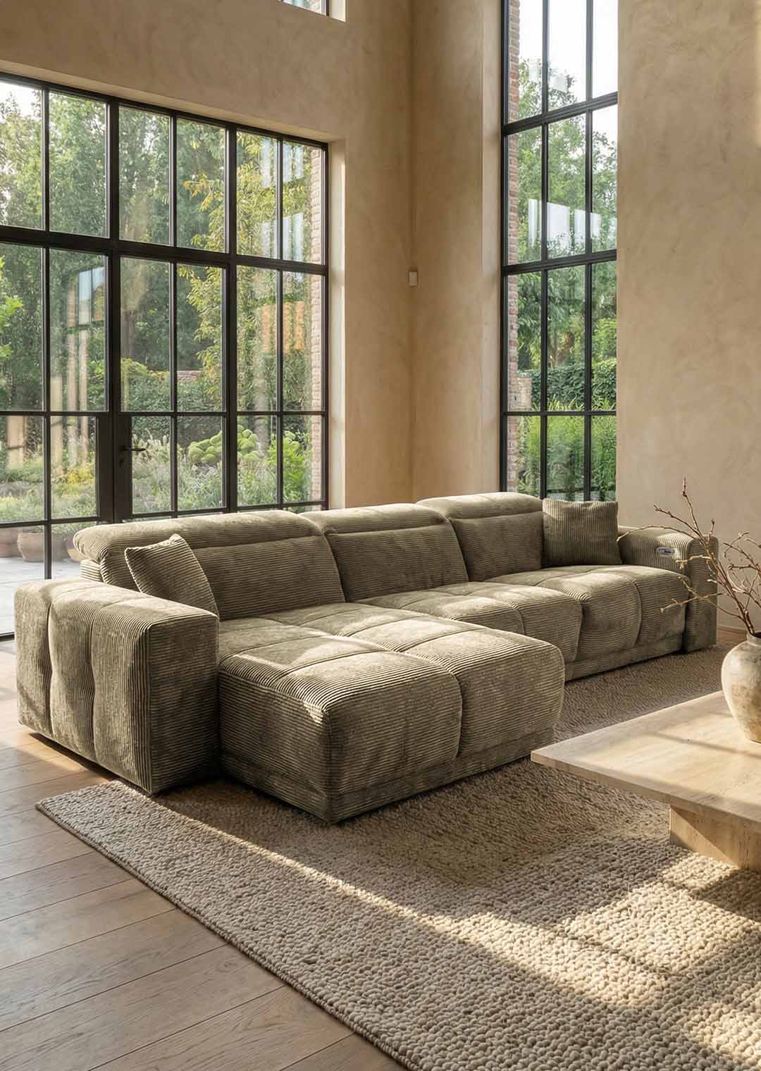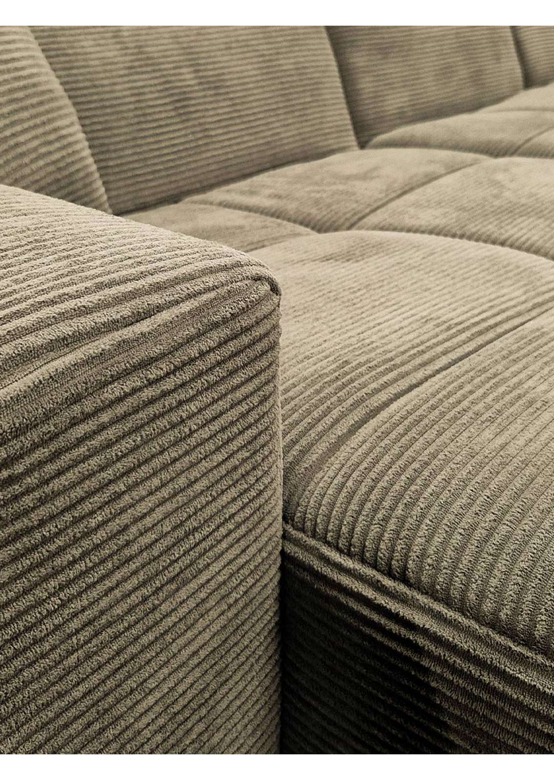 Das Ecksofa TONI wird dank seiner Funktionalitäten und seiner ansprechenden Optik im Handumdrehen zu Ihrem neuen Lieblingsplatz. Der trendige, feingerippte Cordbezug hat eine besonders weiche Haptik und strahlt eine einladende Gemütlichkeit aus. In einem natürlichen Grün hat das Sofa dabei eine ganz besondere Präsenz im Raum, ohne jedoch aufdringlich zu sein. Die moderne Optik wird durch die großen Steppungen unterstrichen. Perfekt abgerundet wird das Design dieses Ecksofas durch die schwarzen Füße, die sich harmonisch in das Gesamtbild einfügen. Das Ecksofa TONI zieht garantiert alle Blicke auf sich. Der Rücken ist echt bezogen und ermöglicht es Ihnen, das Sofa auch frei im Raum zu platzieren - ideal für eine offene, individuelle Raumgestaltung.