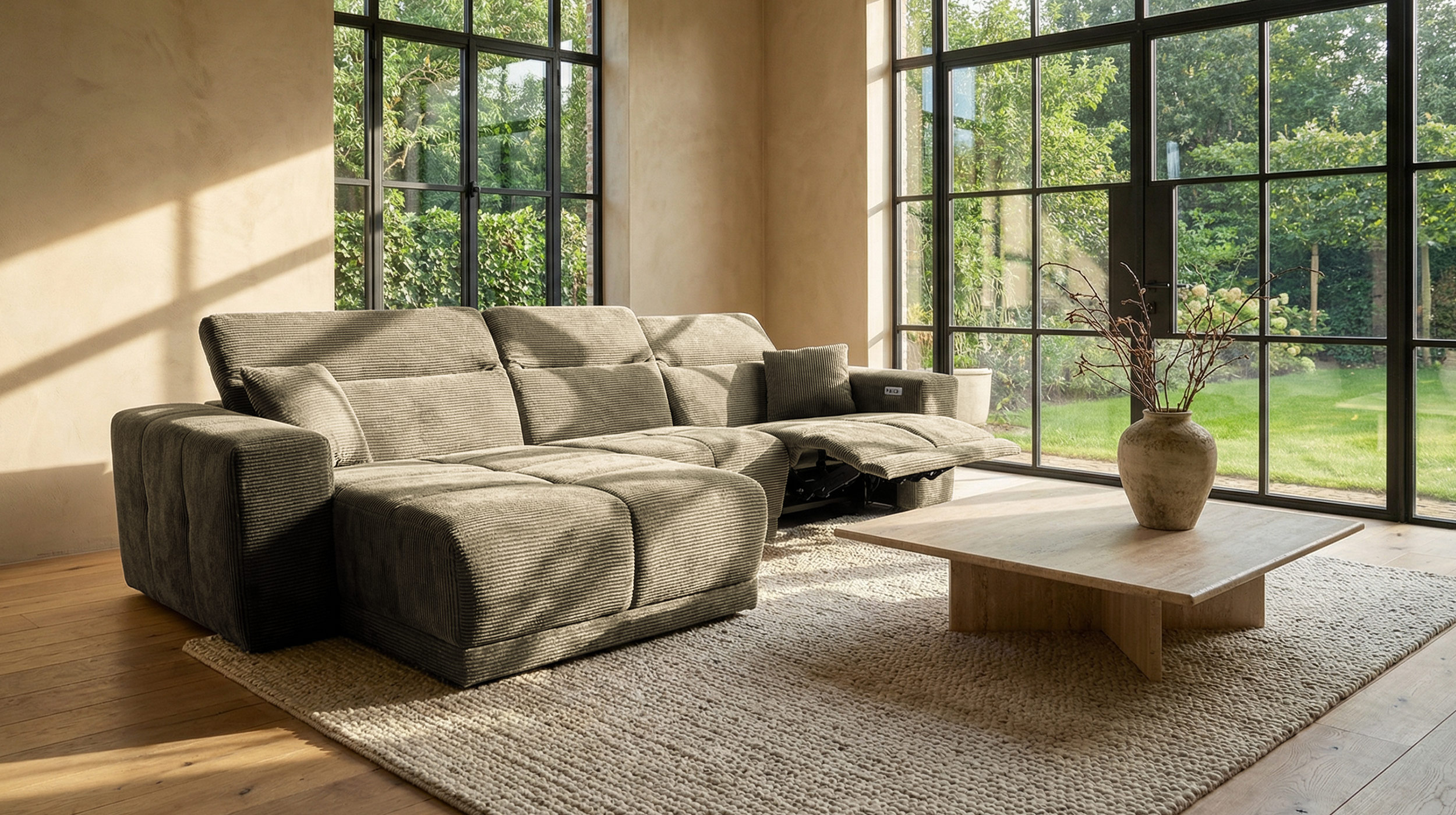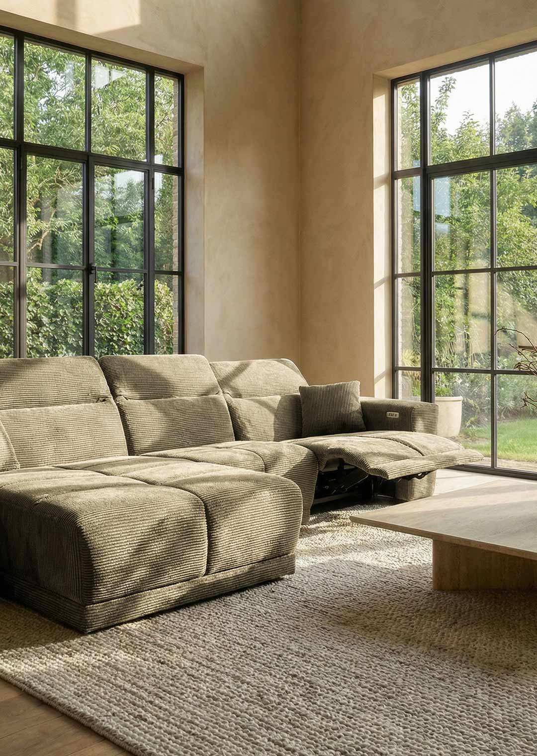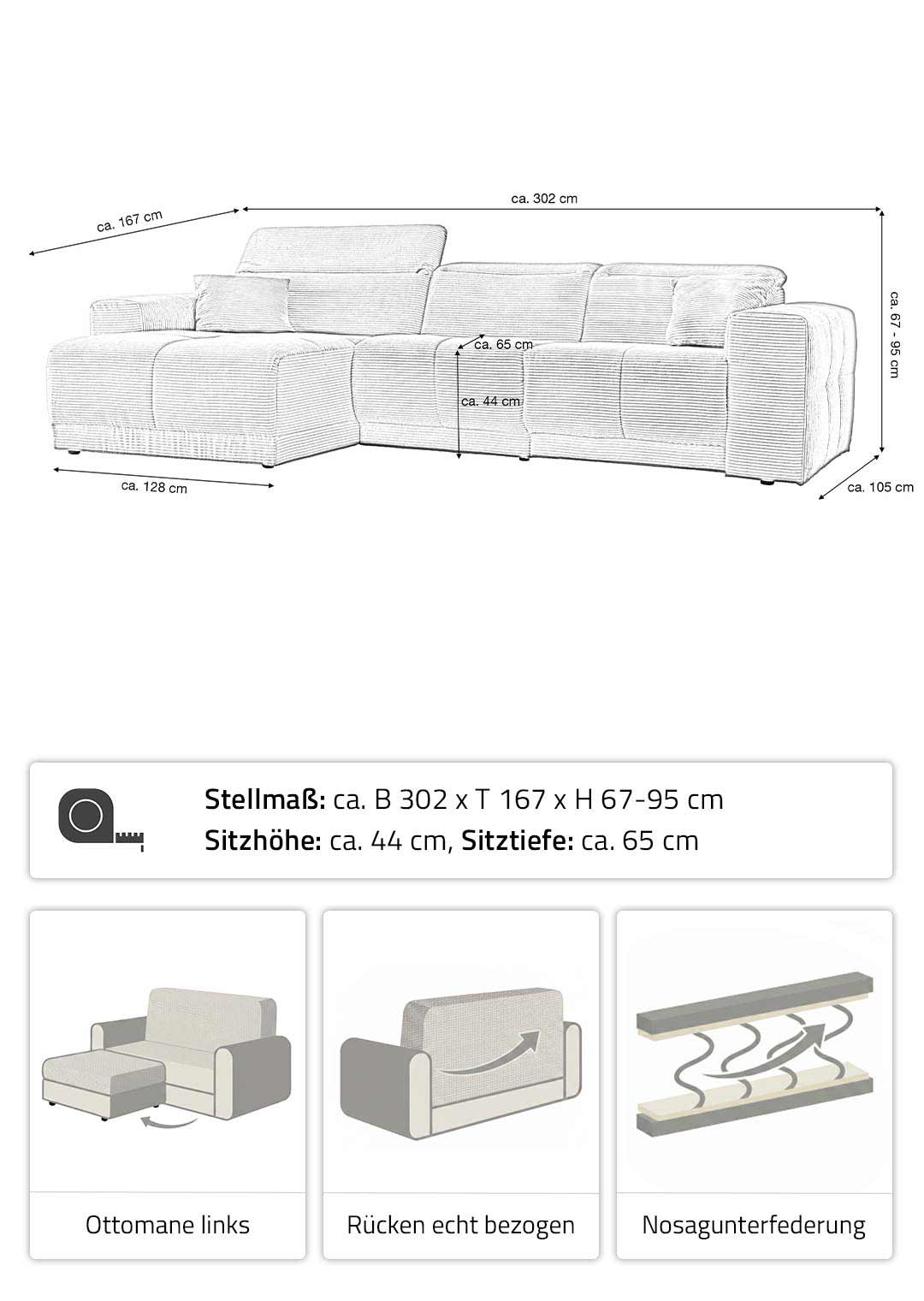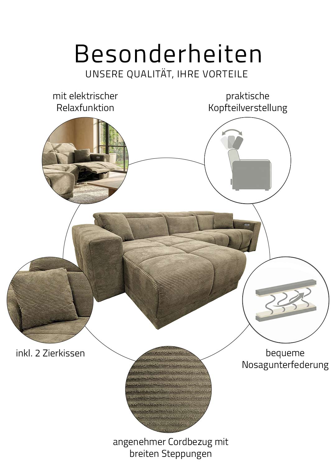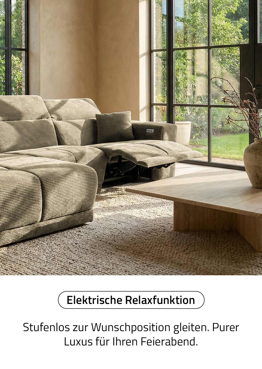 Das Sofa bietet mit einer Breite von ca. 302 cm richtig viel Platz für die ganze Familie, oder einfach zum gemütlichen Ausstrecken. Dabei lädt es nicht nur mit seinen großzügigen Maßen zum Relaxen ein. Ausgestattet mit einer elektrischen Relaxfunktion lässt sich der äußere 1-Sitzer per Knopfdruck in eine entspannende Position bringen. Lehnen Sie sich nach einem langen Tag mit einem guten Buch zurück und lassen Sie den Alltag einfach hinter sich. Die Kopfteile können dank Kopfteilverstellung individuell verstellt werden, sodass Sie immer in der perfekten Position sitzen. Den entsprechenden Sitzkomfort garantiert die Polsterung mit Nosagunterfederung. Bereits im Lieferumfang enthalten sind 2 Zierkissen , ebenfalls im dunkelgrauen Cordbezug, für noch mehr Gemütlichkeit.