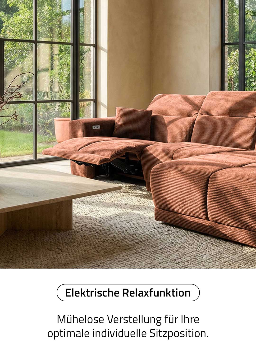 Das Sofa bietet mit einer Breite von ca. 302 cm richtig viel Platz für die ganze Familie, oder einfach zum gemütlichen Ausstrecken. Dabei lädt es nicht nur mit seinen großzügigen Maßen zum Relaxen ein. Ausgestattet mit einer elektrischen Relaxfunktion lässt sich der äußere 1-Sitzer per Knopfdruck in eine entspannende Position bringen. Lehnen Sie sich nach einem langen Tag mit einem guten Buch zurück und lassen Sie den Alltag einfach hinter sich. Die Kopfteile können dank Kopfteilverstellung individuell verstellt werden, sodass Sie immer in der perfekten Position sitzen. Den entsprechenden Sitzkomfort garantiert die Polsterung mit Nosagunterfederung. Bereits im Lieferumfang enthalten sind 2 Zierkissen , ebenfalls im dunkelgrauen Cordbezug, für noch mehr Gemütlichkeit.