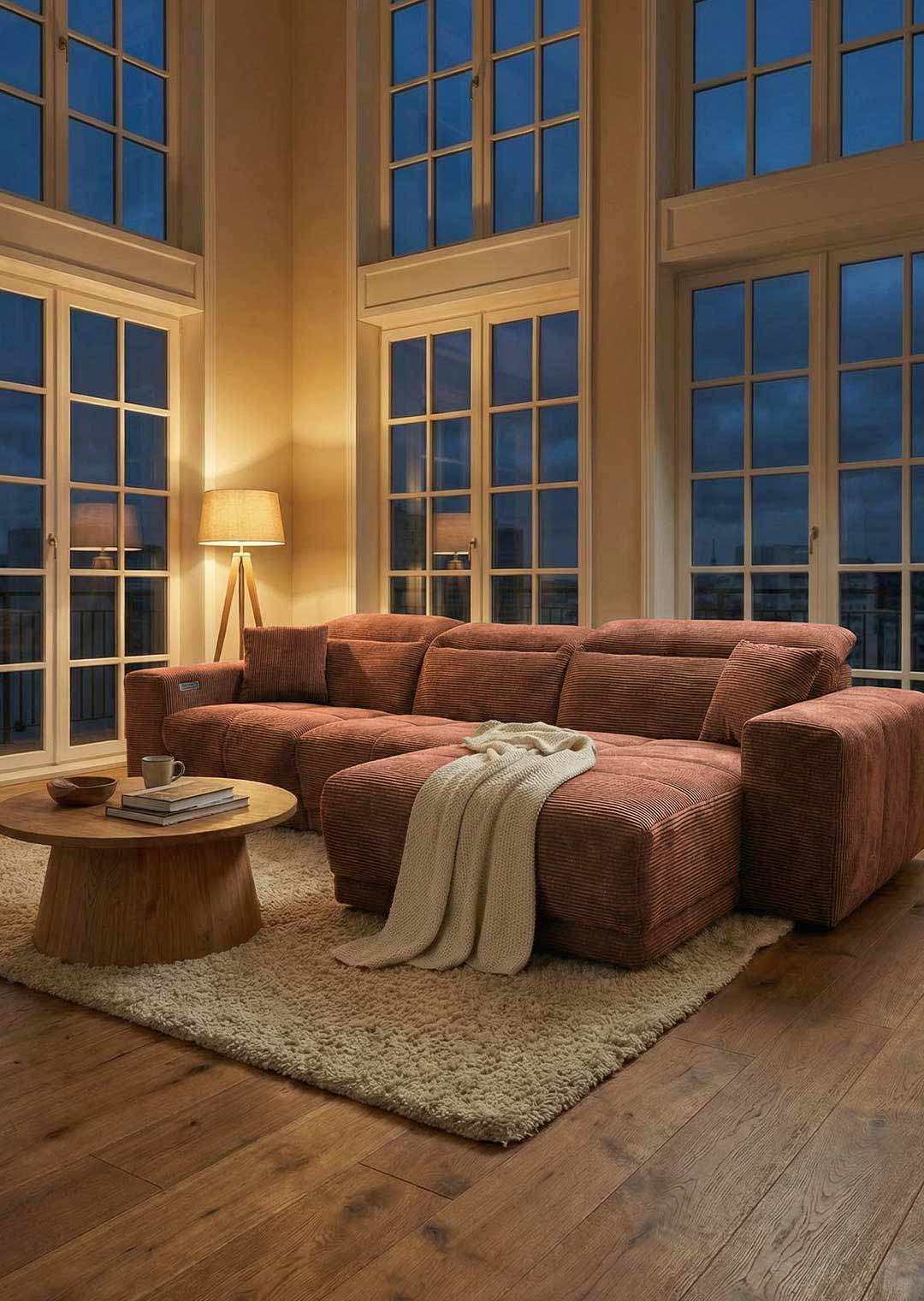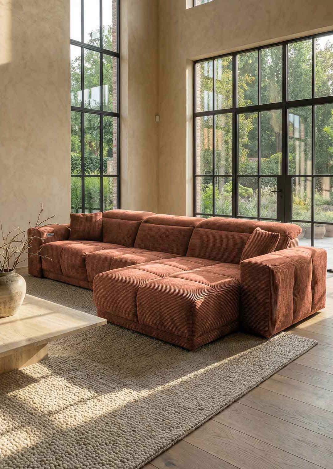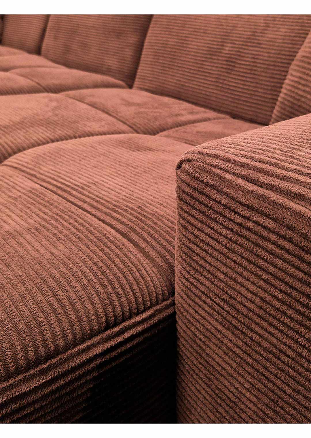 Das Ecksofa TONI wird dank seiner Funktionalitäten und seiner ansprechenden Optik im Handumdrehen zu Ihrem neuen Lieblingsplatz. Der trendige, feingerippte Cordbezug hat eine besonders weiche Haptik und strahlt eine einladende Gemütlichkeit aus. In einem imposanten Rost hat das Sofa dabei eine ganz besondere Präsenz im Raum, ohne jedoch aufdringlich zu sein. Die moderne Optik wird durch die großen Steppungen unterstrichen. Perfekt abgerundet wird das Design dieses Ecksofas durch die schwarzen Füße, die sich harmonisch in das Gesamtbild einfügen. Das Ecksofa TONI zieht garantiert alle Blicke auf sich. Der Rücken ist echt bezogen und ermöglicht es Ihnen, das Sofa auch frei im Raum zu platzieren - ideal für eine offene, individuelle Raumgestaltung.