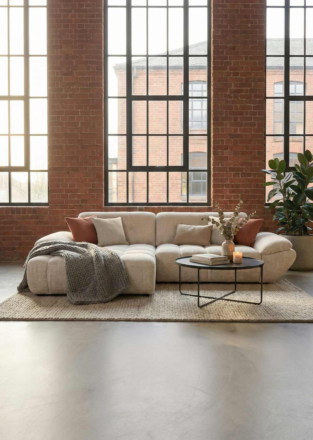 Unser Ecksofa HUGO präsentiert sich als neues Highlight für jedes moderne Wohnzimmer und verbindet stilbewusstes Design mit maximaler Gemütlichkeit. Ausgestattet mit einem Stoffbezug in trendiger Bouclé-Optik in elegantem Creme, entsteht ein Look, der sowohl wohnlich als auch ausgesprochen zeitgemäß wirkt. Die weiche Struktur des Bouclé-Stoffes sorgt für eine angenehme Haptik und verleiht dem Sofa eine warme, einladende Ausstrahlung - perfekt für entspannte Stunden zu Hause. Klare Linien, großzügige Polsterflächen und ein harmonischer Farbton ergeben eine Kombination, die in vielen Einrichtungsstilen wunderbar funktioniert. Modern eingerichtete Lofts profitieren genauso vom Design wie klassische Wohnräume, die einen frischen, aktuellen Akzent erhalten sollen.