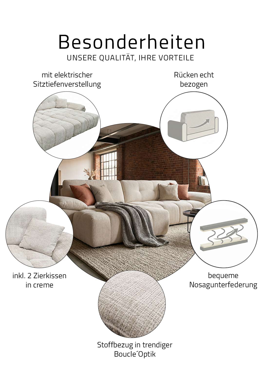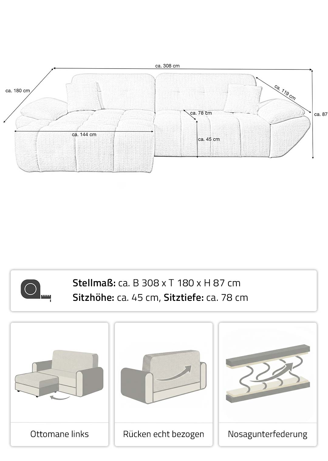 | Bestandteile | 1 x Ottomane mit Armlehne links, 1 x 2-Sitzer mit Armlehne (inkl. elektrische Sitztiefenverstellung), 2 Zierkissen, schwarze Füße |