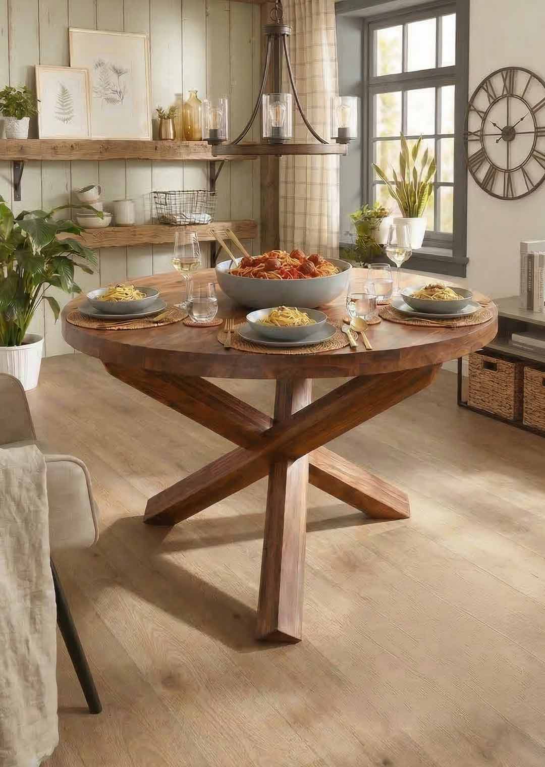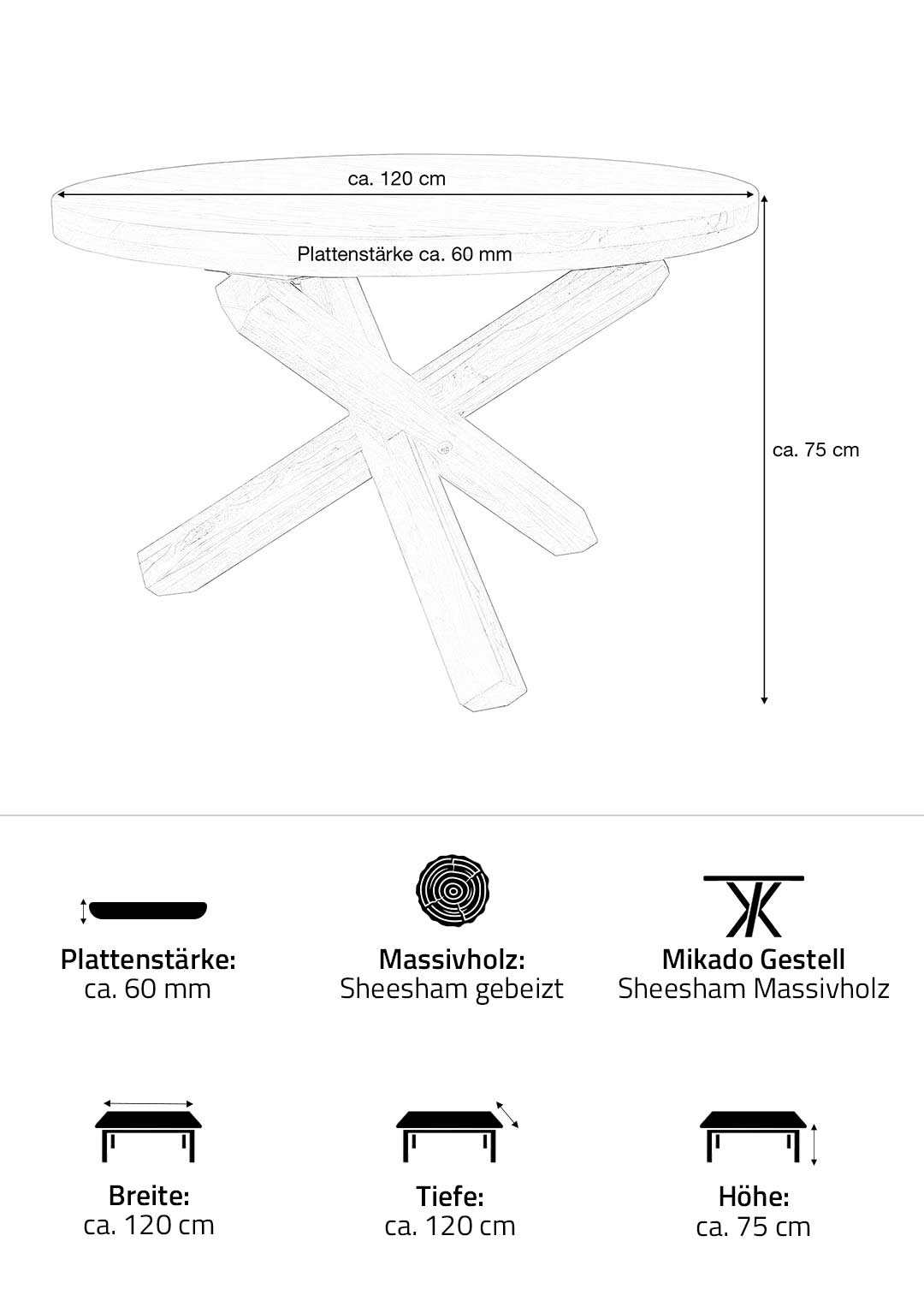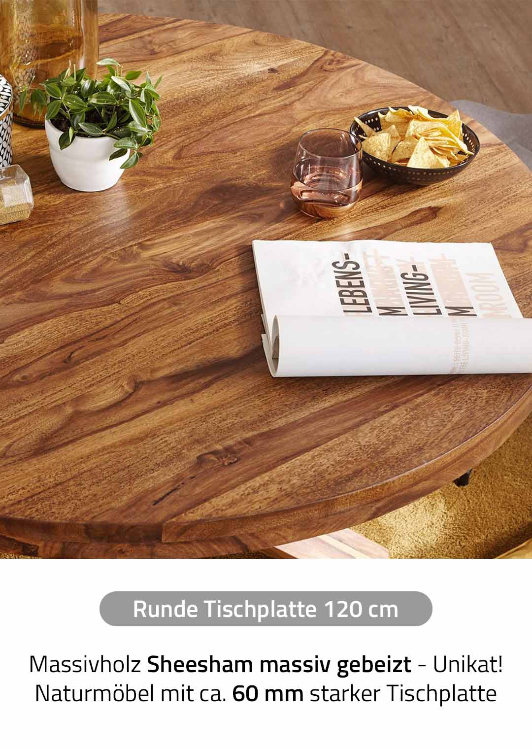 Mit seinem Durchmesser von ca. 120 cm schafft der Esstisch einen kompakten und dennoch einladenden Mittelpunkt, an dem man gerne zusammenkommt, ob beim Frühstück in kleiner Runde oder beim langen Abendessen mit Freunden. Die ca. 60 mm starke Platte vermittelt spürbare Wertigkeit und Beständigkeit. So entsteht ein hochwertiger Esstisch, der Ihnen viele schöne Stunden im Kreise Ihrer Liebsten bereiten wird. Sheesham Holz: Das Sheeshamholz zeigt eine charaktervolle Maserung mit abwechslungsreichen Farbtönen, die jedem Exemplar seine individuelle Note verleihen. Durch die Beize wird die natürliche Holzstruktur betont, während die Oberfläche ihren warmen, authentischen Charakter behält. Sheesham punktet durch seine natürliche Härte und Langlebigkeit, wodurch der Tisch ideal für den täglichen Gebrauch geeignet ist. Da es sich um ein reines Naturprodukt handelt, ist jeder Esstisch ein Unikat: Astlöcher, feine Risse, natürliche Fugen, Farbnuancen oder leichte Unebenheiten sind keine Mängel, sondern typische Merkmale von Echtholz, die den authentischen Charakter und die Einzigartigkeit jedes Exemplars unterstreichen. Bestellen Sie Ihren neuen Esstisch jetzt bequem online und holen Sie sich ein echtes Unikat nach Hause!| Produktdetails: | |