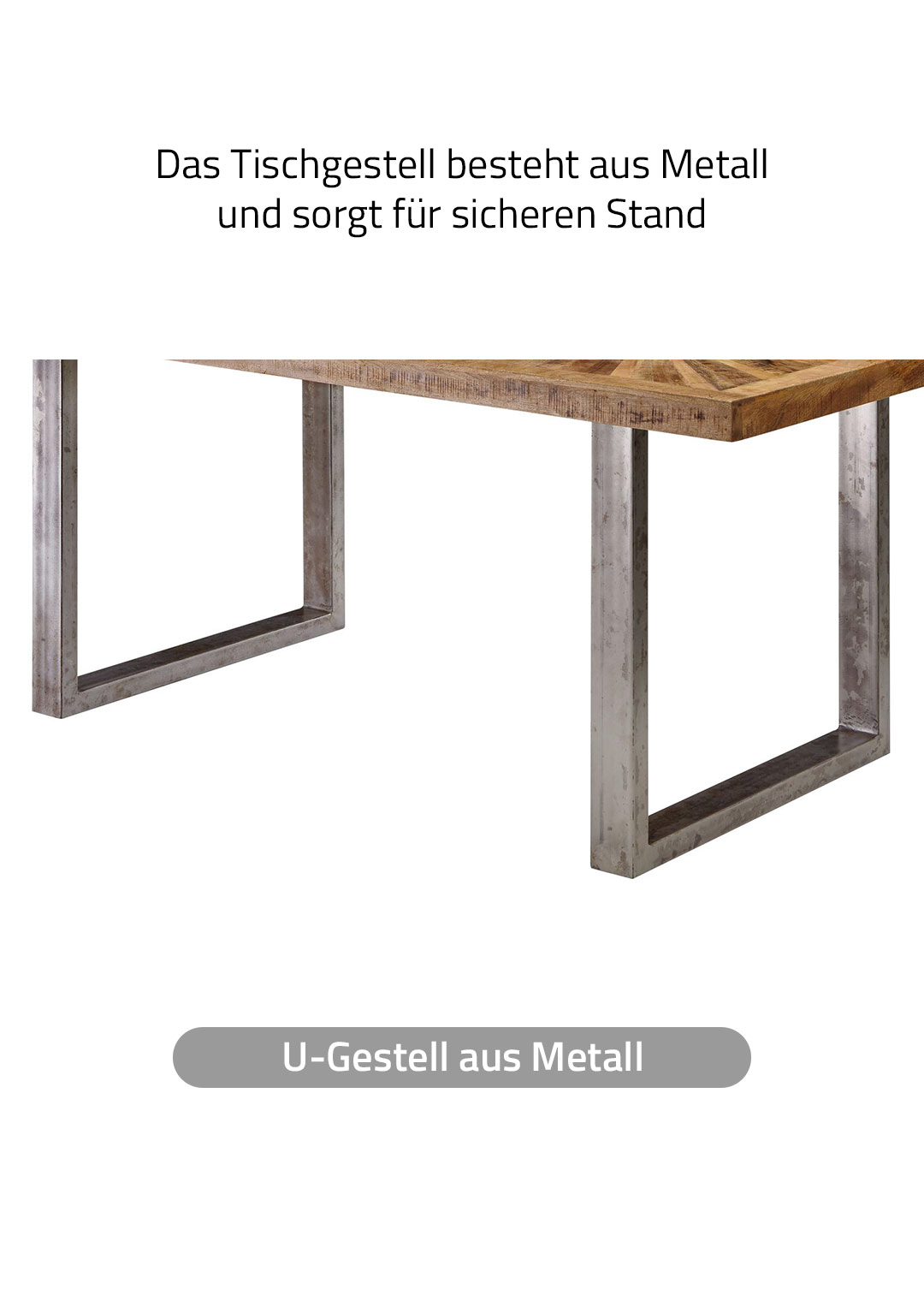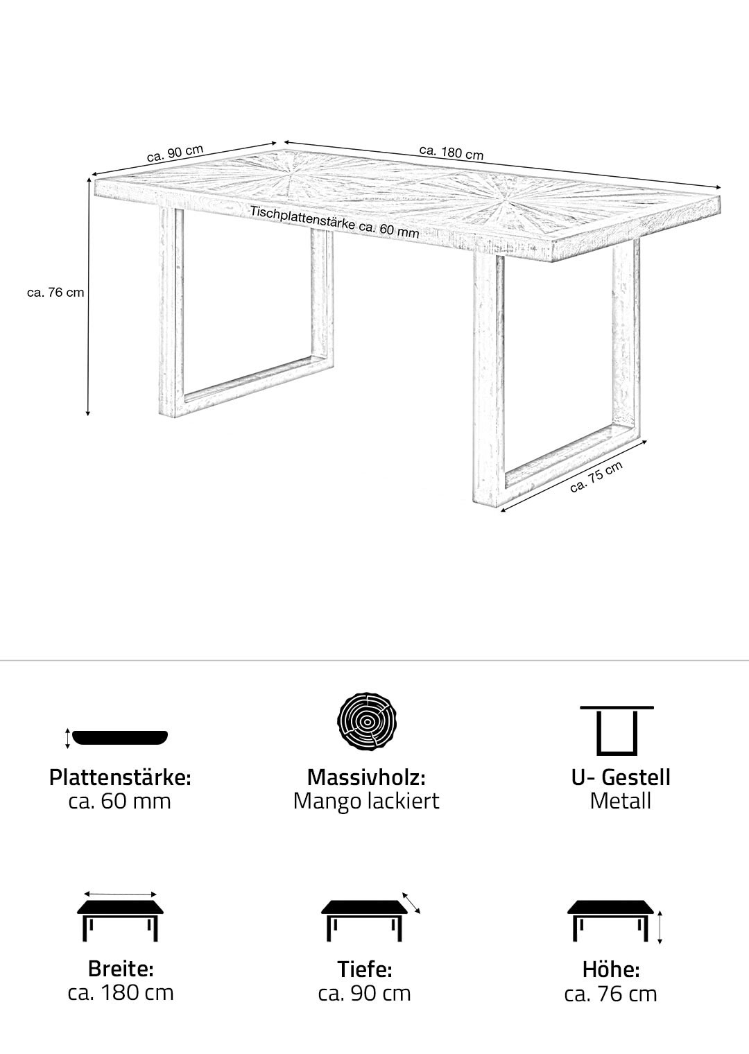 Der Esstisch MARETH besticht durch seine ausdrucksstarke Tischplatte aus massivem Mango-Holz. Die aufwendig gearbeitete Oberfläche mit dekorativem Sternmuster verleiht dem Tisch eine besondere, lebendige Optik und bringt die natürliche Maserung des Holzes perfekt zur Geltung. Ein harmonischer Kontrast entsteht durch die Kombination mit dem U-Gestell aus Metall, welcher sich in viele Wohnstile einfügen lässt - von modern über industriell bis hin zu rustikal.