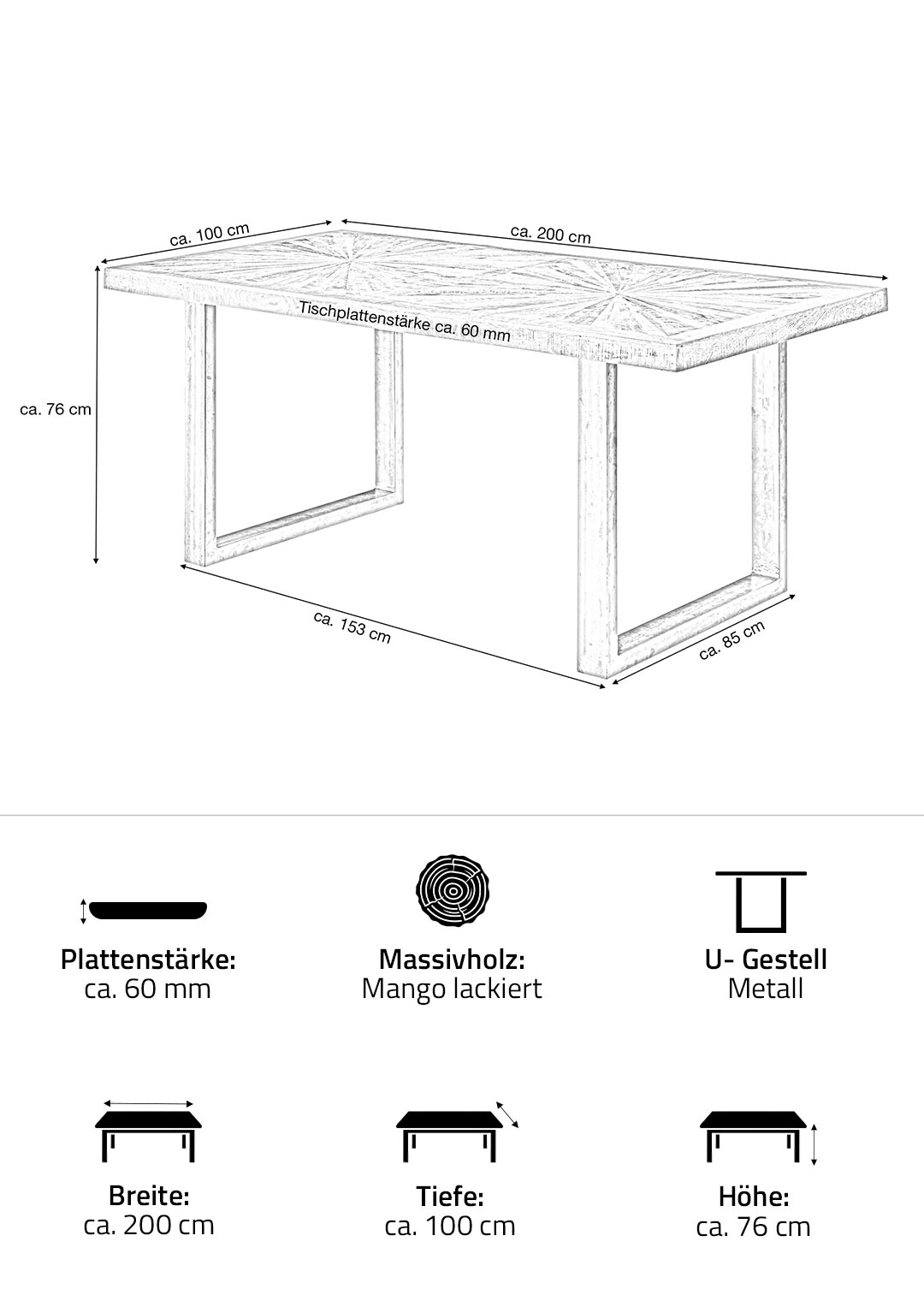 | Bestandteile | 1 Tischplatte Mango Massivholz, 2 U-Gestelle aus Metall |